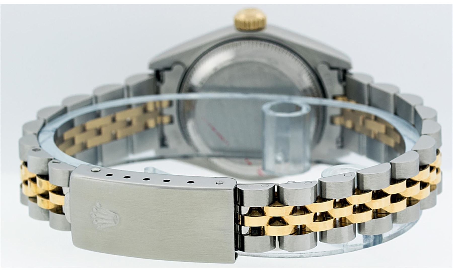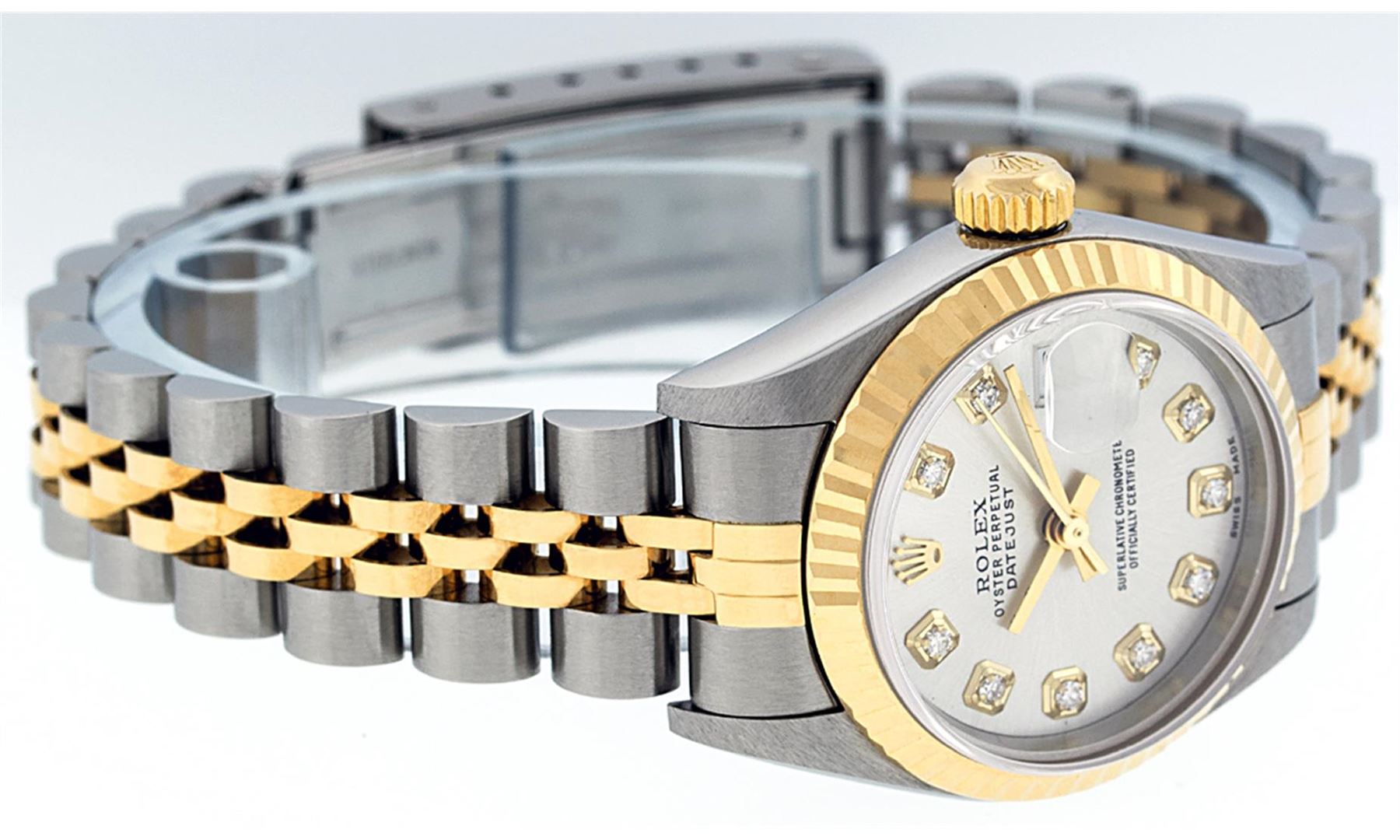 One Ladies 18K Two Tone Rolex Datejust Polished, Serviced & Electronically Tested, 18K Yellow Gold & Stainless Steel, Case Size: 26mm, 18K Yellow Gold Crown, Bezel: 18K Yellow Gold Fluted Bezel. Custom Crystal: New Acrylic Cyclops Lens. Custom Hands: New Luminescent Hands. Movement: Automatic Winding Movement Caliber 2235. Custom Dial: Silver Diamond Dial, Diamond Count: 10 Diamonds In Dial, Color: G To H, Clarity VS2. Date Window: 3 O'Clock Position Date Display, Model: Datejust. Condition: G-6 Extra Fine. Bracelet: Two Tone 18K Yellow Gold & Stainless Steel Jubilee. Bright Polish. 6.0 Inch Length, Adjustable. Standard Clasp, With Rolex Logo. This Watch Has Been Serviced Time Tested And Is In Excellent Condition It Is Free Of All Scratches And Dents.