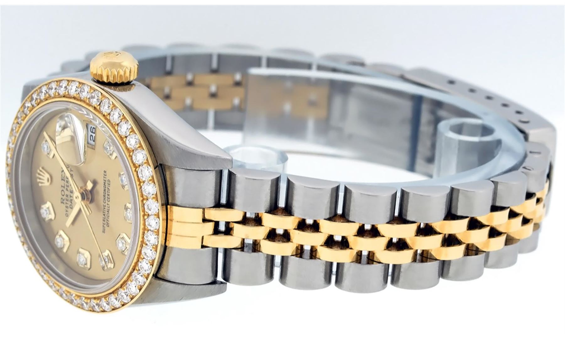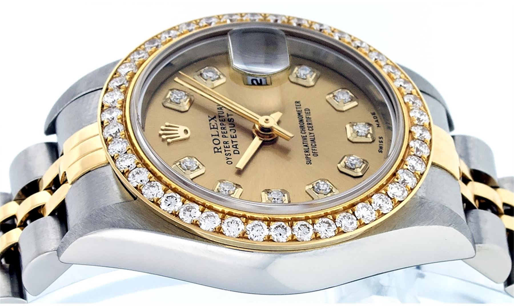 One Ladies Quickset 18K Two Tone Rolex Datejust Polished, Serviced & Electronically Tested, 18K Yellow Gold & Stainless Steel Case: 26mm, 18K Yellow Gold Crown, Custom Bezel: New 18K Yellow Gold Beadset Diamond Bezel, Diamond Count: 42 Diamonds in dial, Total Weight 1.00 Carat, Clarity: SI-VS, Color: G to H. Custom Crystal: New Synthetic Sapphire Cyclops Lens. Custom Hands: New Luminescent Hands. Movement: Automatic Winding Movement Caliber 2235. Custom Dial: Champagne Single Cut Diamond Dial, Stone Count: 10 Diamonds, Clarity: VS2, Color: G to H. Date Window: 3 O'Clock Position Date Display, Model: Datejust. Condition: G-6 Extra Fine. Bracelet: Two Tone 18K Yellow Gold & Stainless Steel Jubilee Band. Bright Polish. 6.0 Inch Length, Adjustable. Standard Clasp, With Rolex Logo. This Watch Has Been Serviced Time Tested And Is In Excellent Condition It Is Free Of All Scratches And Dents.