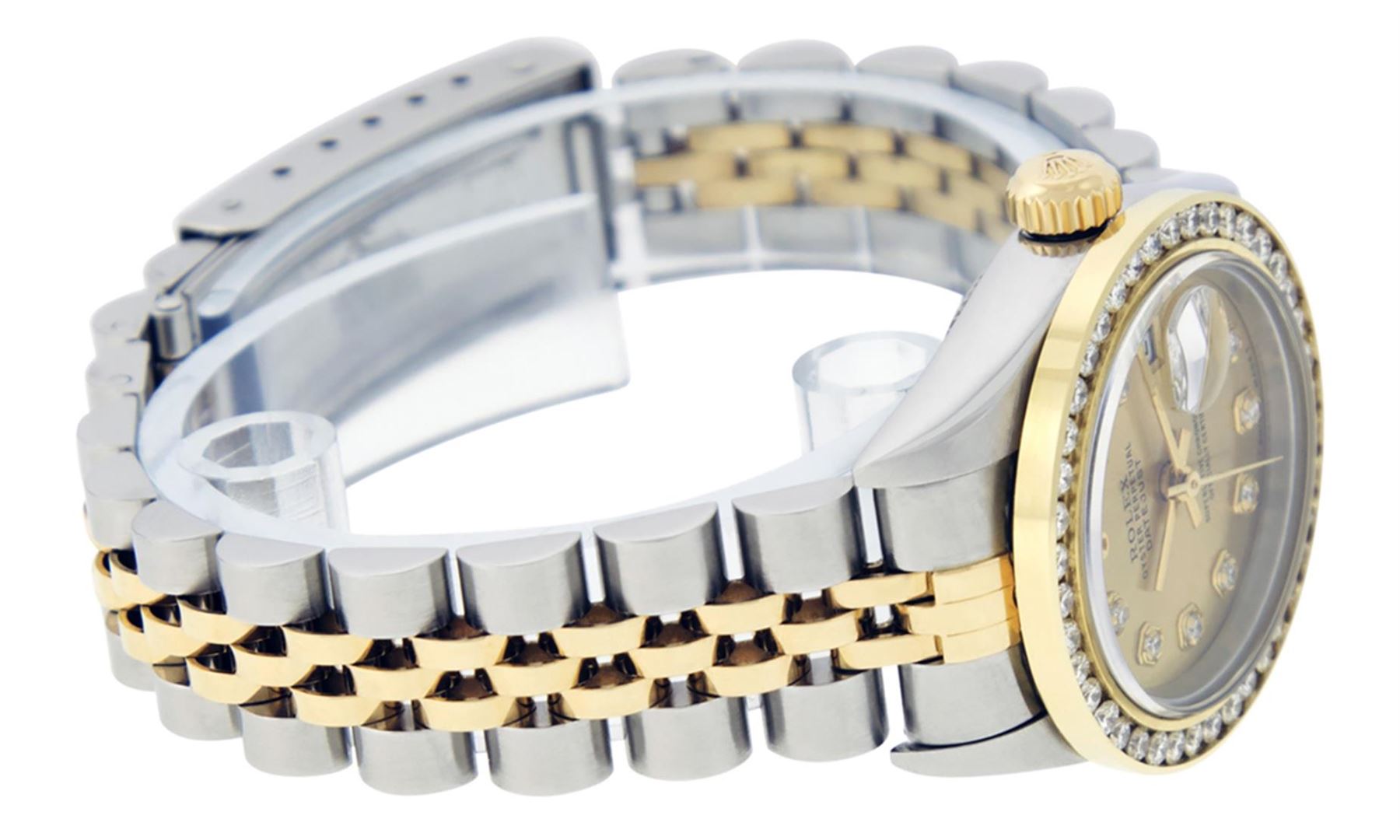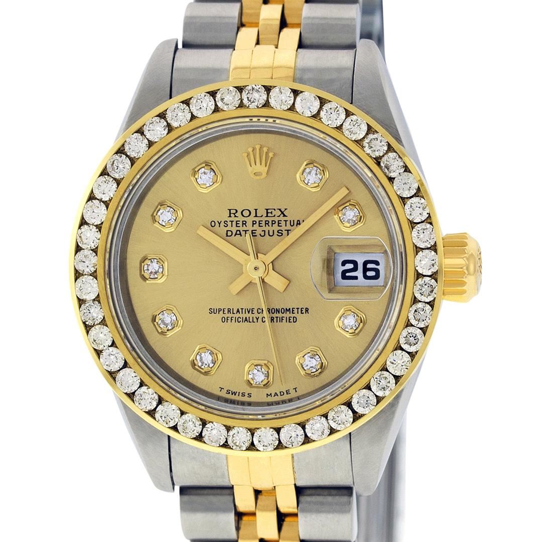 One Ladies 18K Two Tone Rolex Datejust Polished, Serviced & Electronically Tested, 18K Yellow Gold & Stainless Steel Case: 26mm, 18K Yellow Gold Crown, Custom Bezel: New 18K Yellow Gold Channel Set Diamond Bezel, Diamond Count: 44 Diamonds in dial, Total Weight 1.00 Carat, Clarity: SI-VS, Color: G to H. Custom Crystal: New Synthetic Sapphire Cyclops Lens. Custom Hands: New Luminescent Hands. Movement: Automatic Winding Movement Caliber 2235. Custom Dial: Champagne Single Cut Diamond Dial, Stone Count: 10 Diamonds, Clarity: VS2, Color: G to H. Date Window: 3 O'Clock Position Date Display, Model: Datejust. Condition: G-6 Extra Fine. Bracelet: Two Tone 18K Yellow Gold & Stainless Steel Jubilee Band. Bright Polish. 6.0 Inch Length, Adjustable. Standard Clasp, With Rolex Logo. This Watch Has Been Serviced Time Tested And Is In Excellent Condition It Is Free Of All Scratches And Dents.