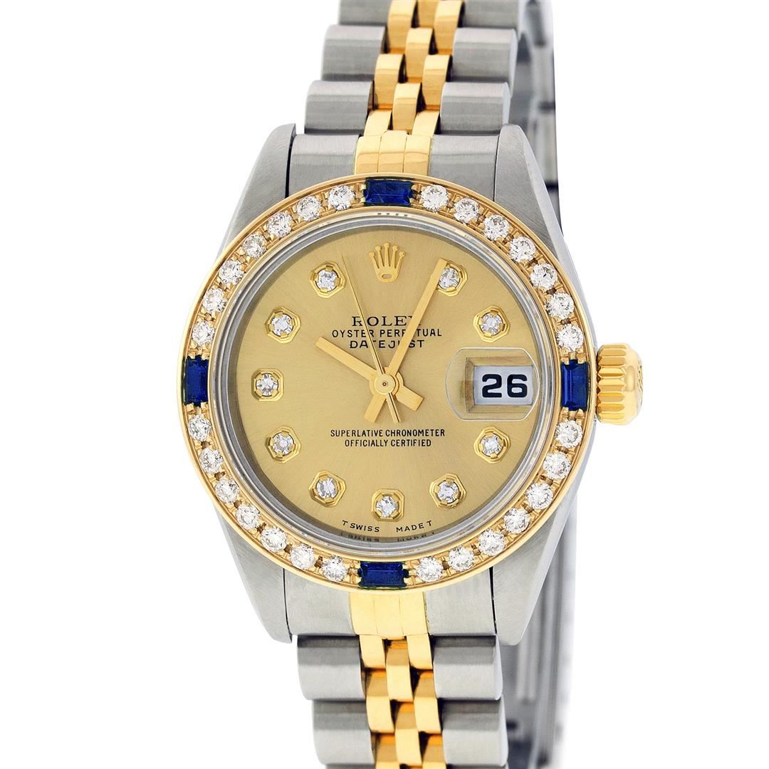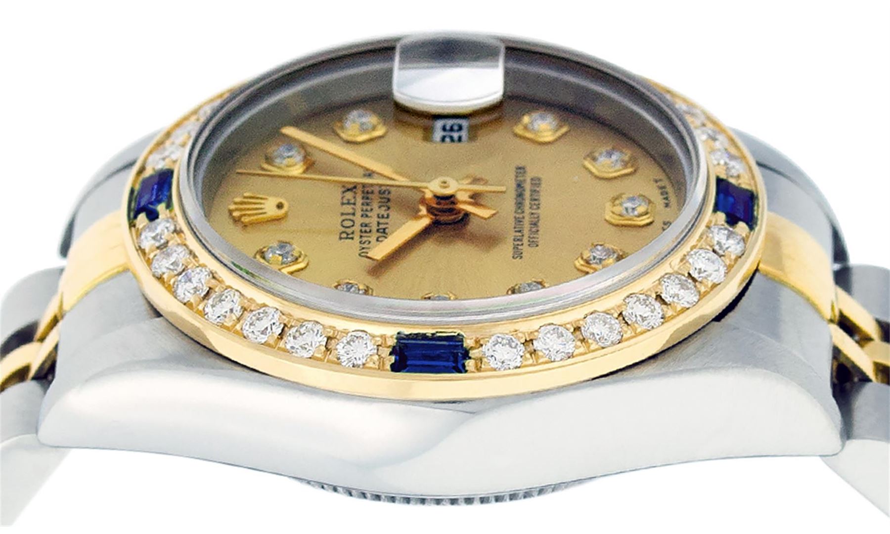 One Ladies 18K Two Tone Rolex Datejust Polished, Serviced & Electronically Tested, 18K Yellow Gold & Stainless Steel Case: 26mm, 18K Yellow Gold Crown, Custom Bezel: New 18K Yellow Gold Sapphire Beadset Diamond Bezel, Diamond + Gem Count: 28 Diamonds + 4 Sapphires Total Weight .70 Carat, Clarity: SI-VS, Color: G to H. Custom Crystal: New Scratch Resistant Synthetic Sapphire Cyclops Lens. Custom Hands: New Luminescent Hands. Movement: Automatic Winding Movement Caliber 2235. Custom Dial: Champagne Dial Set With VS Diamond Hour Markers & Dash Track, Diamond Count: 10 Champagne Single Cut Diamonds in Dial, G To H In Color, VS Clarity. Date Window: 3 O'Clock Position Date Display, Model: Datejust, Condition: G-6 Extra Fine. Bracelet: Two Tone 18K Yellow Gold & Stainless Steel Jubilee. Bright Polish. 6.0 Inch Length, Adjustable. Standard Clasp, With Rolex Logo. This Watch Has Been Serviced Time Tested And Is In Excellent Condition It Is Free Of All Scratches And Dents.