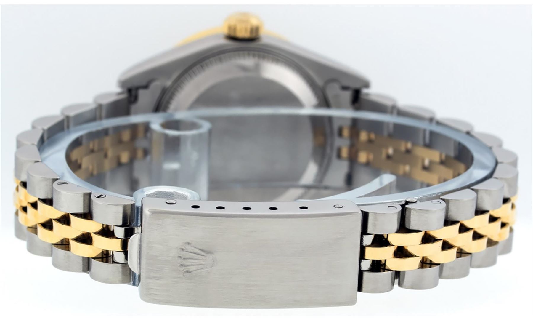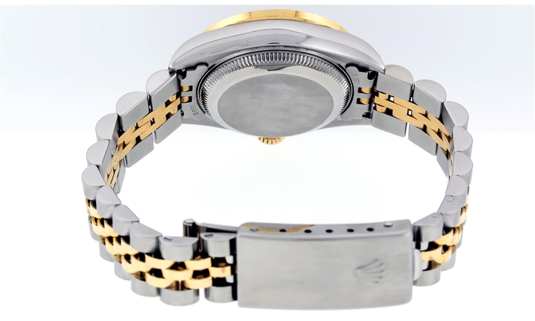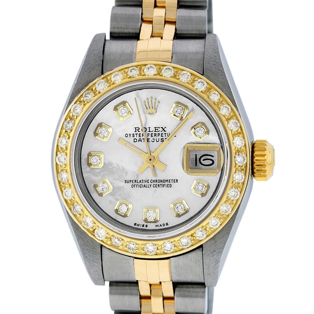 One Ladies 18K Two Tone Rolex Datejust Polished, Serviced & Electronically Tested, 18K Yellow Gold & Stainless Steel Case: 26mm, 18K Yellow Gold Crown, Custom Bezel: New 18K Yellow Gold Beadset Diamond Bezel, Diamond Count: 43 Diamonds in dial, Total Weight .70 Carat, Clarity: SI-VS, Color: G to H. Custom Crystal: New Synthetic Sapphire Cyclops Lens. Custom Hands: New Luminescent Hands. Movement: Automatic Winding Movement Caliber 2235. Custom Dial: Mother Of Pearl Diamond Dial, Stone Count: 10 Diamonds, Clarity: SI-VS, Color: G to H. Date Window: 3 O'Clock Position Date Display, Model: Datejust. Condition: G-6 Extra Fine. Bracelet: Two Tone 18K Yellow Gold & Stainless Steel Jubilee Band. Bright Polish.�6.0 Inch Length, Adjustable. Standard Clasp, With Rolex Logo. This Watch Has Been Serviced Time Tested And Is In Excellent Condition It Is Free Of All Scratches And Dents.