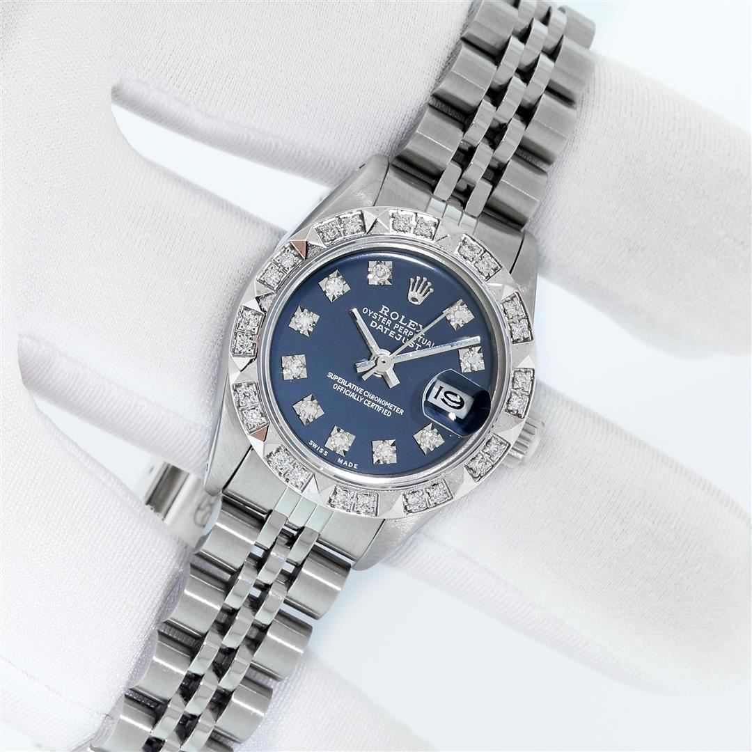 One Ladies Stainless Steel Rolex Datejust Polished Bright with Satin Finish, Serviced & Electronically Tested, Rolex Stainless Steel Case: 26mm, Rolex Stainless Steel Crown, Custom Bezel: New 18K White Gold Pyramid Diamond Bezel, Diamond Count: 24 Diamonds In Dial, Clarity: SI-VS, Color: G to H. Custom Crystal: New Sapphire With Magnified Date Window. Custom Hands: New Luminescent Hands. Rolex Movement: Automatic Winding Movement. Custom Dial: Refinished To Blue With Custom Added Diamonds. Diamond Count: 10 Diamonds In Dial. Clarity: SI-VS, Color: G to H. Date Window: 3 O'clock Position Date Display, Model: Datejust. Condition: G-6 Extra Fine. Rolex Bracelet: Stainless Steel Jubilee Band With Rolex Crown On Buckle. Bright Polish & Satin Finish. Band Length: 6.0 Inch Length, Adjustable. Standard Clasp, With Rolex Logo. This Pre Owned Watch Has Been Serviced Time Tested And Is In Excellent Condition It Is Free Of All Scratches And Dents.