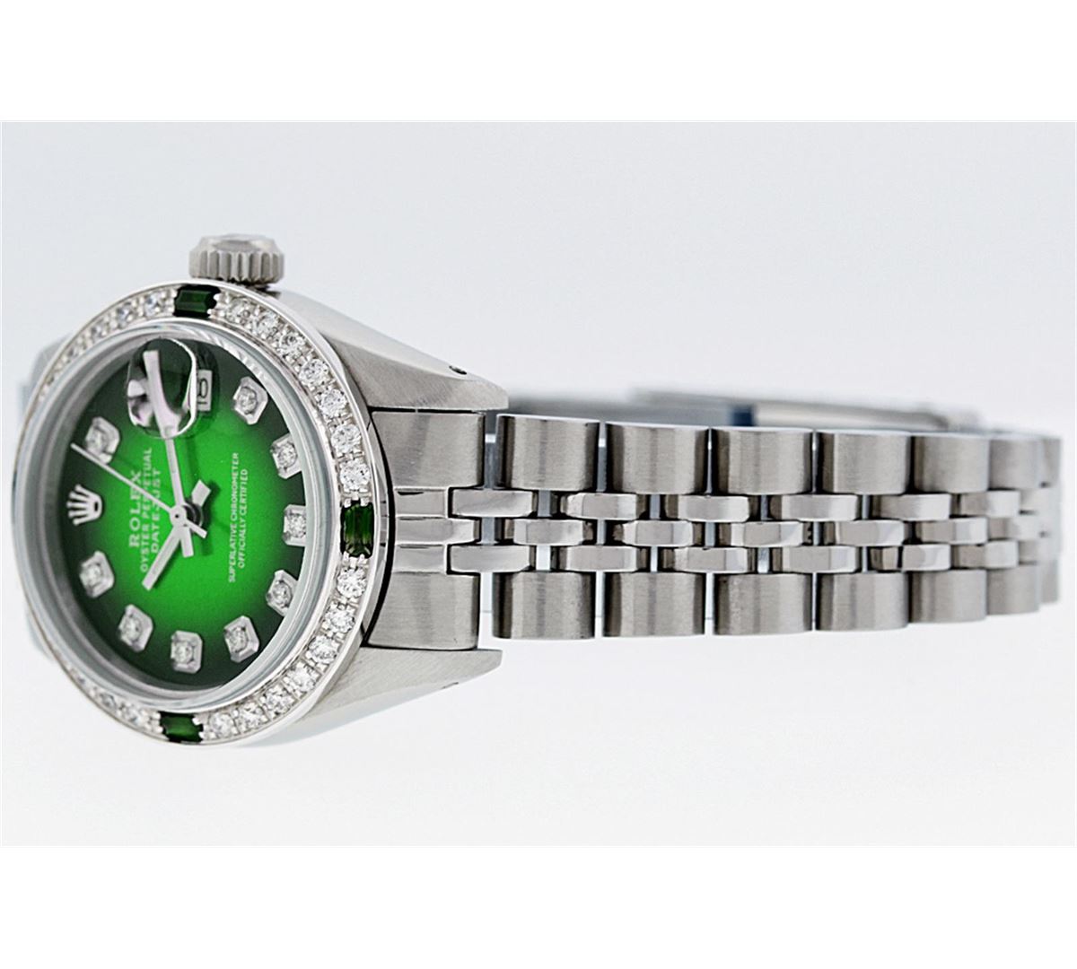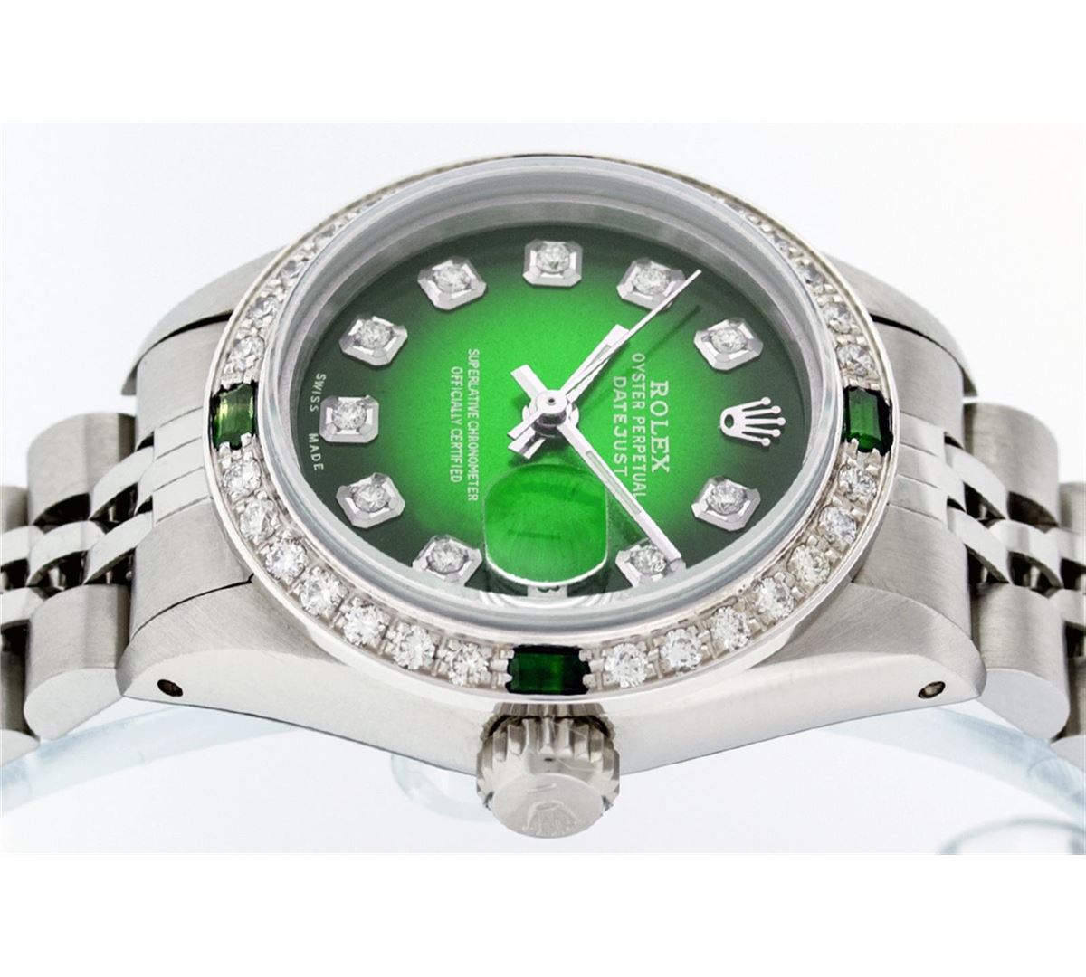 One Ladies Rolex Datejust Polished Bright with Satin Finish, Serviced & Electronically Tested, Stainless Steel Case:26mm, Stainless Steel Crown, Custom Bezel: 18K White Gold Emerald Beadset Diamond Bezel, Diamond + Gem Count: 28 Diamonds + 4 Emeralds Total Weight .70 Carat, Clarity: SI-VS, Color: G to H. Custom Crystal: Synthetic Sapphire Cyclops Lens. Movement: Automatic Winding Movement Caliber 2030. Custom Dial: Refinished Green Vignette With Diamond Hour Markers. Date Window: 3 O'Clock Position Date Display, Non Quickset, Model: Datejust. Condition: G-6 Extra Fine. Bracelet: Stainless Steel Jubilee. Bright Polish & Satin Finish. 6.0 Inch Length, Adjustable. Standard Clasp, With Rolex Logo.