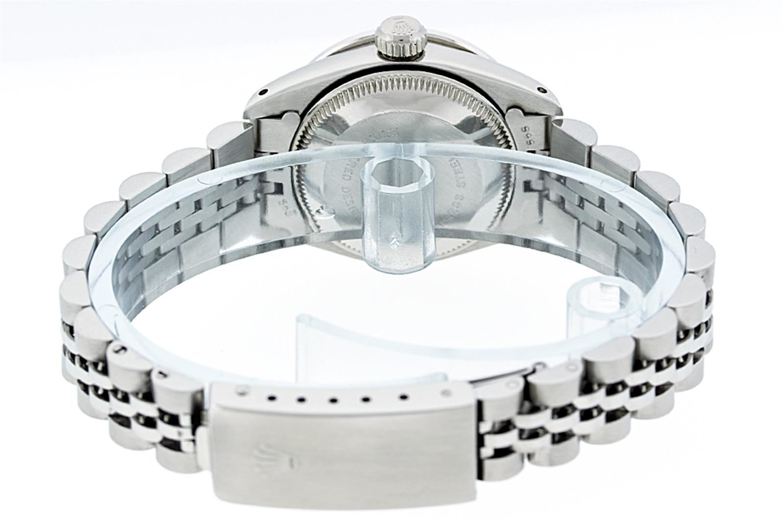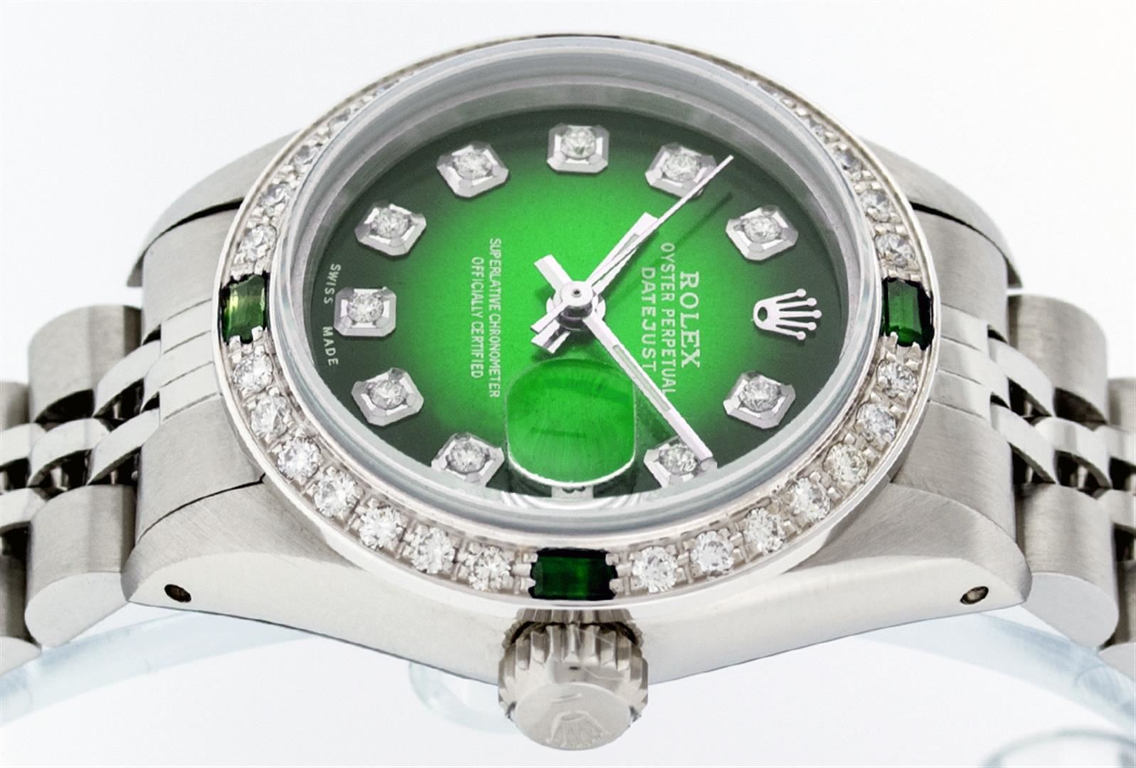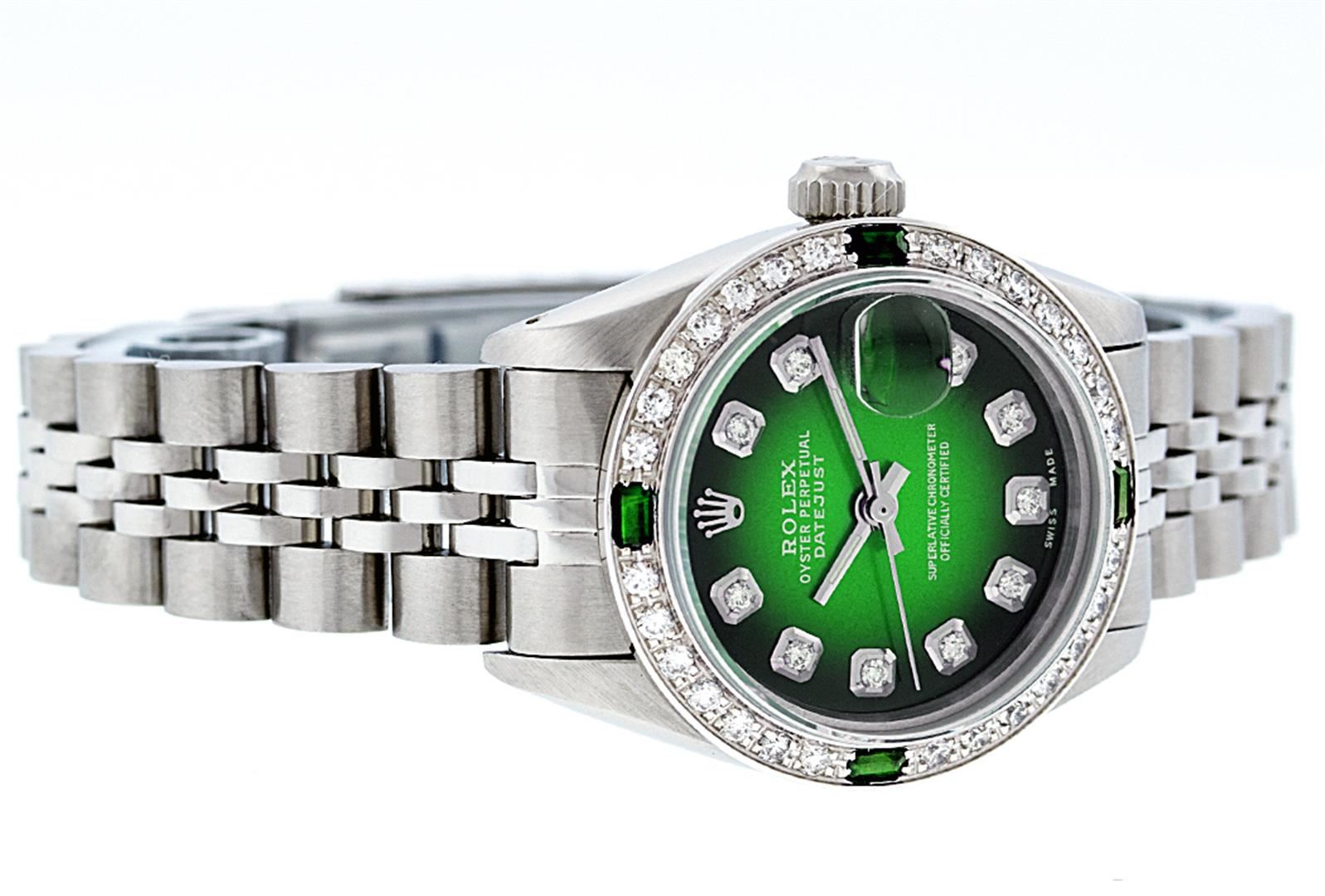 One Ladies Rolex Datejust Polished Bright with Satin Finish, Serviced & Electronically Tested, Stainless Steel Case:26mm, Stainless Steel Crown, Custom Bezel: 18K White Gold Emerald Beadset Diamond Bezel, Diamond + Gem Count: 28 Diamonds + 4 Emeralds Total Weight .70 Carat, Clarity: SI-VS, Color: G to H. Custom Crystal: Synthetic Sapphire Cyclops Lens. Movement: Automatic Winding Movement Caliber 2030. Custom Dial: Refinished Green Vignette With Diamond Hour Markers. Date Window: 3 O'Clock Position Date Display, Non Quickset, Model: Datejust. Condition: G-6 Extra Fine. Bracelet: Stainless Steel Jubilee. Bright Polish & Satin Finish. 6.0 Inch Length, Adjustable. Standard Clasp, With Rolex Logo.