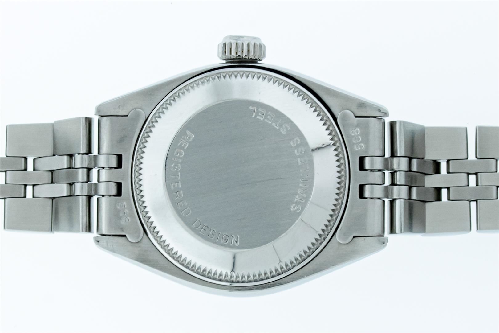 One Ladies Stainless Steel Rolex Datejust Polished Bright with Satin Finish, Serviced & Electronically Tested, Rolex Stainless Steel Case: 26mm, Rolex Stainless Steel Crown, Rolex Bezel: White Gold Fluted Bezel. Custom Crystal: New With Magnifying Date Window. Custom Hands: New Luminescent Hands. Rolex Movement: Automatic Winding Movement. Custom Dial: Meteorite String Diamond Dial, Stone Count: 43 Diamonds On Dial, G To H In Color, Clarity: SI-VS. Date Window: 3 O'clock Position Date Display, Model: Datejust. Condition: G-6 Extra Fine. Rolex Bracelet: Stainless Steel Jubilee Band. Bright Polish & Satin Finish. 6.0 Inch Length, Adjustable. Standard Clasp, With Rolex Logo. This Pre Owned Watch Has Been Serviced Time Tested And Is In Excellent Condition It Is Free Of All Scratches And Dents.