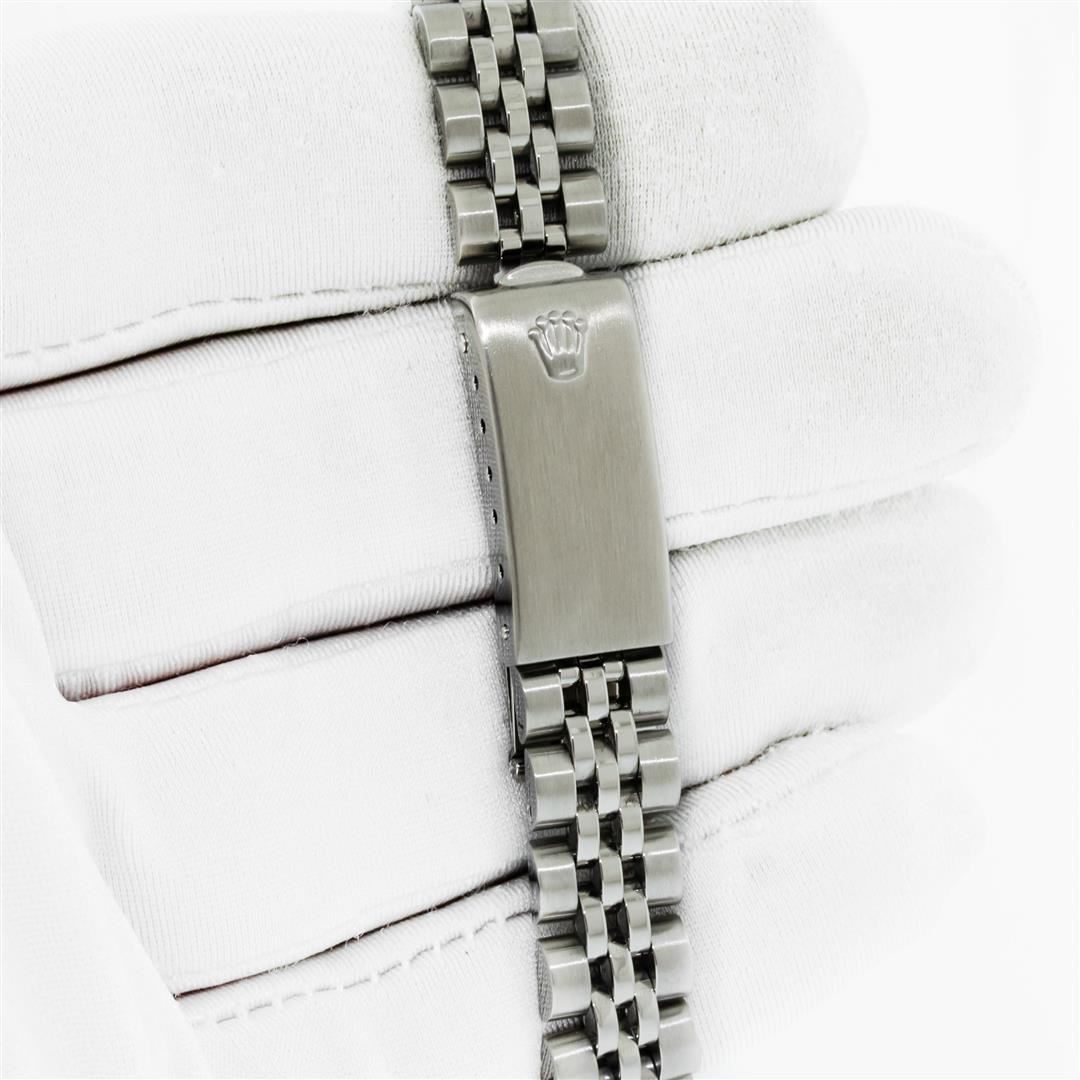 One Ladies Stainless Steel Rolex Datejust Polished Bright with Satin Finish, Serviced & Electronically Tested, Stainless Steel Case: 26mm, Stainless Steel Crown, Custom Bezel: New 18K White Gold Pyramid Diamond Bezel, Diamond Count: 24 Diamonds In Dial. T