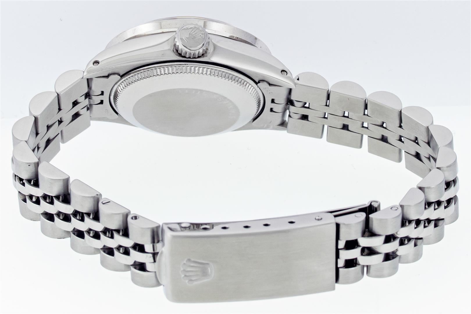One Ladies Stainless Steel Rolex Datejust Polished Bright with Satin Finish, Serviced & Electronically Tested, Stainless Steel Case: 26mm, Stainless Steel Crown, Custom Bezel: New 18K White Gold Pyramid Diamond Bezel, Diamond Count: 24 Diamonds In Dial. Total Weight .50 Carat, Clarity: SI-VS, Color: G to H. Custom Crystal: New Scratch Resistant Synthetic Sapphire Cyclops Lens. Custom Hands: New Luminescent Hands. Movement: Automatic Winding Movement. Dial: Salmon Roman Dial. Date Window: 3 O'Clock Position Date Display, Model: Datejust. Condition: G-6 Extra Fine. Bracelet: Stainless Steel Jubilee Band With Rolex Crown On Buckle. Bright Polish & Satin Finish. Band Length: 6.0 Inch Length, Adjustable. Standard Clasp, With Rolex Logo. This Watch Has Been Serviced Time Tested And Is In Excellent Condition It Is Free Of All Scratches And Dents.