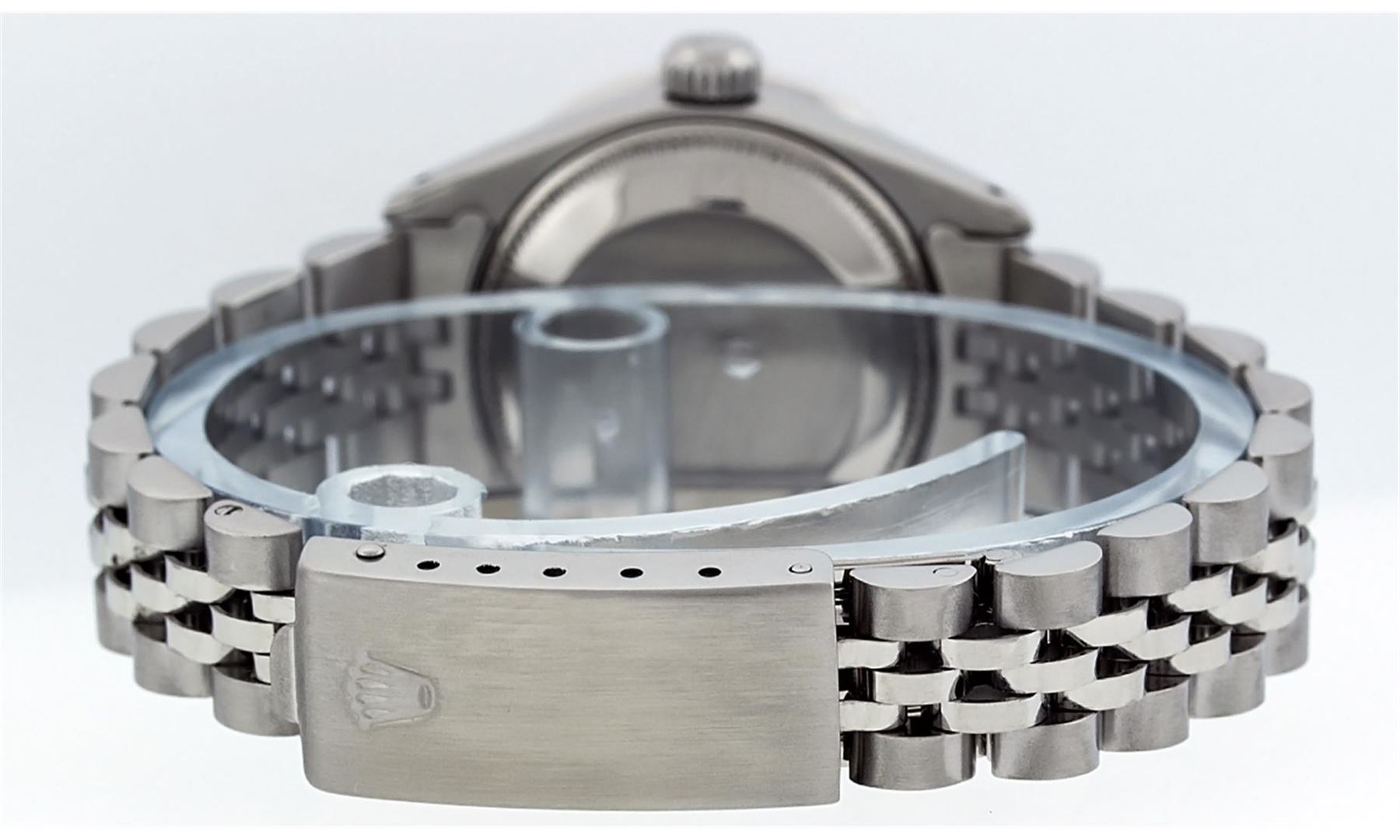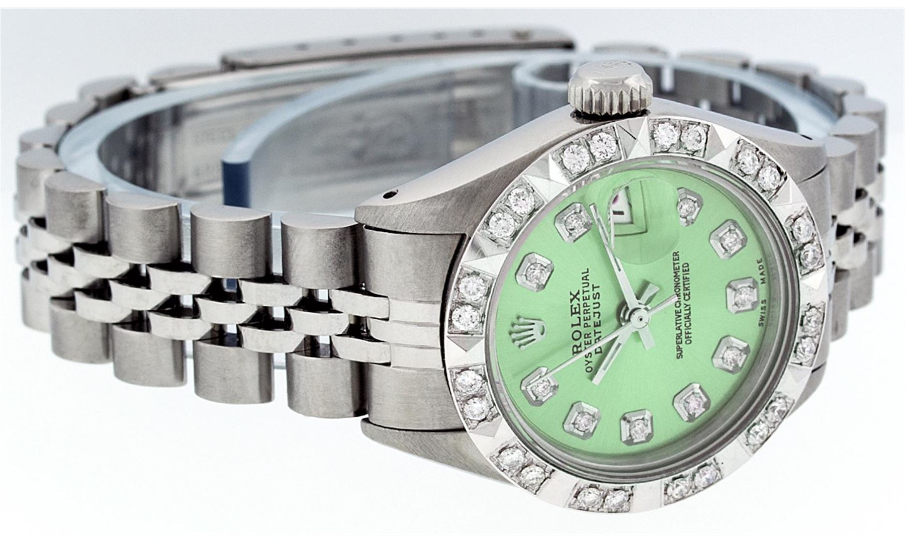 One Ladies Rolex Datejust Polished Bright with Satin Finish, Serviced & Electronically Tested, Stainless Steel Case:26mm, Stainless Steel Crown, Custom Bezel: 18K White Gold Pyramid Diamond Bezel, Diamond Count: 24 Diamonds In Dial. Total Weight .50 Carat, Clarity: SI-VS, Color: G to H. Custom Crystal: Synthetic Sapphire Cyclops Lens. Movement: Automatic Winding Movement Caliber 2030. Custom Dial: Green Diamond Dial. Diamond Count: 10 Diamonds In Dial. Clarity: SI-VS, Color:G to H. Date Window: 3 O'Clock Position Date Display, Model: Datejust. Condition: G-6 Extra Fine The Watch Is In Very Good Condition Free Of All Scratches And Dents. Bracelet: Stainless Steel Jubilee Band With Rolex Crown On Buckle. Bright Polish & Satin Finish. Band Length: 6.0 Inch Length, Adjustable. Standard Clasp, With Rolex Logo.