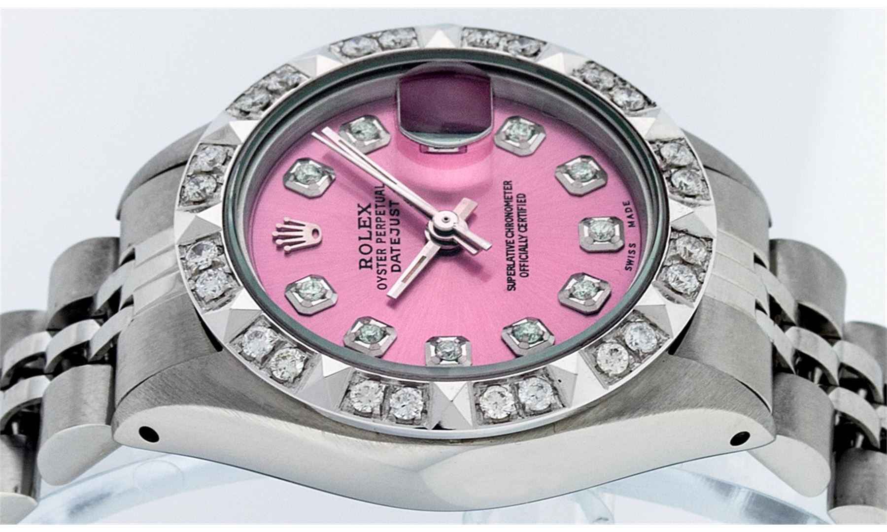 One Ladies Rolex Datejust Polished Bright with Satin Finish, Serviced & Electronically Tested, Stainless Steel Case:26mm, Stainless Steel Crown, Custom Bezel: 18K White Gold Pyramid Diamond Bezel, Diamond Count: 24 Diamonds In Dial. Total Weight .50 Carat, Clarity: SI-VS, Color: G to H. Custom Crystal: Synthetic Sapphire Cyclops Lens. Movement: Automatic Winding Movement Caliber 2030. Custom Dial: Ice Pink Diamond Dial. Diamond Count: 10 Diamonds In Dial. Clarity: SI-VS, Color:G to H. Date Window: 3 O'Clock Position Date Display, Model: Datejust. Condition: G-6 Extra Fine The Watch Is In Very Good Condition Free Of All Scratches And Dents. Bracelet: Stainless Steel Jubilee Band With Rolex Crown On Buckle. Bright Polish & Satin Finish. Band Length: 6.0 Inch Length, Adjustable. Standard Clasp, With Rolex Logo.