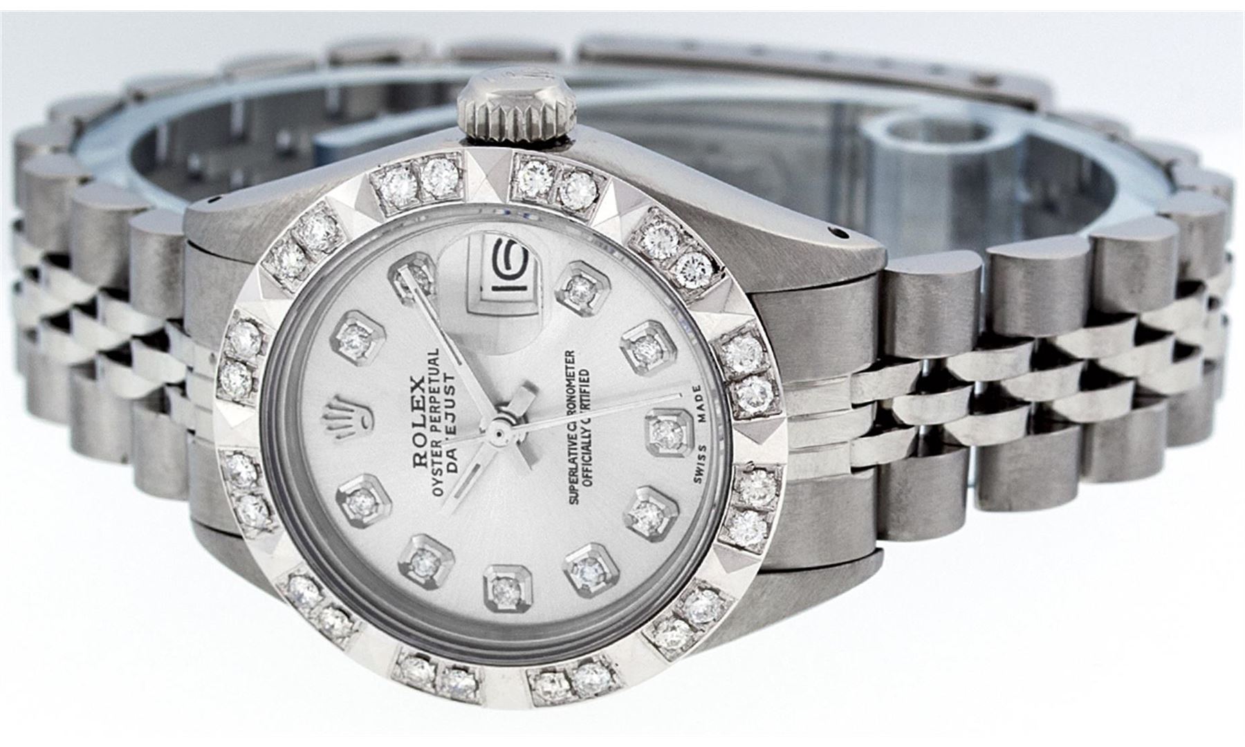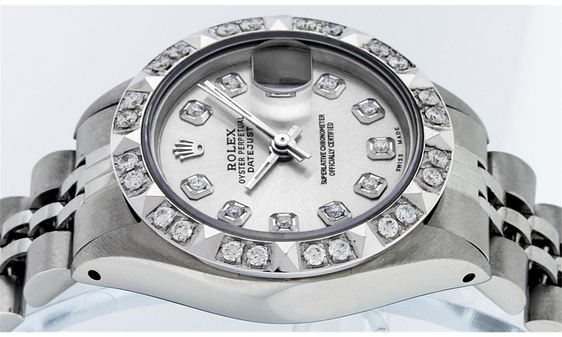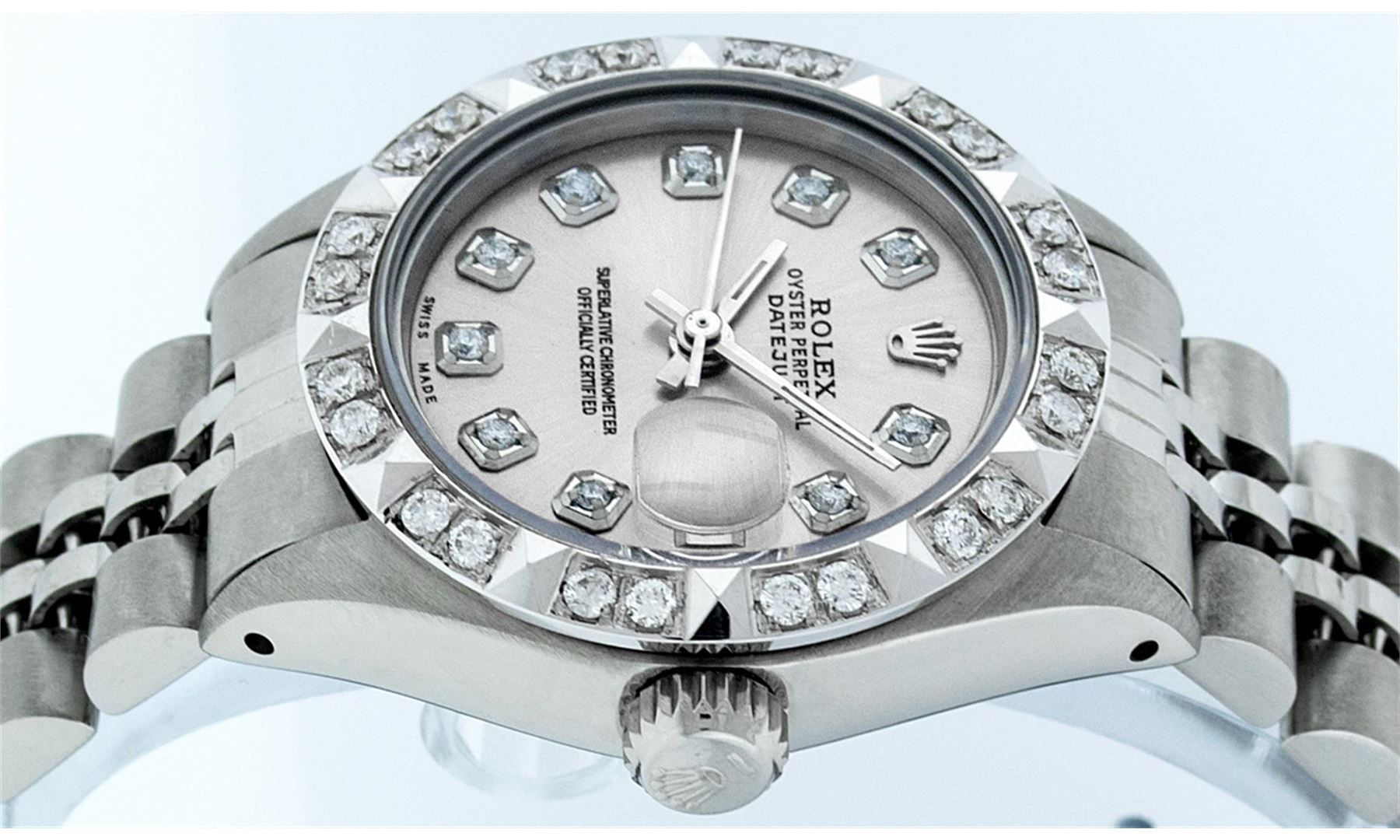 One Ladies Rolex Datejust Polished Bright with Satin Finish, Serviced & Electronically Tested, Stainless Steel Case:26mm, Stainless Steel Crown, Custom Bezel: 18K White Gold Pyramid Diamond Bezel, Diamond Count: 24 Diamonds In Dial. Total Weight .50 Carat, Clarity: SI-VS, Color: G to H. Custom Crystal: Synthetic Sapphire Cyclops Lens. Movement: Automatic Winding Movement Caliber 2030. Custom Dial: Silver Diamond Dial. Diamond Count: 10 Diamonds In Dial. Clarity: SI-VS, Color:G to H. Date Window: 3 O'Clock Position Date Display, Model: Datejust. Condition: G-6 Extra Fine The Watch Is In Very Good Condition Free Of All Scratches And Dents. Bracelet: Stainless Steel Jubilee Band With Rolex Crown On Buckle. Bright Polish & Satin Finish. Band Length: 6.0 Inch Length, Adjustable. Standard Clasp, With Rolex Logo.