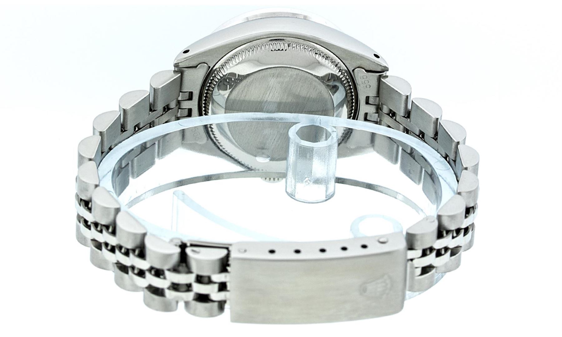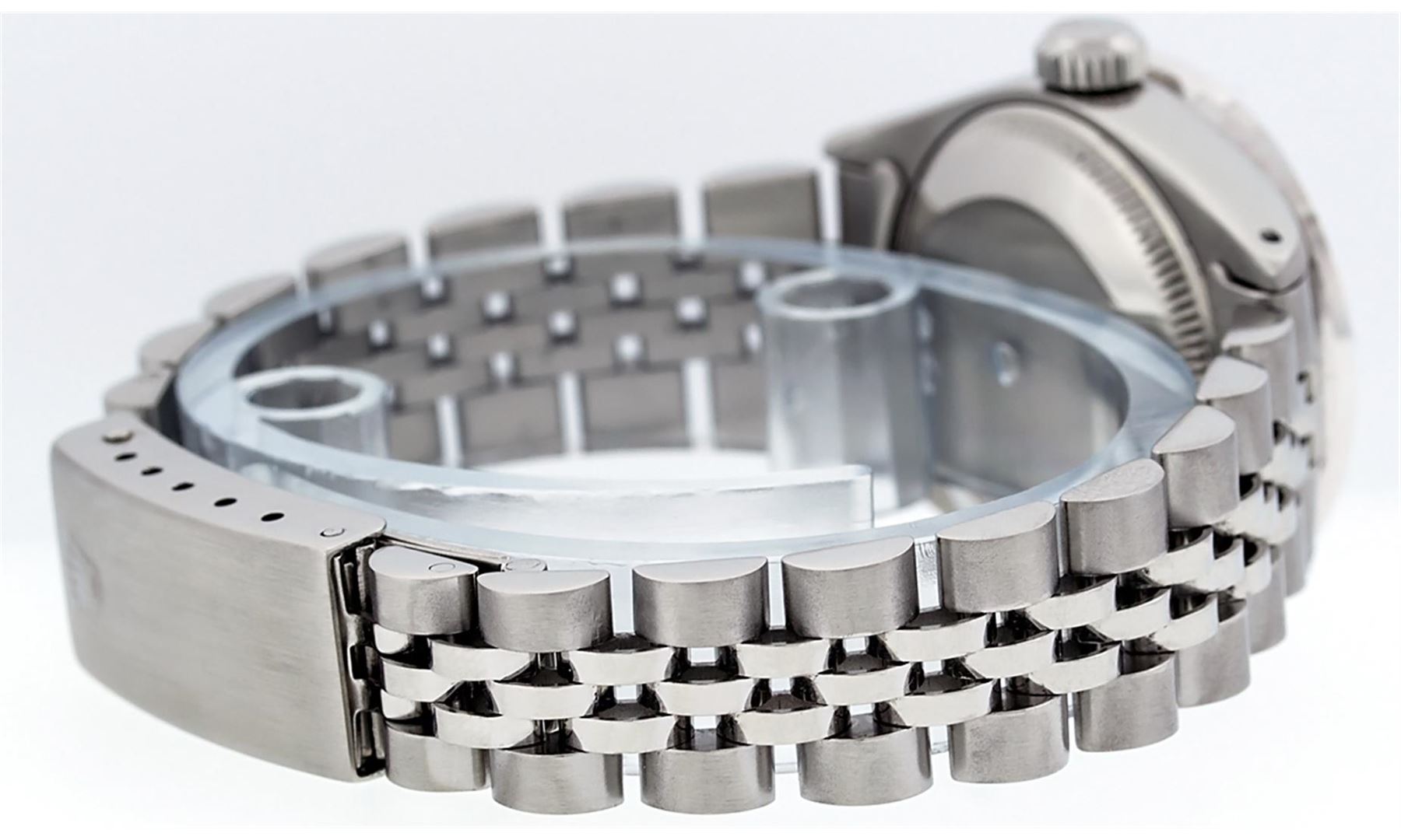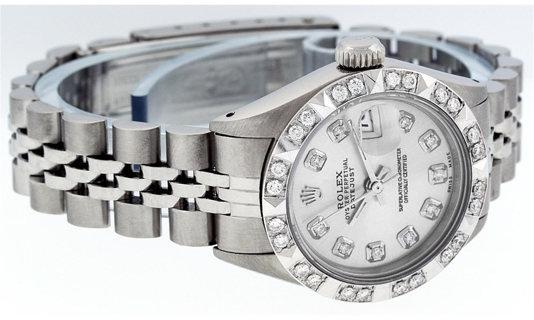 One Ladies Rolex Datejust Polished Bright with Satin Finish, Serviced & Electronically Tested, Stainless Steel Case:26mm, Stainless Steel Crown, Custom Bezel: 18K White Gold Pyramid Diamond Bezel, Diamond Count: 24 Diamonds In Dial. Total Weight .50 Carat, Clarity: SI-VS, Color: G to H. Custom Crystal: Synthetic Sapphire Cyclops Lens. Movement: Automatic Winding Movement Caliber 2030. Custom Dial: Silver Diamond Dial. Diamond Count: 10 Diamonds In Dial. Clarity: SI-VS, Color:G to H. Date Window: 3 O'Clock Position Date Display, Model: Datejust. Condition: G-6 Extra Fine The Watch Is In Very Good Condition Free Of All Scratches And Dents. Bracelet: Stainless Steel Jubilee Band With Rolex Crown On Buckle. Bright Polish & Satin Finish. Band Length: 6.0 Inch Length, Adjustable. Standard Clasp, With Rolex Logo.