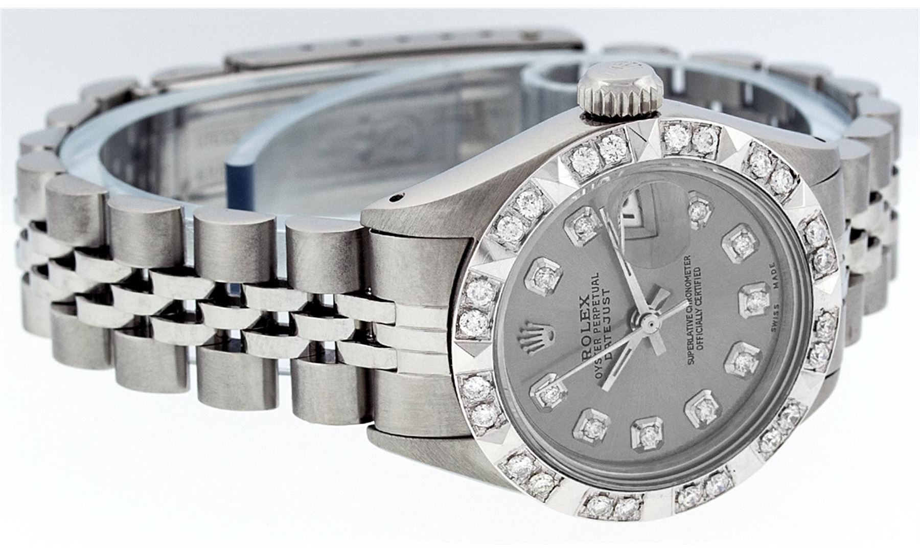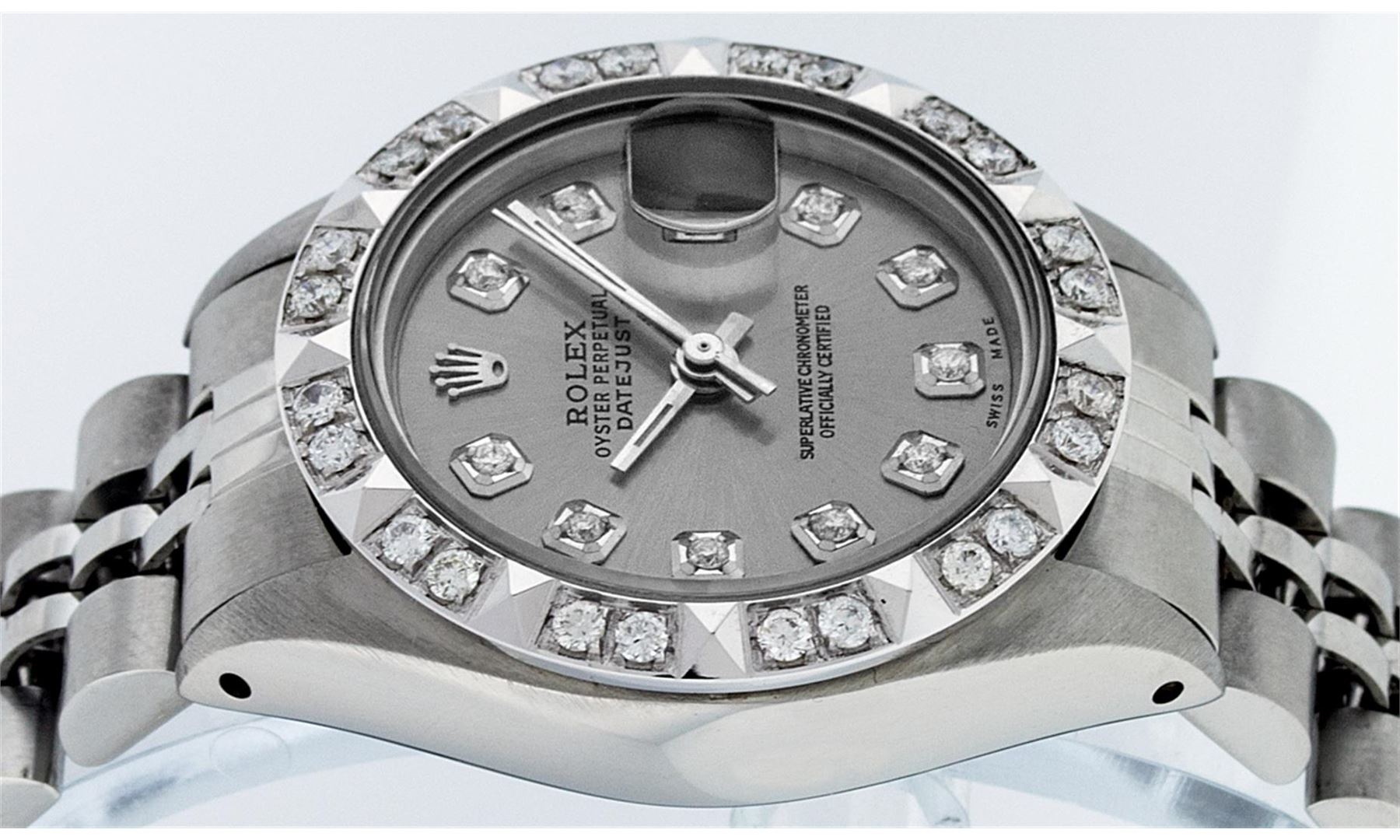 One Ladies Rolex Datejust Polished Bright with Satin Finish, Serviced & Electronically Tested, Stainless Steel Case:26mm, Stainless Steel Crown, Custom Bezel: 18K White Gold Pyramid Diamond Bezel, Diamond Count: 24 Diamonds In Dial. Total Weight .50 Carat, Clarity: SI-VS, Color: G to H. Custom Crystal: Synthetic Sapphire Cyclops Lens. Movement: Automatic Winding Movement Caliber 2030. Custom Dial: Slate Grey Diamond Dial. Diamond Count: 10 Diamonds In Dial. Clarity: SI-VS, Color:G to H. Date Window: 3 O'Clock Position Date Display, Model: Datejust. Condition: G-6 Extra Fine The Watch Is In Very Good Condition Free Of All Scratches And Dents. Bracelet: Stainless Steel Jubilee Band With Rolex Crown On Buckle. Bright Polish & Satin Finish. Band Length: 6.0 Inch Length, Adjustable. Standard Clasp, With Rolex Logo.