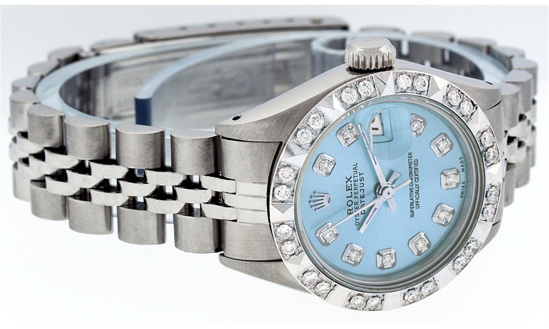 One Ladies Rolex Datejust Polished Bright with Satin Finish, Serviced & Electronically Tested, Stainless Steel Case:26mm, Stainless Steel Crown, Custom Bezel: 18K White Gold Pyramid Diamond Bezel, Diamond Count: 24 Diamonds In Dial. Total Weight .50 Carat, Clarity: SI-VS, Color: G to H. Custom Crystal: Synthetic Sapphire Cyclops Lens. Movement: Automatic Winding Movement Caliber 2030. Custom Dial: Blue Diamond Dial. Diamond Count: 10 Diamonds In Dial. Clarity: SI-VS, Color:G to H. Date Window: 3 O'Clock Position Date Display, Model: Datejust. Condition: G-6 Extra Fine The Watch Is In Very Good Condition Free Of All Scratches And Dents. Bracelet: Stainless Steel Jubilee Band With Rolex Crown On Buckle. Bright Polish & Satin Finish. Band Length: 6.0 Inch Length, Adjustable. Standard Clasp, With Rolex Logo.