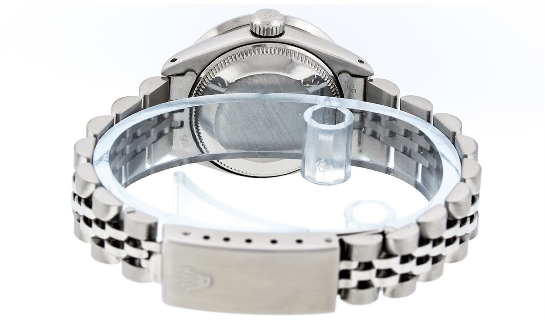 One Ladies Rolex Datejust Polished Bright with Satin Finish, Serviced & Electronically Tested, Stainless Steel Case:26mm, Stainless Steel Crown, Custom Bezel: 18K White Gold Beadset Diamond Bezel, Diamond Count: 32 Diamonds In Bezel. Total Weight .70 Carat, Clarity: SI-VS, Color: G to H. Custom Crystal: Synthetic Sapphire Cyclops Lens. Movement: Automatic Winding Movement Caliber 2030. Custom Dial: Light Pink Mother Of Pearl Dial With Diamond Hour Markers, Diamond Count: 10 Diamonds In Dial, Clarity: SI-VS, Color: G to H. Date Window: 3 O'Clock Position Date Display, Non Quickset, Model: Datejust. Condition: G-6 Extra Fine. Bracelet: Stainless Steel Jubilee. Bright Polish & Satin Finish. 6.0 Inch Length, Adjustable. Standard Clasp, With Rolex Logo.