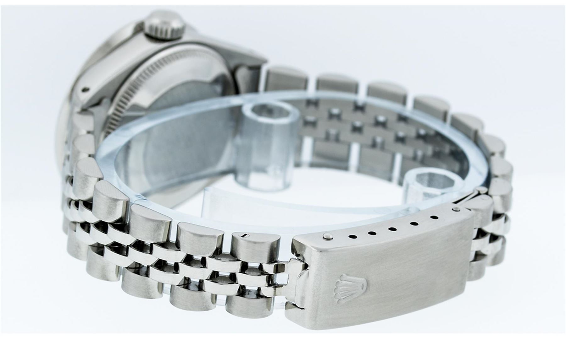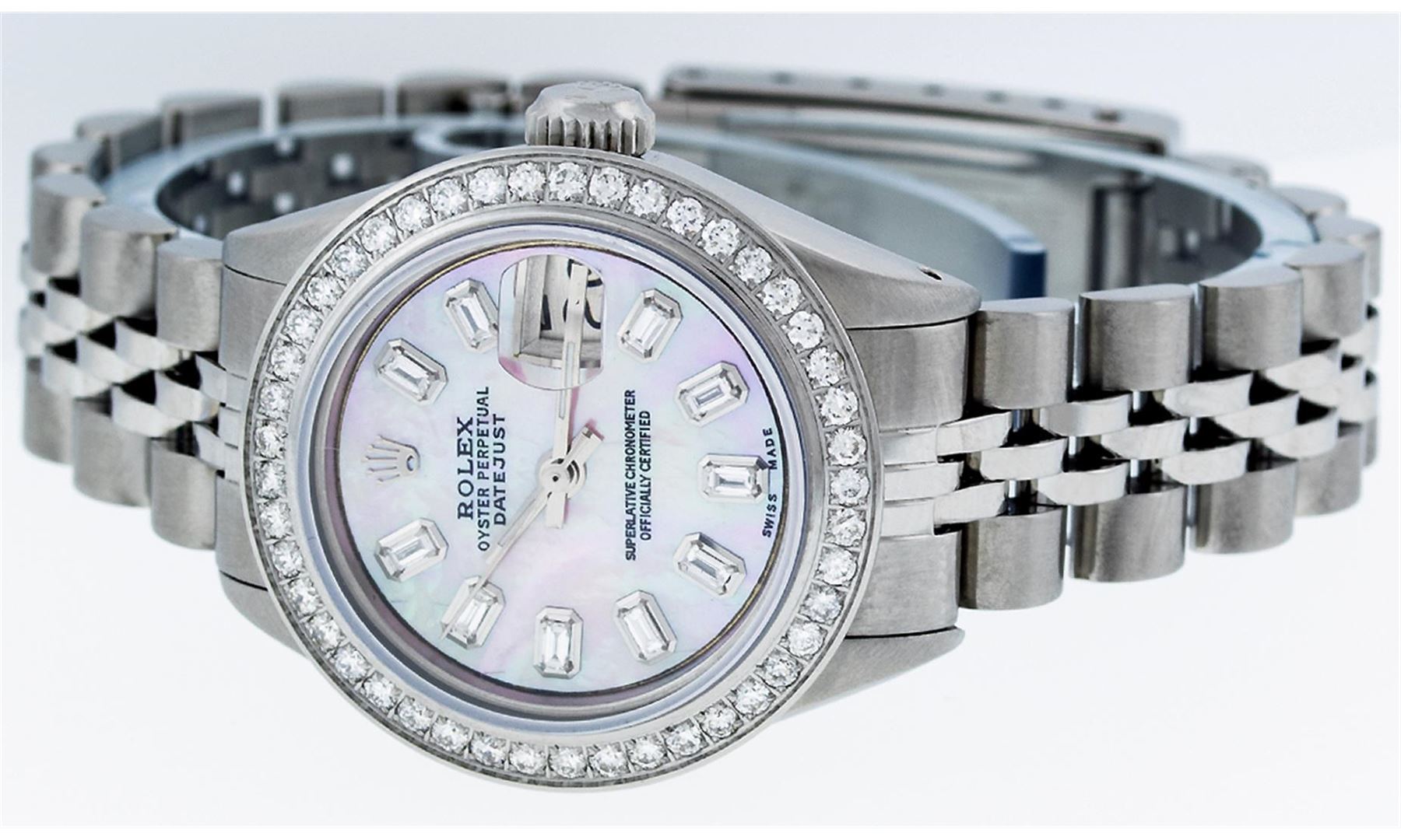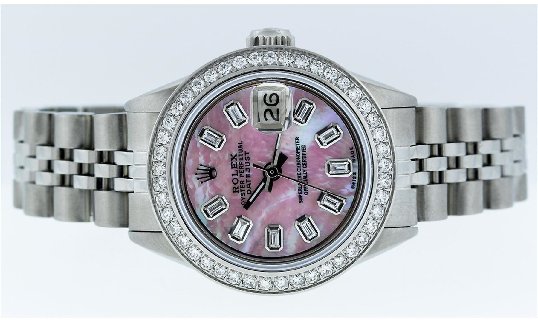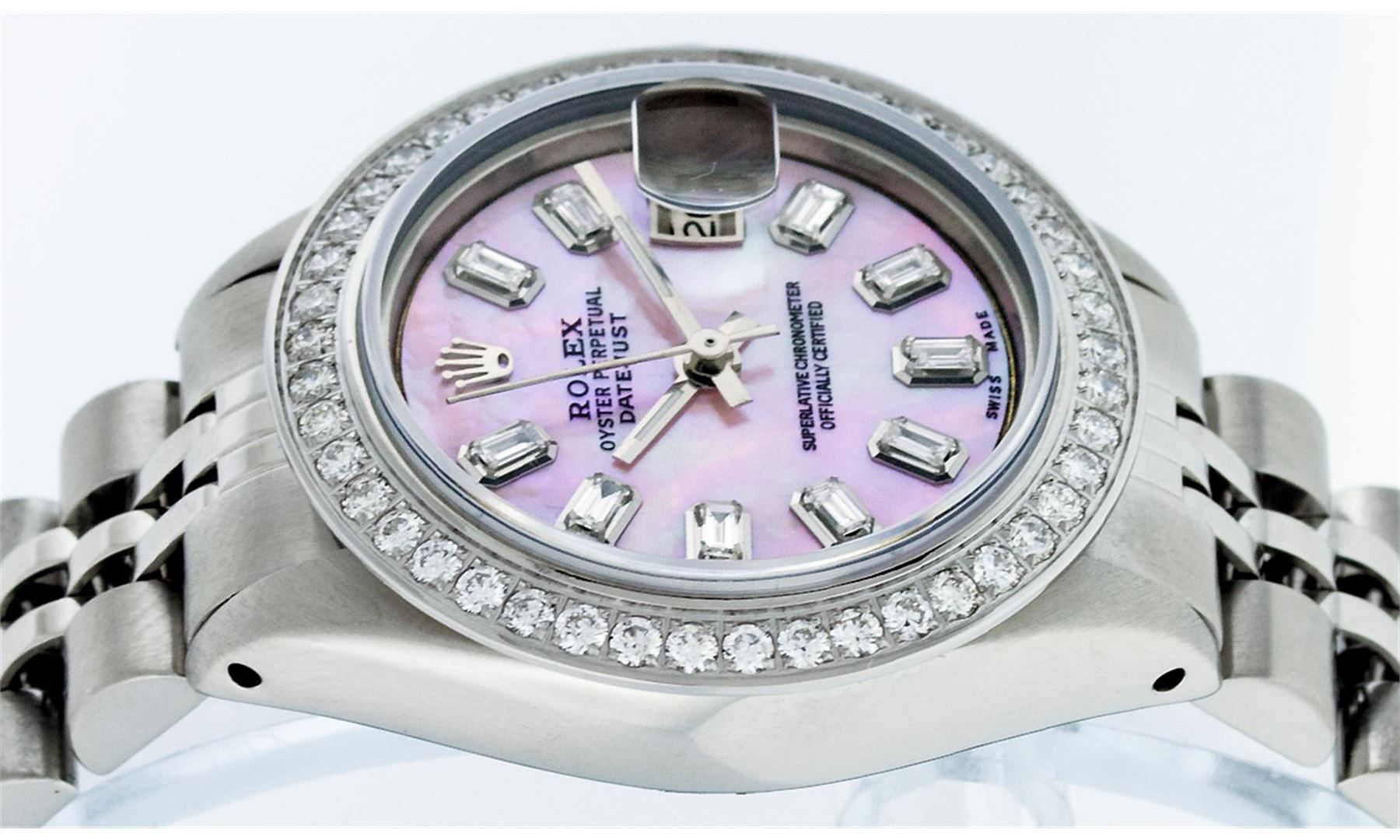 One Ladies Rolex Datejust Polished Bright with Satin Finish, Serviced & Electronically Tested, Stainless Steel Case:26mm, Stainless Steel Crown, Custom Bezel: Stainless Steel Beadset Diamond Bezel, Diamond Count: 44 Diamonds Total Weight 1.00 Carat, Clarity: SI-VS, Color: G to H. Custom Crystal: Synthetic Sapphire Cyclops Lens. Movement: Automatic Winding Movement Caliber 2030. Custom Dial: Refinished Pink Mother Of Pearl With Baguette Diamond Hour Markers, Diamond Count: 10 Baguette Diamonds in Dial G To H In Color, Clarity: SI-VS. Date Window: 3 O'Clock Position Date Display, Model: Datejust. Condition: G-6 Extra Fine. Bracelet: Stainless Steel Jubilee Band. Bright Polish & Satin Finish. 6.0 Inch Length, Adjustable. Standard Clasp, With Rolex Logo.