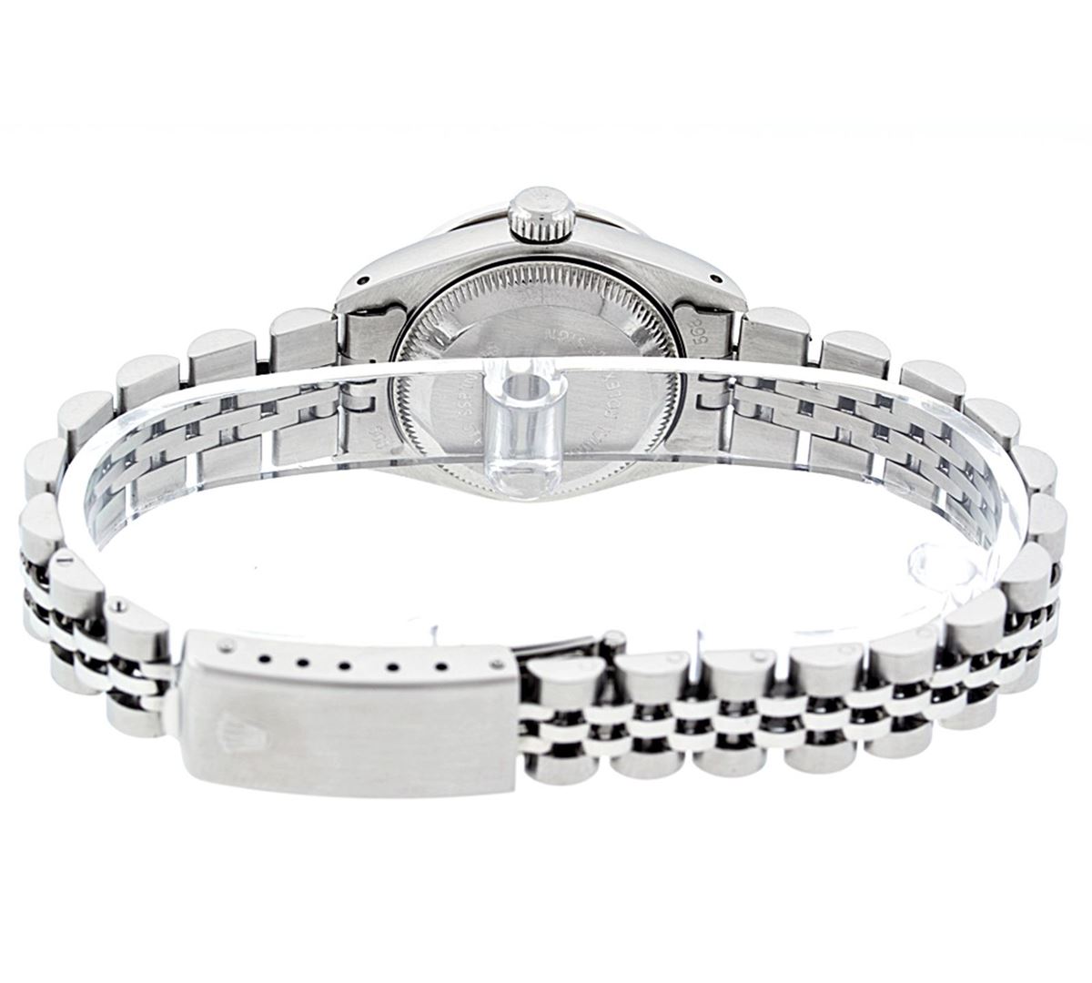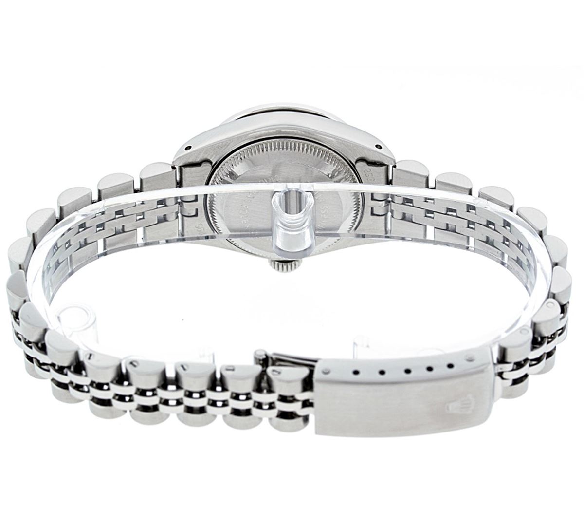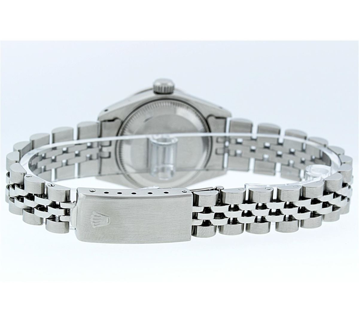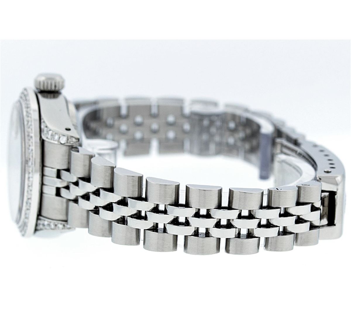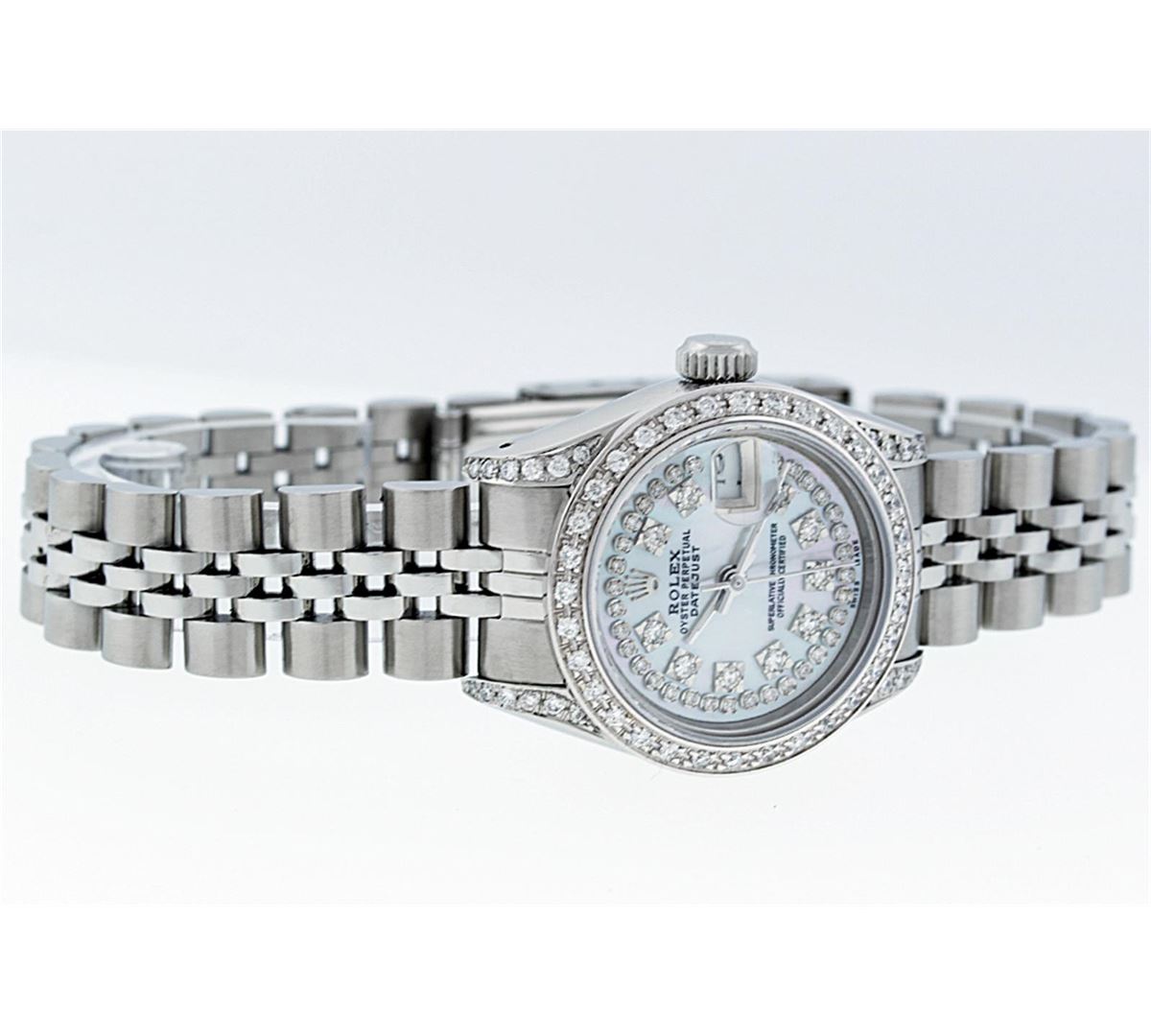 One Ladies Rolex Datejust Polished Bright with Satin Finish, Serviced & Electronically Tested, Stainless Steel Case:26mm, Stainless Steel Crown, Diamond Lugs: 16 Diamonds On Lugs, Clarity: SI-VS, Color: G to H. Custom Bezel: 18K White Gold Beadset Bezel, Diamond Count: 32 Diamonds, Total Weight 1.00 Carat, Clarity: SI-VS, Color: G to H. Custom Crystal: Synthetic Sapphire Cyclops Lens. Movement: Automatic Winding Movement Caliber 2030. Custom Dial: Refinished Mother Of Pearl With String Diamond Dial, 43 Diamonds in Dial G To H In Color, Clarity: VVS. Date Window: 3 O'Clock Position Date Display, Model: Datejust. Condition: G-6 Extra Fine. Bracelet: Stainless Steel Jubilee. Bright Polish & Satin Finish. 6.0 Inch Length, Adjustable. Standard Clasp, With Rolex Logo. Total Diamond Weight: 1.25 CTW