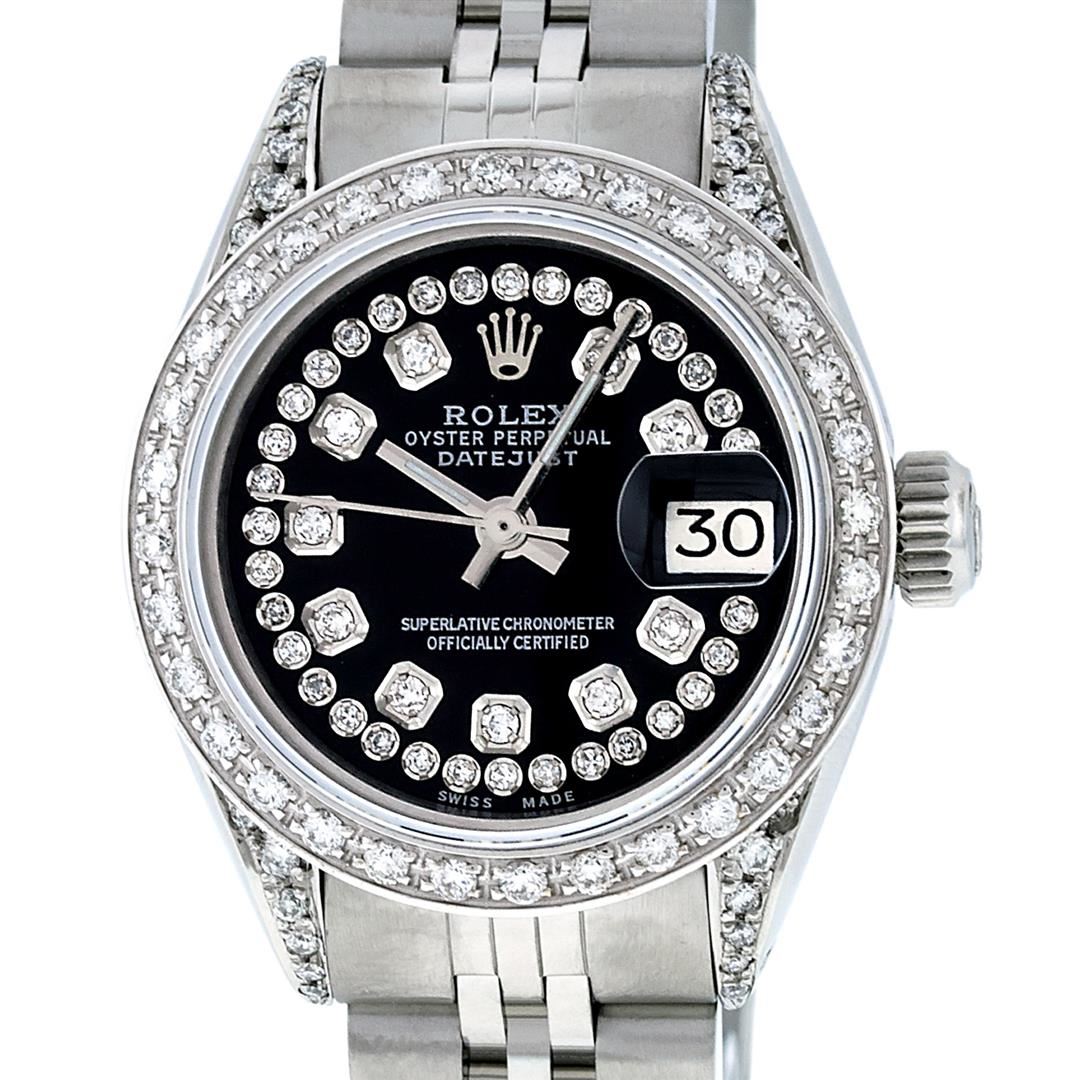 One Ladies Stainless Steel Rolex Datejust Polished Bright with Satin Finish, Serviced & Electronically Tested, Stainless Steel Case: 26mm, Stainless Steel Crown, Diamond Lugs: 24 Diamonds On Lugs, Clarity: SI-VS, Color: G to H. Custom Bezel: New 18K White Gold Beadset Diamond Bezel, Diamond Count: 32 Diamonds Total Weight 1.00 Carat, Clarity: SI-VS, Color: G to H. Custom Crystal: New Synthetic Sapphire Cyclops Lens. Custom Hands: New Luminescent Hands. Movement: Automatic Winding Movement Caliber 2030. Custom Dial: Refinished Black With String Diamond Dial, 43 Diamonds in Dial G To H In Color, Clarity: SI-VS. Date Window: 3 O'Clock Position Date Display, Model: Datejust. Condition: G-6 Extra Fine. Bracelet: Stainless Steel Jubilee. Bright Polish & Satin Finish. 6.0 Inch Length, Adjustable. Standard Clasp, With Rolex Logo. This Watch Has Been Serviced Time Tested And Is In Excellent Condition It Is Free Of All Scratches And Dents.