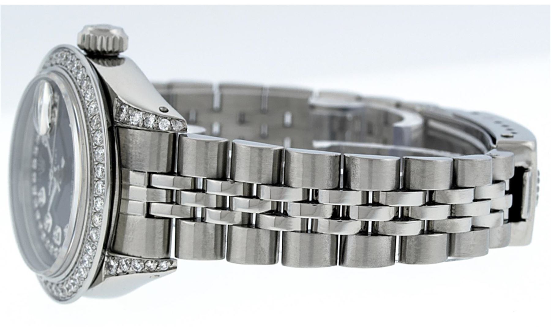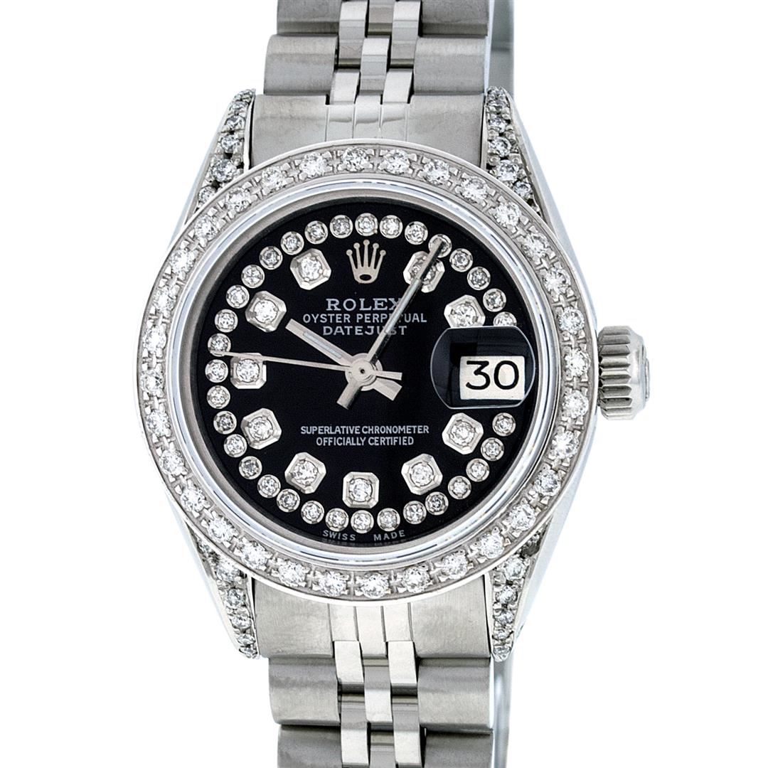 One Ladies Stainless Steel Rolex Datejust Polished Bright with Satin Finish, Serviced & Electronically Tested, Stainless Steel Case: 26mm, Stainless Steel Crown, Diamond Lugs: 24 Diamonds On Lugs, Clarity: SI-VS, Color: G to H. Custom Bezel: New 18K White Gold Beadset Diamond Bezel, Diamond Count: 32 Diamonds Total Weight 1.00 Carat, Clarity: SI-VS, Color: G to H. Custom Crystal: New Synthetic Sapphire Cyclops Lens. Custom Hands: New Luminescent Hands. Movement: Automatic Winding Movement Caliber 2030. Custom Dial: Refinished Black With String Diamond Dial, 43 Diamonds in Dial G To H In Color, Clarity: SI-VS. Date Window: 3 O'Clock Position Date Display, Model: Datejust. Condition: G-6 Extra Fine. Bracelet: Stainless Steel Jubilee. Bright Polish & Satin Finish. 6.0 Inch Length, Adjustable. Standard Clasp, With Rolex Logo. This Watch Has Been Serviced Time Tested And Is In Excellent Condition It Is Free Of All Scratches And Dents.