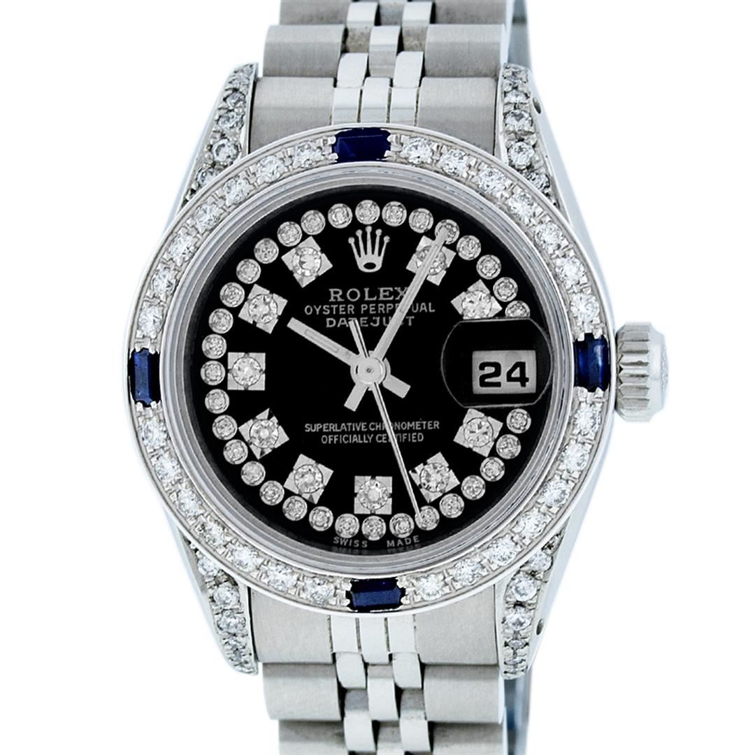 One Ladies Stainless Steel Rolex Datejust Polished Bright with Satin Finish, Serviced & Electronically Tested, Stainless Steel Case: 26mm, Stainless Steel Crown, Diamond Lugs: 24 Diamonds On Lugs, Clarity: SI-VS, Color: G to H. Custom Bezel: New 18K White Gold Diamond + Sapphire Beadset Diamond Bezel, Stone Count: 28 Diamonds + 4 Sapphires, Total Weight .70 Carat, Clarity: SI-VS, Color: G to H. Custom Crystal: New Synthetic Sapphire Cyclops Lens. Custom Hands: New Luminescent Hands. Movement: Automatic Winding Movement Caliber 2030. Custom Dial: Refinished Black String Diamond Dial, 43 Diamonds in Dial G To H In Color, Clarity: VS. Date Window: 3 O'Clock Position Date Display, Model: Datejust. Condition: G-6 Extra Fine. Bracelet: Stainless Steel Jubilee. Bright Polish & Satin Finish. 6.0 Inch Length, Adjustable. Standard Clasp, With Rolex Logo. This Watch Has Been Serviced Time Tested And Is In Excellent Condition It Is Free Of All Scratches And Dents.