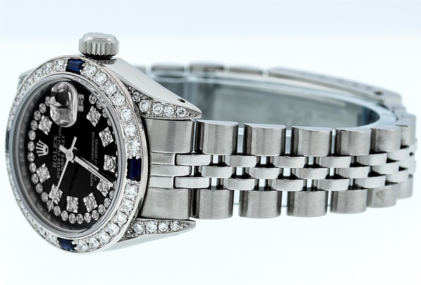 One Ladies Stainless Steel Rolex Datejust Polished Bright with Satin Finish, Serviced & Electronically Tested, Stainless Steel Case: 26mm, Stainless Steel Crown, Diamond Lugs: 24 Diamonds On Lugs, Clarity: SI-VS, Color: G to H. Custom Bezel: New 18K White Gold Diamond + Sapphire Beadset Diamond Bezel, Stone Count: 28 Diamonds + 4 Sapphires, Total Weight .70 Carat, Clarity: SI-VS, Color: G to H. Custom Crystal: New Synthetic Sapphire Cyclops Lens. Custom Hands: New Luminescent Hands. Movement: Automatic Winding Movement Caliber 2030. Custom Dial: Refinished Black String Diamond Dial, 43 Diamonds in Dial G To H In Color, Clarity: VS. Date Window: 3 O'Clock Position Date Display, Model: Datejust. Condition: G-6 Extra Fine. Bracelet: Stainless Steel Jubilee. Bright Polish & Satin Finish. 6.0 Inch Length, Adjustable. Standard Clasp, With Rolex Logo. This Watch Has Been Serviced Time Tested And Is In Excellent Condition It Is Free Of All Scratches And Dents.