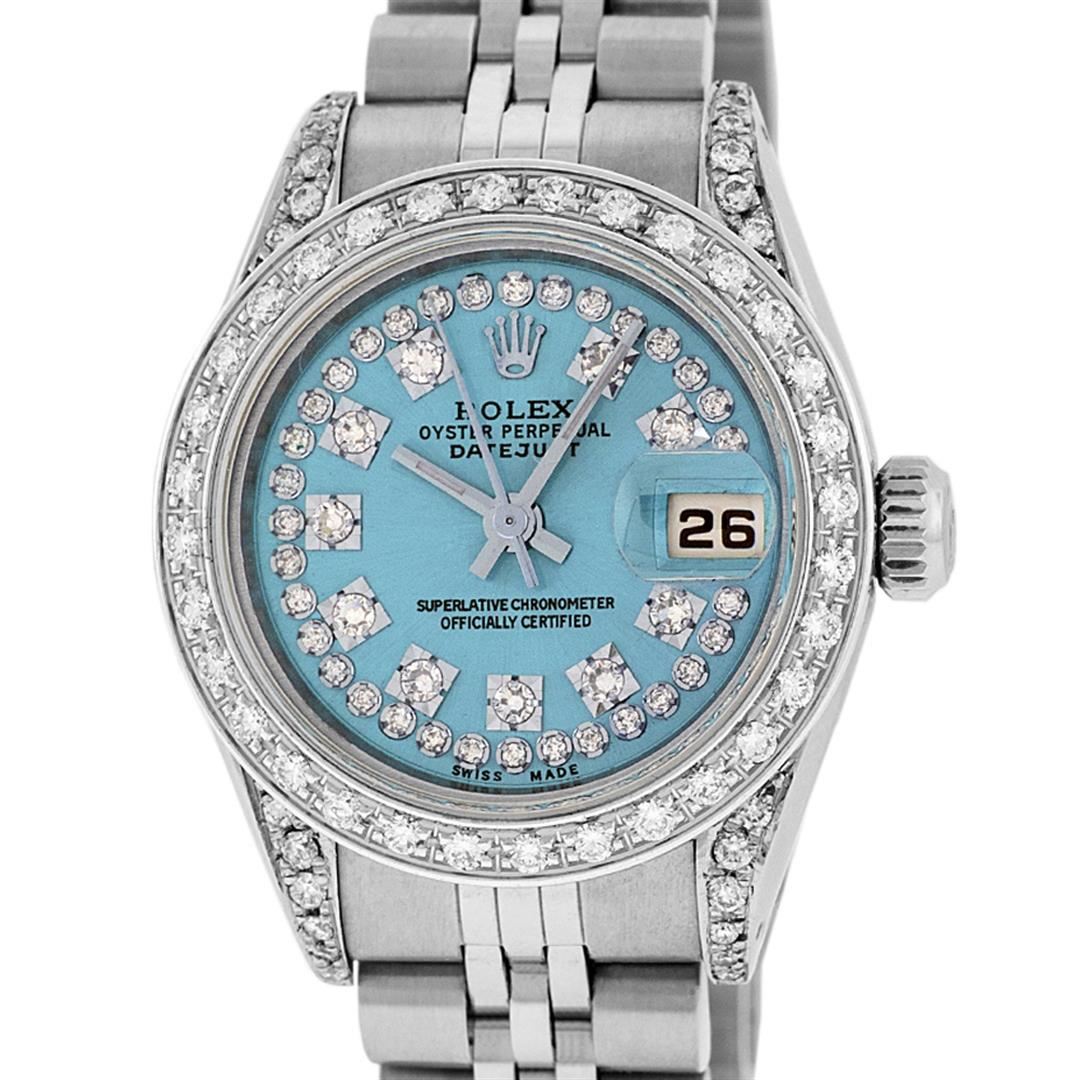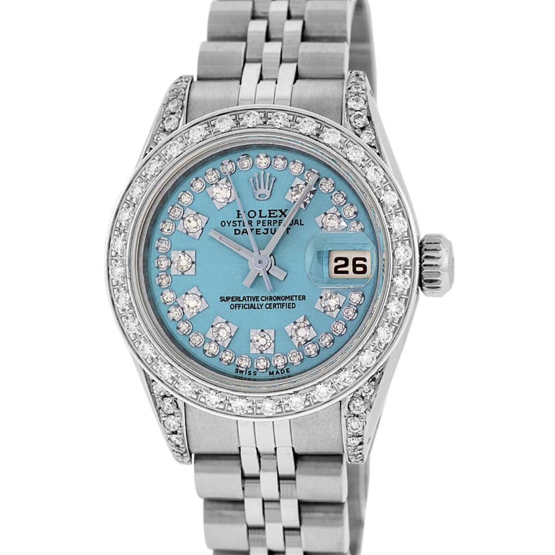 One Ladies Stainless Steel Rolex Datejust Polished Bright with Satin Finish, Serviced & Electronically Tested, Stainless Steel Case: 26mm, Stainless Steel Crown, Diamond Lugs: 24 Diamonds On Lugs, Clarity: SI-VS, Color: G to H. Custom Bezel: New 18K White Gold Beadset Diamond Bezel, Stone Count: 32 Diamonds, Total Weight .70 Carat, Clarity: SI-VS, Color: G to H. Custom Crystal: New Scratch Resistant Synthetic Sapphire Cyclops Lens. Custom Hands: New Luminescent Hands. Movement: Automatic Winding Movement Caliber 2030. Custom Dial: Refinished Blue String Diamond Dial, 43 Diamonds in Dial G To H In Color, Clarity: VS. Date Window: 3 O'Clock Position Date Display, Model: Datejust. Condition: G-6 Extra Fine. Bracelet: Stainless Steel Jubilee Band. Bright Polish & Satin Finish. 6.0 Inch Length, Adjustable. Standard Clasp, With Rolex Logo. This Watch Has Been Serviced Time Tested And Is In Excellent Condition It Is Free Of All Scratches And Dents.