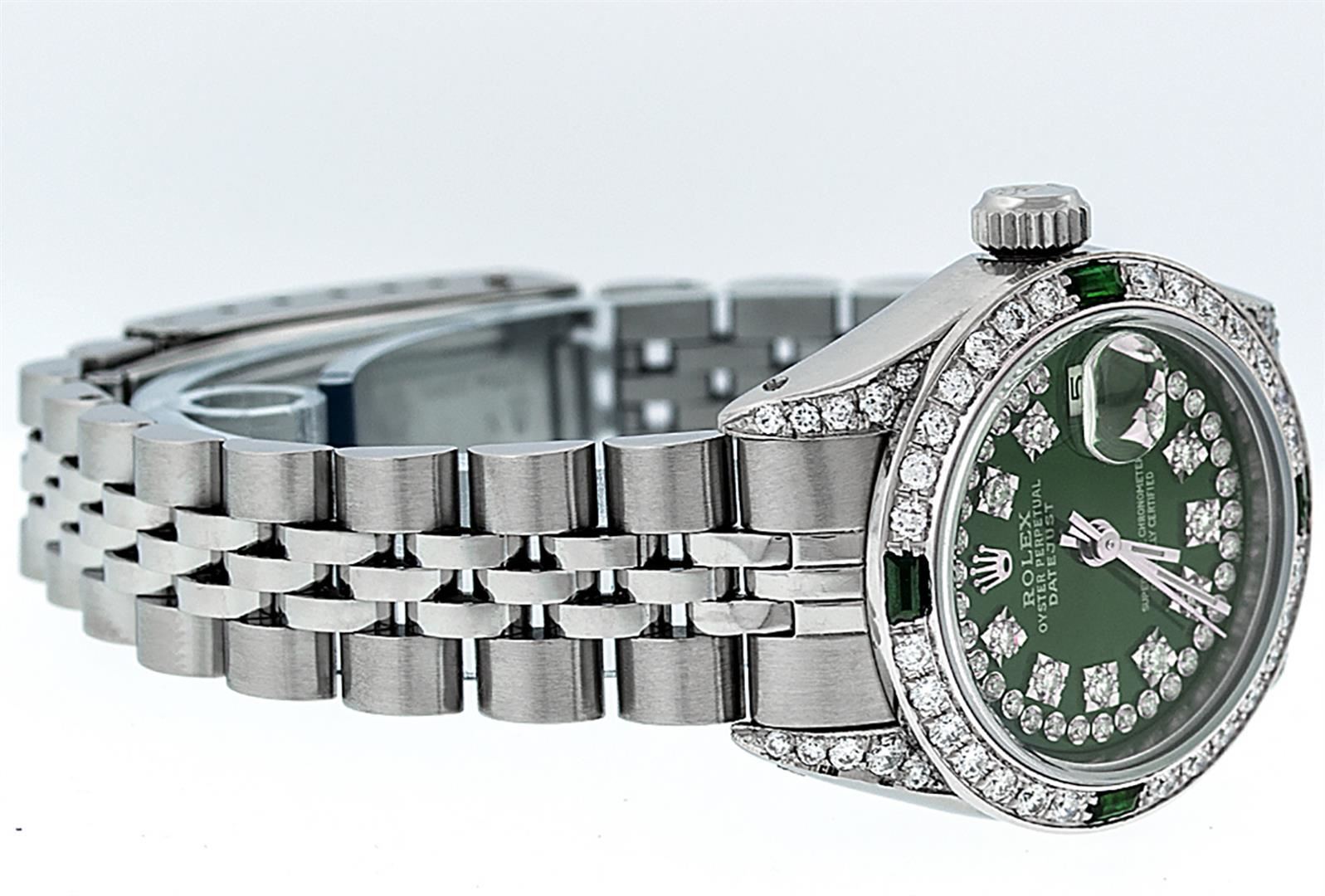 One Ladies Stainless Steel Rolex Datejust Polished Bright with Satin Finish, Serviced & Electronically Tested, Stainless Steel Case: 26mm, Stainless Steel Crown, Diamond Lugs: 24 Diamonds On Lugs, Clarity: SI-VS, Color: G to H. Custom Bezel: New 18K White Gold Diamond + Emerald Beadset Diamond Bezel, Stone Count: 28 Diamonds + 4 Emeralds, Total Weight .70 Carat, Clarity: SI-VS, Color: G to H. Custom Crystal: New Synthetic Sapphire Cyclops Lens. Custom Hands: New Luminescent Hands. Movement: Automatic Winding Movement Caliber 2030. Custom Dial: Refinished Green String Diamond Dial, 43 Diamonds in Dial G To H In Color, Clarity: VS. Date Window: 3 O'Clock Position Date Display, Model: Datejust. Condition: G-6 Extra Fine. Bracelet: Stainless Steel Jubilee. Bright Polish & Satin Finish. 6.0 Inch Length, Adjustable. Standard Clasp, With Rolex Logo. This Watch Has Been Serviced Time Tested And Is In Excellent Condition It Is Free Of All Scratches And Dents.