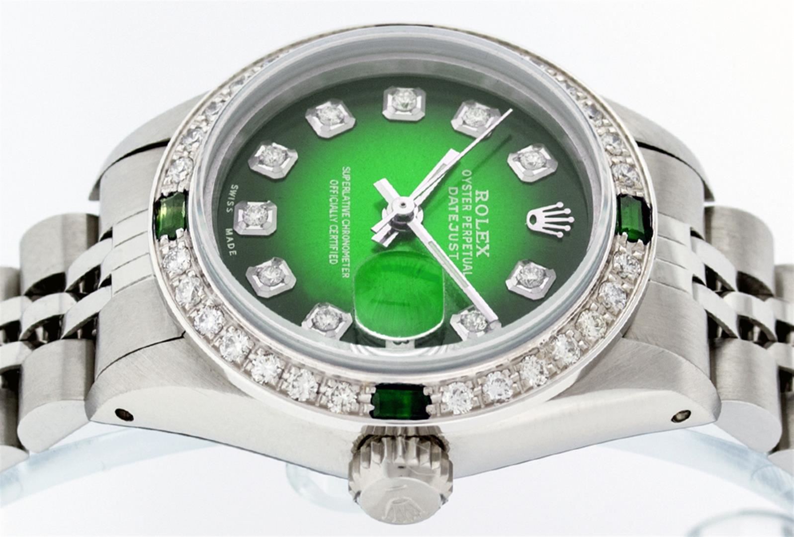 One Ladies Stainless Steel Rolex Datejust Polished Bright with Satin Finish, Serviced & Electronically Tested, Stainless Steel Case: 26mm, Stainless Steel Crown, Custom Bezel: New 18K White Gold Synthetic Emerald Beadset Diamond Bezel, Diamond + Gem Count: 28 Diamonds + 4 Synthetic Emeralds Total Weight .70 Carat, Clarity: SI-VS, Color: G to H. Custom Crystal: New Synthetic Sapphire Cyclops Lens. Custom Hands: New Luminescent Hands. Movement: Automatic Winding Movement Caliber 2030. Custom Dial: Refinished Green Vignette With Diamond Hour Markers. Diamond Count: 10 Diamonds In Dial, Clarity: SI-VS, Color: G to H. Date Window: 3 O'Clock Position Date Display, Model: Datejust. Condition: G-6 Extra Fine. Bracelet: Stainless Steel Jubilee. Bright Polish & Satin Finish. 6.0 Inch Length, Adjustable. Standard Clasp, With Rolex Logo. This Watch Has Been Serviced Time Tested And Is In Excellent Condition It Is Free Of All Scratches And Dents.