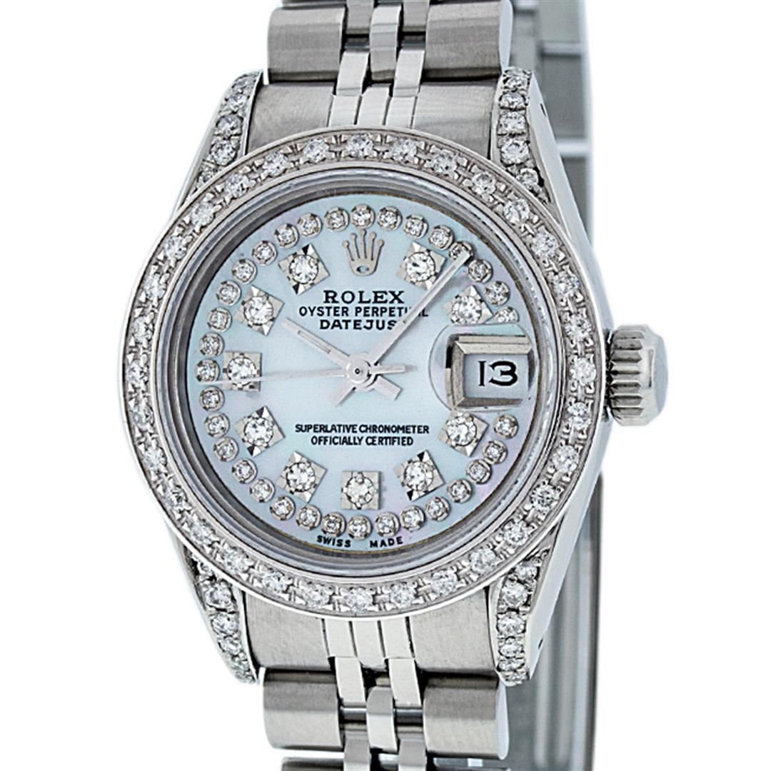 One Ladies Stainless Steel Rolex Datejust Polished Bright with Satin Finish, Serviced & Electronically Tested, Stainless Steel Case: 26mm, Stainless Steel Crown, Diamond Lugs: 24 Diamonds On Lugs, Clarity: SI-VS, Color: G to H. Custom Bezel: New 18K White Gold Diamond Beadset Diamond Bezel, Stone Count: 32 Diamonds, Total Weight .70 Carat, Clarity: SI-VS, Color: G to H. Custom Crystal: New Synthetic Sapphire Cyclops Lens. Custom Hands: New Luminescent Hands. Movement: Automatic Winding Movement Caliber 2030. Custom Dial: Refinished Mother Of Pearl String Diamond Dial, 43 Diamonds in Dial G To H In Color, Clarity: VS. Date Window: 3 O'Clock Position Date Display, Model: Datejust. Condition: G-6 Extra Fine. Bracelet: Stainless Steel Jubilee. Bright Polish & Satin Finish. 6.0 Inch Length, Adjustable. Standard Clasp, With Rolex Logo. This Watch Has Been Serviced Time Tested And Is In Excellent Condition It Is Free Of All Scratches And Dents.