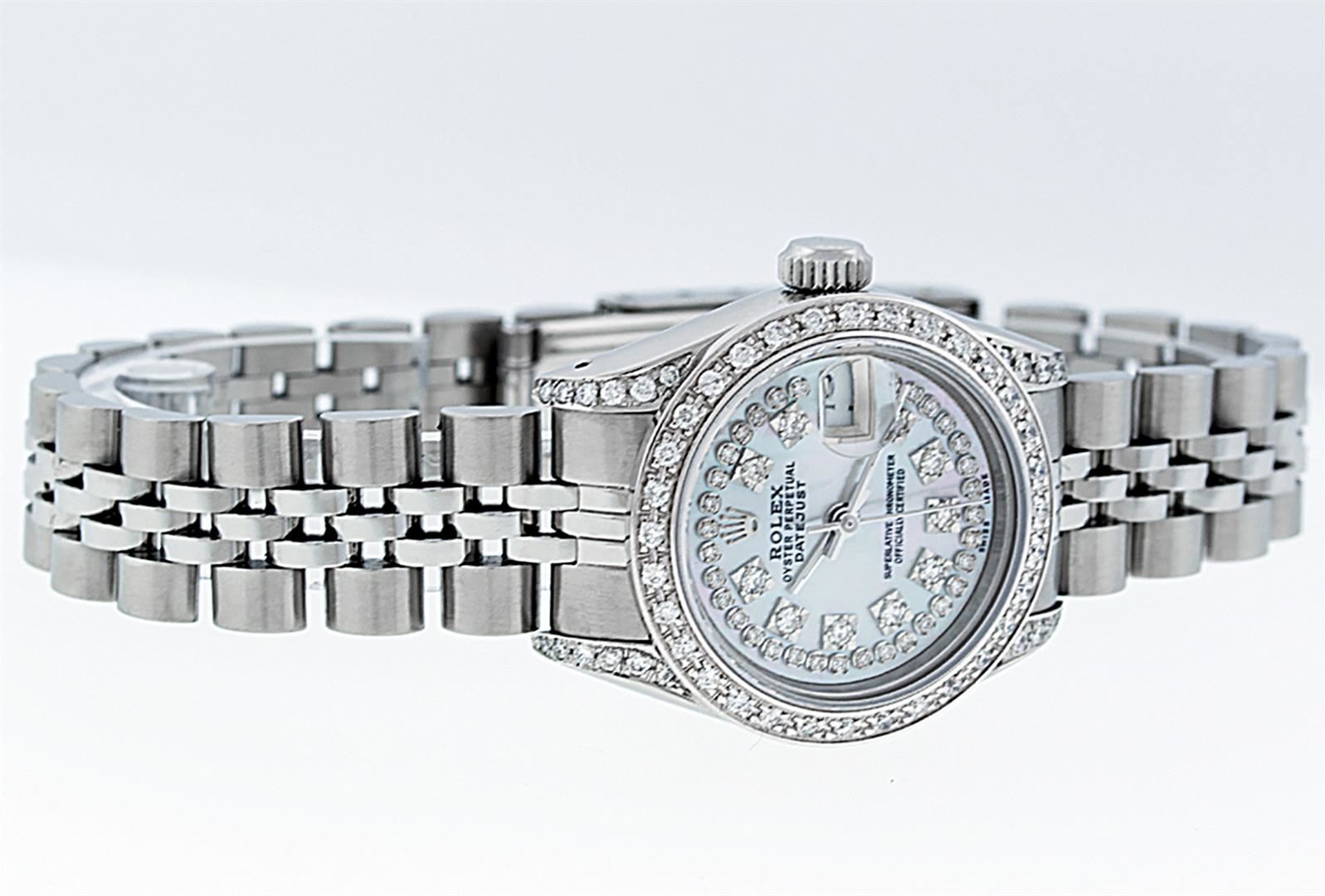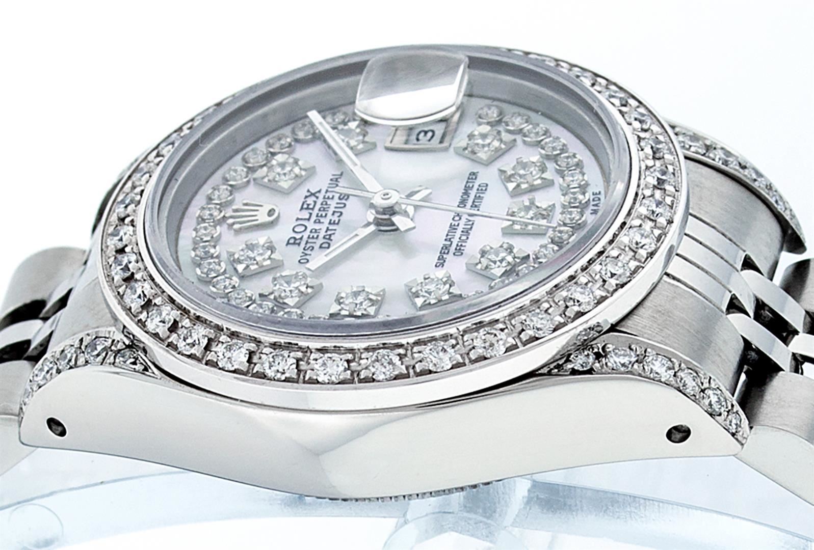One Ladies Stainless Steel Rolex Datejust Polished Bright with Satin Finish, Serviced & Electronically Tested, Stainless Steel Case: 26mm, Stainless Steel Crown, Diamond Lugs: 24 Diamonds On Lugs, Clarity: SI-VS, Color: G to H. Custom Bezel: New 18K White Gold Diamond Beadset Diamond Bezel, Stone Count: 32 Diamonds, Total Weight .70 Carat, Clarity: SI-VS, Color: G to H. Custom Crystal: New Synthetic Sapphire Cyclops Lens. Custom Hands: New Luminescent Hands. Movement: Automatic Winding Movement Caliber 2030. Custom Dial: Refinished Mother Of Pearl String Diamond Dial, 43 Diamonds in Dial G To H In Color, Clarity: VS. Date Window: 3 O'Clock Position Date Display, Model: Datejust. Condition: G-6 Extra Fine. Bracelet: Stainless Steel Jubilee. Bright Polish & Satin Finish. 6.0 Inch Length, Adjustable. Standard Clasp, With Rolex Logo. This Watch Has Been Serviced Time Tested And Is In Excellent Condition It Is Free Of All Scratches And Dents.