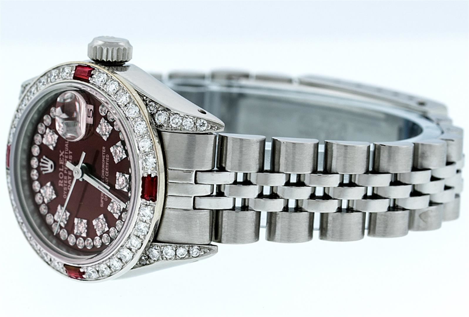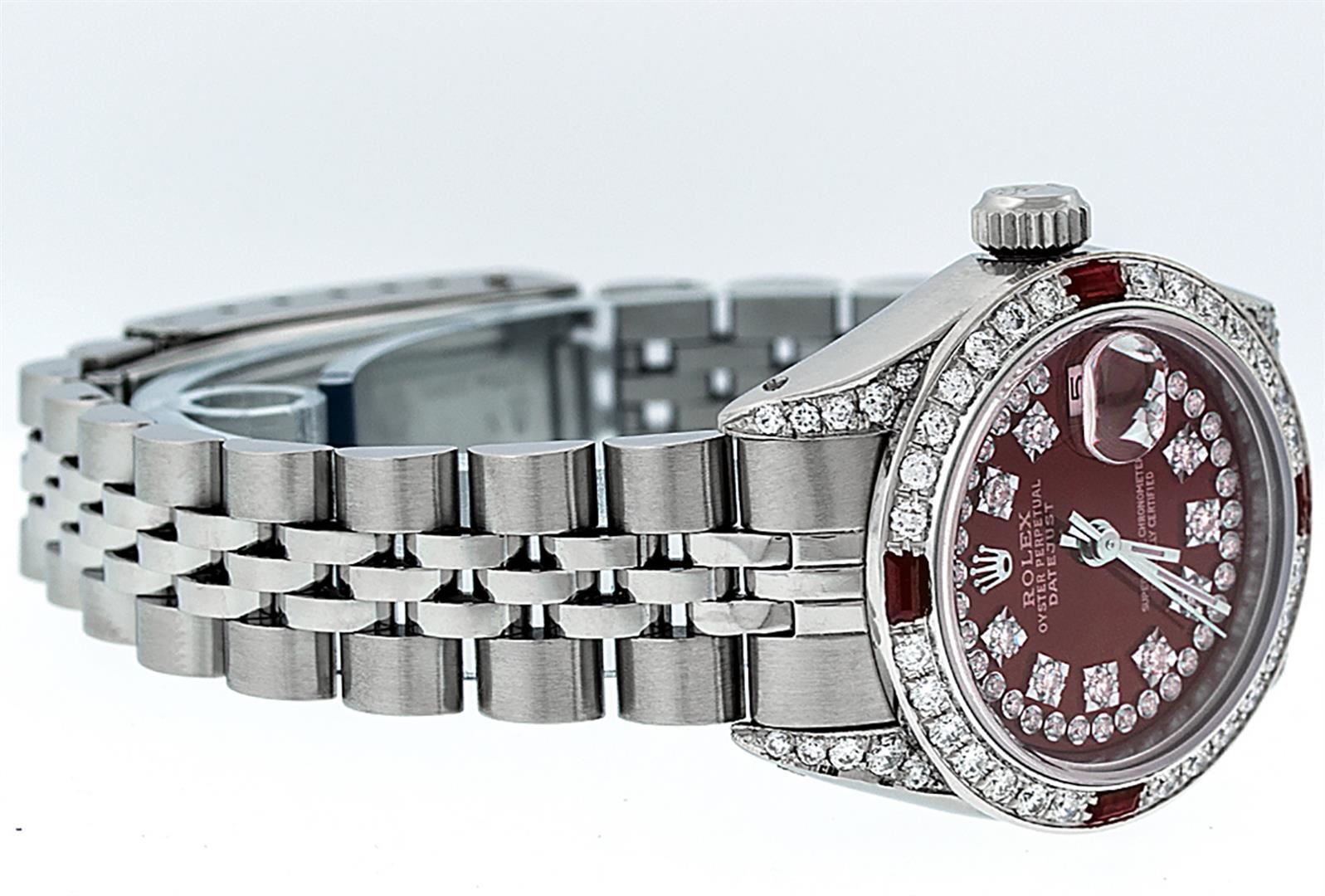 One Ladies Stainless Steel Rolex Datejust Polished Bright with Satin Finish, Serviced & Electronically Tested, Stainless Steel Case: 26mm, Stainless Steel Crown, Diamond Lugs: 24 Diamonds On Lugs, Clarity: SI-VS, Color: G to H. Custom Bezel: New 18K White Gold Diamond + Ruby Beadset Diamond Bezel, Stone Count: 28 Diamonds + 4 Rubies, Total Weight .70 Carat, Clarity: SI-VS, Color: G to H. Custom Crystal: New Synthetic Sapphire Cyclops Lens. Custom Hands: New Luminescent Hands. Movement: Automatic Winding Movement Caliber 2030. Custom Dial: Refinished Maroon String Diamond Dial, 43 Diamonds in Dial G To H In Color, Clarity: VS. Date Window: 3 O'Clock Position Date Display, Model: Datejust. Condition: G-6 Extra Fine. Bracelet: Stainless Steel Jubilee. Bright Polish & Satin Finish. 6.0 Inch Length, Adjustable. Standard Clasp, With Rolex Logo. This Watch Has Been Serviced Time Tested And Is In Excellent Condition It Is Free Of All Scratches And Dents.