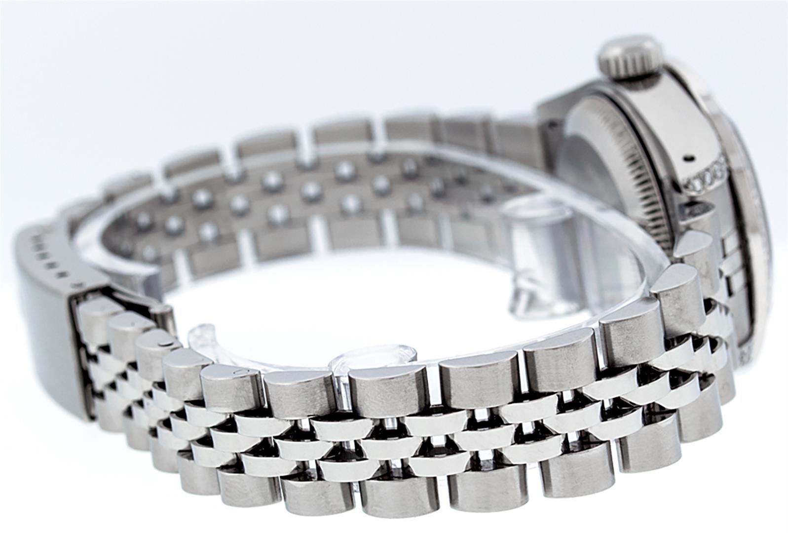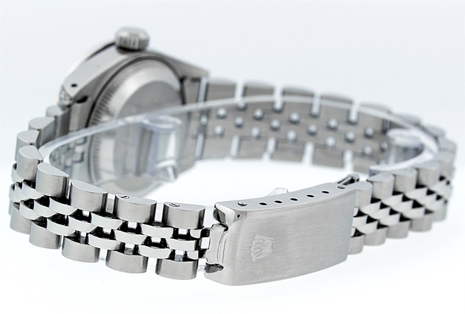 One Ladies Stainless Steel Rolex Datejust Polished Bright with Satin Finish, Serviced & Electronically Tested, Stainless Steel Case: 26mm, Stainless Steel Crown, Custom Diamond Lugs: 24 Diamonds On Lugs, Clarity: SI-VS, Color: G to H. Custom Bezel: New 18K White Gold Beadset Diamond Bezel, Stone Count: 32 Diamonds, Total Weight .70 Carat, Clarity: SI-VS, Color: G to H. Custom Crystal: New Scratch Resistant Synthetic Sapphire Cyclops Lens. Custom Hands: New Luminescent Hands. Movement: Automatic Winding Movement Caliber 2030. Custom Dial: Refinished Pink String Diamond Dial, 43 Diamonds in Dial G To H In Color, Clarity: VS. Date Window: 3 O'Clock Position Date Display, Model: Datejust. Condition: G-6 Extra Fine. Bracelet: Stainless Steel Jubilee Band. Bright Polish & Satin Finish. 6.0 Inch Length, Adjustable. Standard Clasp, With Rolex Logo. This Watch Has Been Serviced Time Tested And Is In Excellent Condition It Is Free Of All Scratches And Dents.