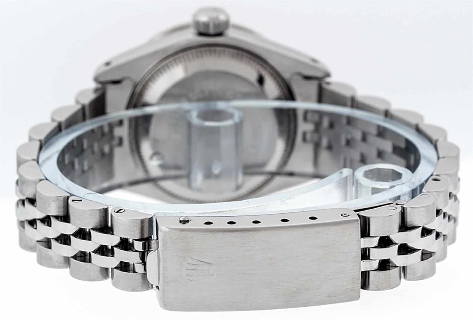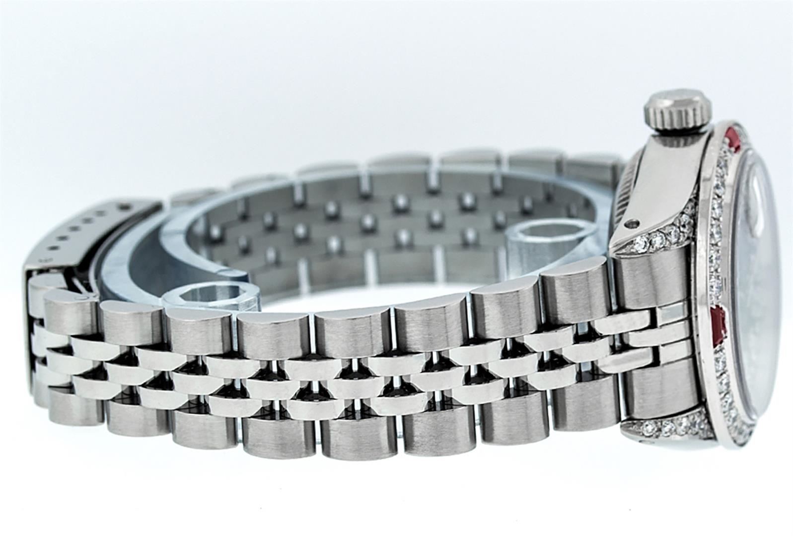 One Ladies Stainless Steel Rolex Datejust Polished Bright with Satin Finish, Serviced & Electronically Tested, Stainless Steel Case: 26mm, Stainless Steel Crown, Diamond Lugs: 24 Diamonds On Lugs, Clarity: SI-VS, Color: G to H. Custom Bezel: New 18K White Gold Diamond + Ruby Beadset Diamond Bezel, Stone Count: 28 Diamonds + 4 Rubies, Total Weight .70 Carat, Clarity: SI-VS, Color: G to H. Custom Crystal: New Scratch Resistant Synthetic Sapphire Cyclops Lens. Custom Hands: New Luminescent Hands. Movement: Automatic Winding Movement Caliber 2030. Custom Dial: Refinished Red String Diamond Dial, 43 Diamonds in Dial G To H In Color, Clarity: VS. Date Window: 3 O'Clock Position Date Display, Model: Datejust. Condition: G-6 Extra Fine. Bracelet: Stainless Steel Jubilee. Bright Polish & Satin Finish. 6.0 Inch Length, Adjustable. Standard Clasp, With Rolex Logo. This Watch Has Been Serviced Time Tested And Is In Excellent Condition It Is Free Of All Scratches And Dents.