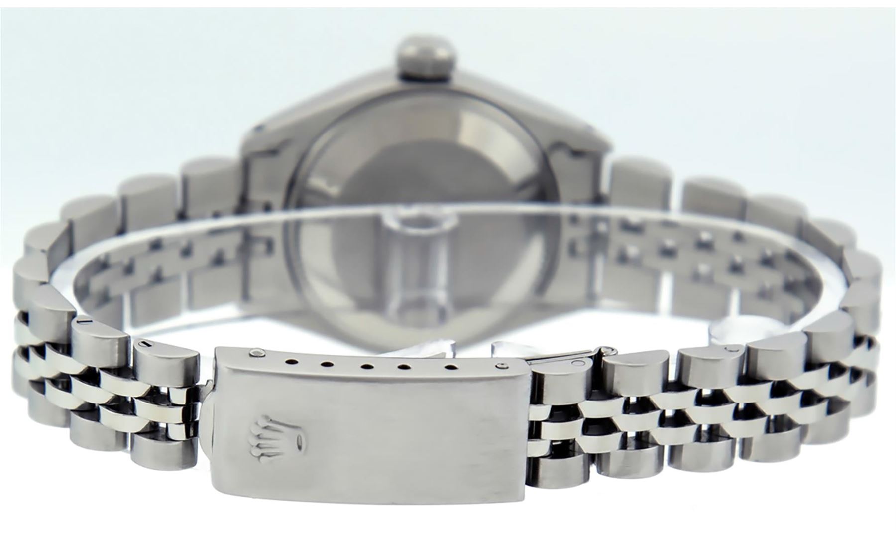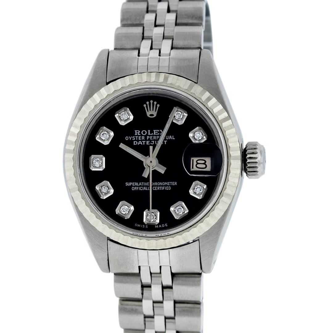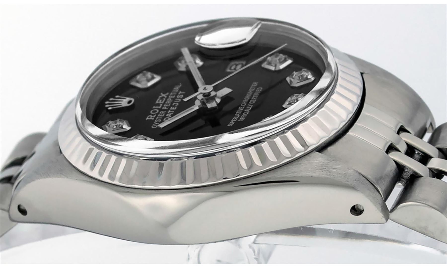 One Ladies Stainless Steel Rolex Datejust Polished Bright with Satin Finish, Serviced & Electronically Tested, Stainless Steel Case: 26mm, Stainless Steel Crown, Bezel: 14K White Gold Fluted Bezel. Custom Crystal: New Acrylic Cyclops Lens. Custom Hands: New Luminescent Hands. Movement: Automatic Winding Movement Caliber 2030. Dial: Black Diamond Dial, Diamond Count: 10 Diamonds In Dial, Color: G to H, Clarity: SI-VS. Date Window: 3 O'clock Position Date Display, Model: Datejust. Condition: G-6 Extra Fine. Bracelet: Stainless Steel Jubilee Band. Bright Polish & Satin Finish. 6.0 Inch Length, Adjustable. Standard Clasp, With Rolex Logo. This Watch Has Been Serviced Time Tested And Is In Excellent Condition It Is Free Of All Scratches And Dents.