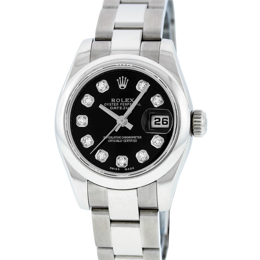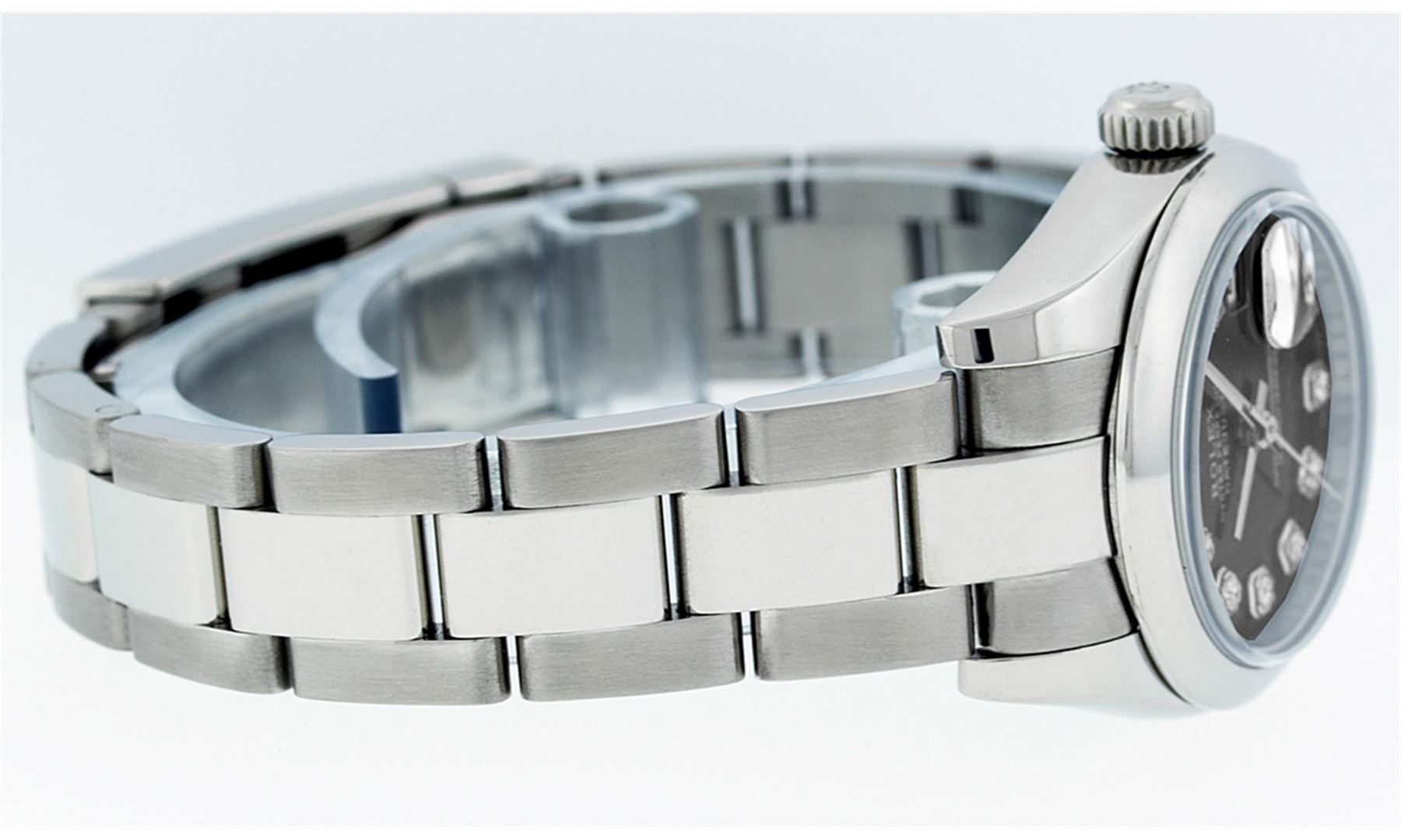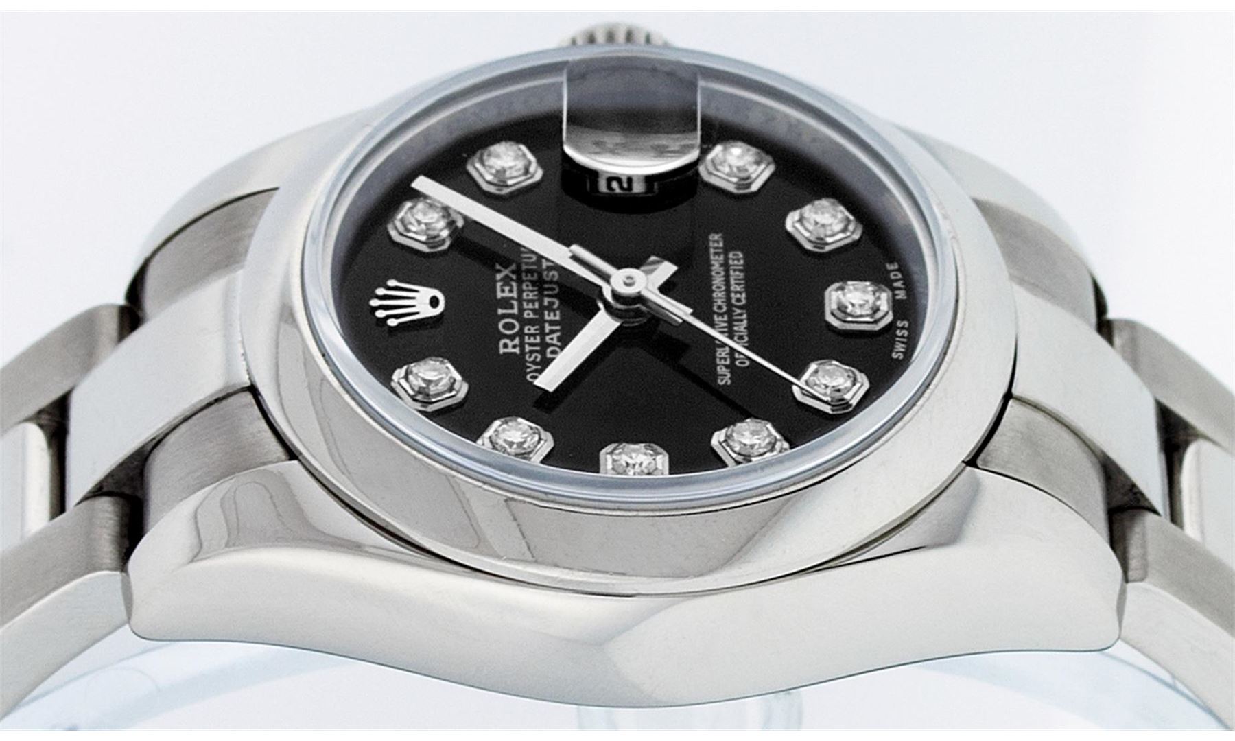 One Ladies Pre Owned Quickset Stainless Steel Rolex Datejust Polished Bright with Satin Finish, Serviced & Electronically Tested, Rolex Stainless Steel Case: 26mm, Rolex Stainless Steel Crown, Rolex Bezel: Stainless Steel Smooth Bezel. Custom Crystal: New Scratch Resistant Sapphire Cyclops Lens. Custom Hands: New Luminescent Hands. Rolex Movement: Automatic Winding 2230 Movement. Custom Dial: Refinished To Black With Added Single Cut VS Diamonds, Diamond Count: 10 Single Cut Diamonds In Dial, Color: G to H, Clarity: VS. Date Window: 3 O'Clock Position Date Display, Model: Caliber 2230 Quickset Datejust. Condition: G-6 Extra Fine. Rolex Bracelet: Stainless Steel Oyster Band. Bright Polish & Satin Finish. 6.0 Inch Length, Adjustable. Standard Clasp, With Rolex Logo. This Watch Has Been Serviced Time Tested And Is In Excellent Condition It Is Free Of All Scratches And Dents.