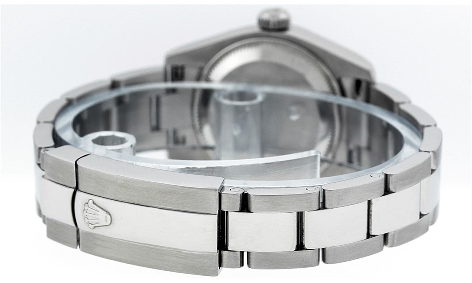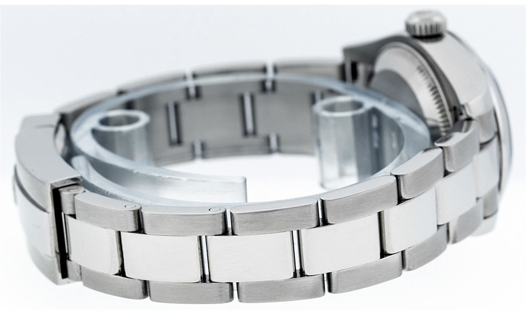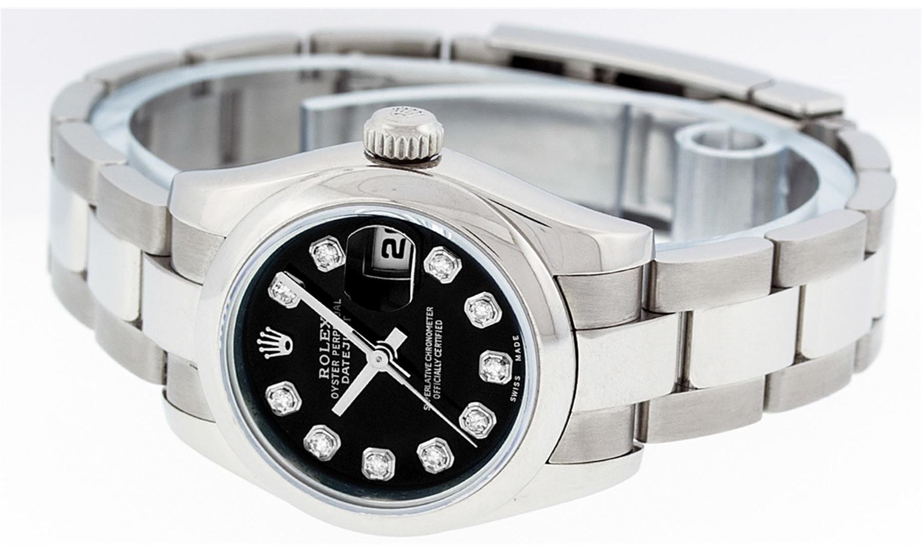 One Ladies Pre Owned Quickset Stainless Steel Rolex Datejust Polished Bright with Satin Finish, Serviced & Electronically Tested, Rolex Stainless Steel Case: 26mm, Rolex Stainless Steel Crown, Rolex Bezel: Stainless Steel Smooth Bezel. Custom Crystal: New Scratch Resistant Sapphire Cyclops Lens. Custom Hands: New Luminescent Hands. Rolex Movement: Automatic Winding 2230 Movement. Custom Dial: Refinished To Black With Added Single Cut VS Diamonds, Diamond Count: 10 Single Cut Diamonds In Dial, Color: G to H, Clarity: VS. Date Window: 3 O'Clock Position Date Display, Model: Caliber 2230 Quickset Datejust. Condition: G-6 Extra Fine. Rolex Bracelet: Stainless Steel Oyster Band. Bright Polish & Satin Finish. 6.0 Inch Length, Adjustable. Standard Clasp, With Rolex Logo. This Watch Has Been Serviced Time Tested And Is In Excellent Condition It Is Free Of All Scratches And Dents.