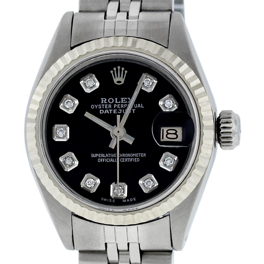 One Ladies Stainless Steel Rolex Datejust Polished Bright with Satin Finish, Serviced & Electronically Tested, Stainless Steel Case: 26mm, Stainless Steel Crown, Bezel: 14K White Gold Fluted Bezel. Custom Crystal: New Acrylic Cyclops Lens. Custom Hands: New Luminescent Hands. Movement: Automatic Winding Movement. Dial: Black Diamond Dial, Diamond Count: 10 Diamonds In Dial, Color: G to H, Clarity: SI-VS. Date Window: 3 O'clock Position Date Display, Model: Datejust. Condition: G-6 Extra Fine. Bracelet: Stainless Steel Jubilee Band. Bright Polish & Satin Finish. 6.0 Inch Length, Adjustable. Standard Clasp, With Rolex Logo. This Watch Has Been Serviced Time Tested And Is In Excellent Condition It Is Free Of All Scratches And Dents.