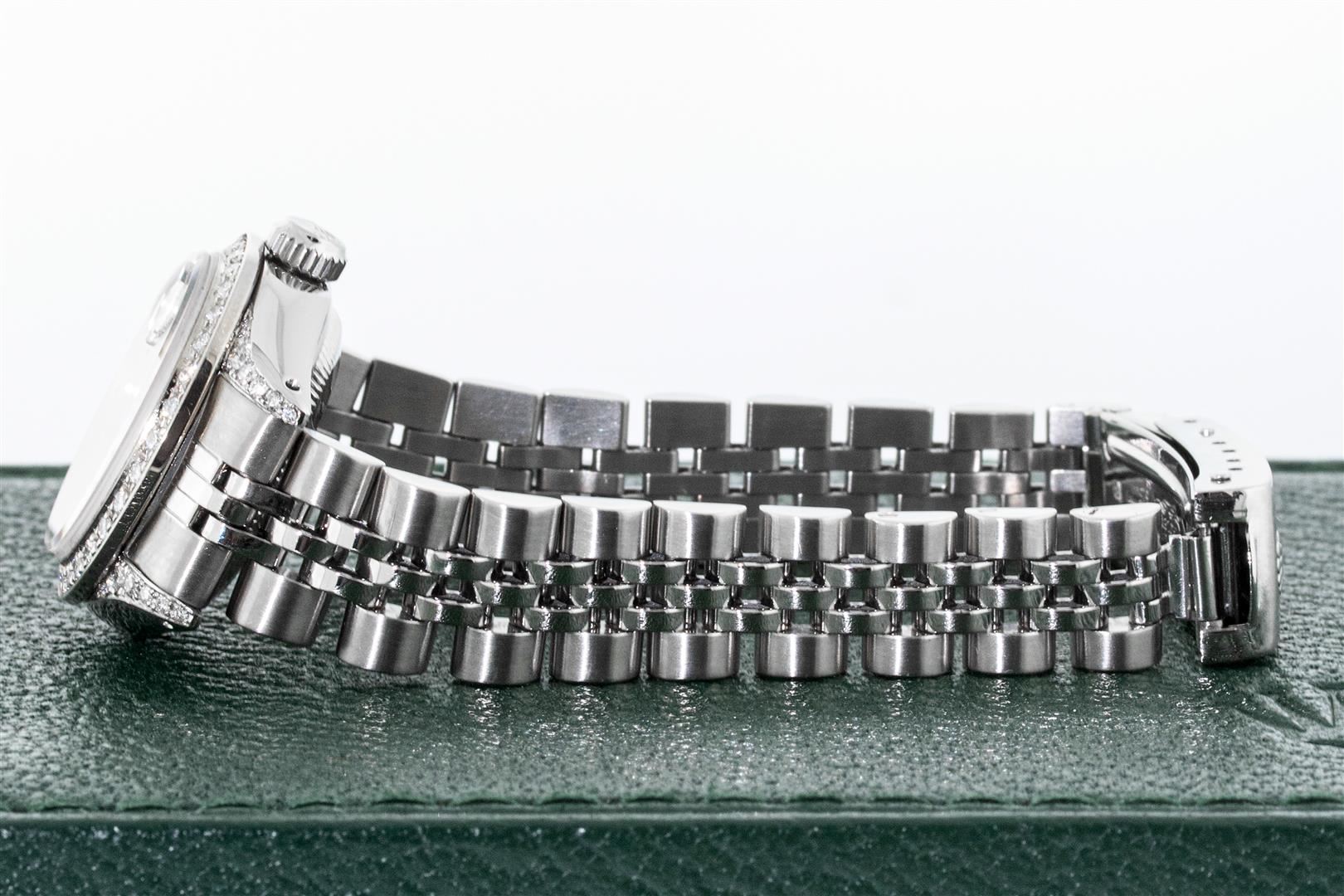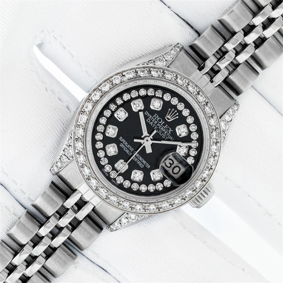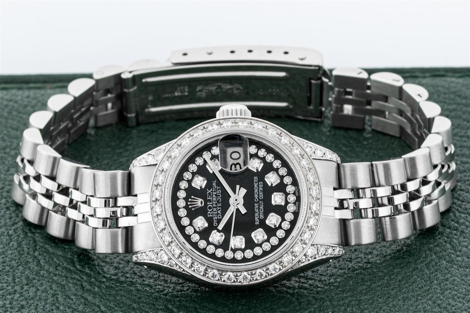 One Ladies Stainless Steel Rolex Datejust Polished Bright with Satin Finish, Serviced & Electronically Tested, Rolex Stainless Steel Case: 26mm, Rolex Stainless Steel Crown, Diamond Lugs: 24 Diamonds On Lugs, Clarity: SI-VS, Color: G to H. Custom Bezel: New 18K White Gold Beadset Diamond Bezel, Diamond Count: 32 Diamonds Total Weight 1.00 Carat, Clarity: SI-VS, Color: G to H. Custom Crystal: New Sapphire With Magnified Date Window. Custom Hands: New Luminescent Hands. Rolex Movement: Automatic Winding Movement. Custom Dial: Refinished To Black With Added Diamond Hour Markers, 43 Diamonds in Dial G To H In Color, Clarity: SI-VS. Date Window: 3 O'clock Position Date Display, Model: Datejust. Condition: G-6 Extra Fine. Rolex Bracelet: Stainless Steel Jubilee Band. Bright Polish & Satin Finish. 6.0 Inch Length, Adjustable. Standard Clasp, With Rolex Logo. This Pre Owned Watch Has Been Serviced Time Tested And Is In Excellent Condition It Is Free Of All Scratches And Dents. This Watch Comes With A Rolex Box.