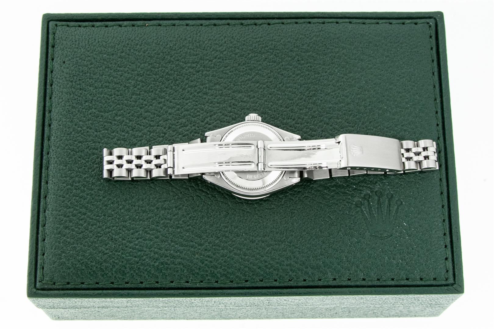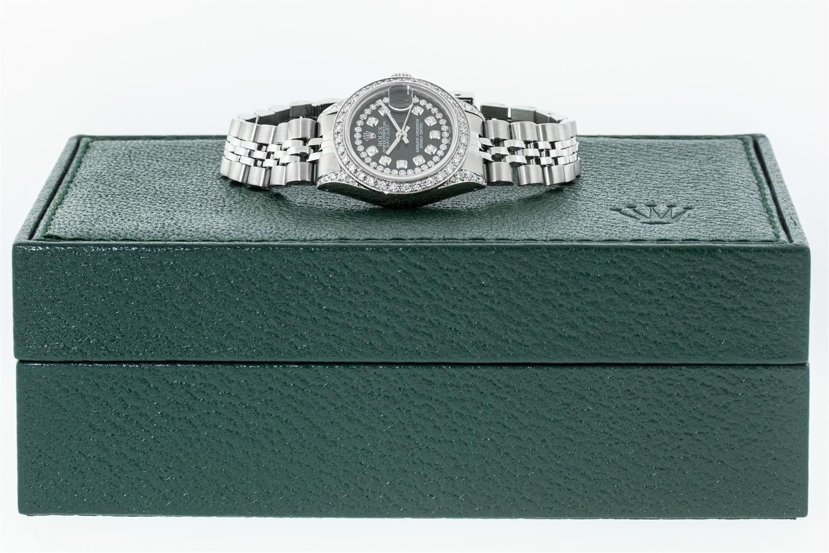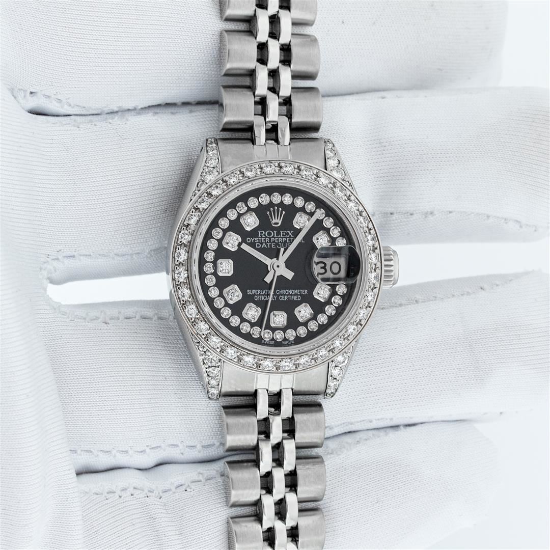 One Ladies Stainless Steel Rolex Datejust Polished Bright with Satin Finish, Serviced & Electronically Tested, Rolex Stainless Steel Case: 26mm, Rolex Stainless Steel Crown, Diamond Lugs: 24 Diamonds On Lugs, Clarity: SI-VS, Color: G to H. Custom Bezel: New 18K White Gold Beadset Diamond Bezel, Diamond Count: 32 Diamonds Total Weight 1.00 Carat, Clarity: SI-VS, Color: G to H. Custom Crystal: New Sapphire With Magnified Date Window. Custom Hands: New Luminescent Hands. Rolex Movement: Automatic Winding Movement. Custom Dial: Refinished To Black With Added Diamond Hour Markers, 43 Diamonds in Dial G To H In Color, Clarity: SI-VS. Date Window: 3 O'clock Position Date Display, Model: Datejust. Condition: G-6 Extra Fine. Rolex Bracelet: Stainless Steel Jubilee Band. Bright Polish & Satin Finish. 6.0 Inch Length, Adjustable. Standard Clasp, With Rolex Logo. This Pre Owned Watch Has Been Serviced Time Tested And Is In Excellent Condition It Is Free Of All Scratches And Dents. This Watch Comes With A Rolex Box.