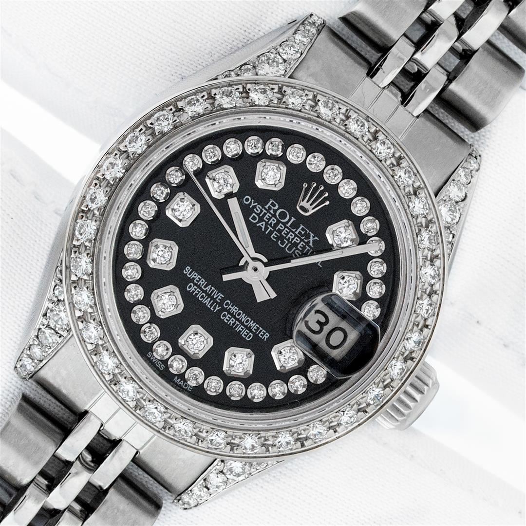 One Ladies Stainless Steel Rolex Datejust Polished Bright with Satin Finish, Serviced & Electronically Tested, Rolex Stainless Steel Case: 26mm, Rolex Stainless Steel Crown, Diamond Lugs: 24 Diamonds On Lugs, Clarity: SI-VS, Color: G to H. Custom Bezel: New 18K White Gold Beadset Diamond Bezel, Diamond Count: 32 Diamonds Total Weight 1.00 Carat, Clarity: SI-VS, Color: G to H. Custom Crystal: New Sapphire With Magnified Date Window. Custom Hands: New Luminescent Hands. Rolex Movement: Automatic Winding Movement. Custom Dial: Refinished To Black With Added Diamond Hour Markers, 43 Diamonds in Dial G To H In Color, Clarity: SI-VS. Date Window: 3 O'clock Position Date Display, Model: Datejust. Condition: G-6 Extra Fine. Rolex Bracelet: Stainless Steel Jubilee Band. Bright Polish & Satin Finish. 6.0 Inch Length, Adjustable. Standard Clasp, With Rolex Logo. This Pre Owned Watch Has Been Serviced Time Tested And Is In Excellent Condition It Is Free Of All Scratches And Dents. This Watch Comes With A Rolex Box.
