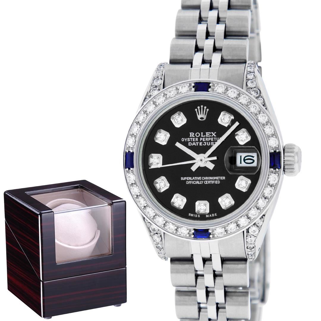 One Ladies Stainless Steel Rolex Datejust Polished Bright with Satin Finish, Serviced & Electronically Tested, Stainless Steel Case: 26mm, Stainless Steel Crown, Diamond Lugs: 24 Diamonds On Lugs, Clarity: SI-VS, Color: G to H. Custom Bezel: New 18K White Gold Diamond & Sapphire Beadset Bezel, Diamond Count: 28 Diamonds + 4 Sapphires, Total Weight .70 Carats, Clarity: SI-VS, Color: G to H. Custom Crystal: New Scratch Resistant Synthetic Sapphire Cyclops Lens. Custom Hands: New Luminescent Hands. Movement: Automatic Winding Movement Caliber 2030. Custom Dial: Refinished Black Diamond Dial, 10 Diamonds in Dial, G To H In Color, Clarity: SI-VS. Date Window: 3 O'Clock Position Date Display, Model: Datejust Condition: G-6 Extra Fine. Bracelet: Stainless Steel Jubilee Band. Bright Polish & Satin Finish. 6.0 Inch Length, Adjustable. Standard Clasp, With Rolex Logo. This Watch Has Been Serviced Time Tested And Is In Excellent Condition It Is Free Of All Scratches And Dents. This Watch Comes With A Brand New Watch Winder.