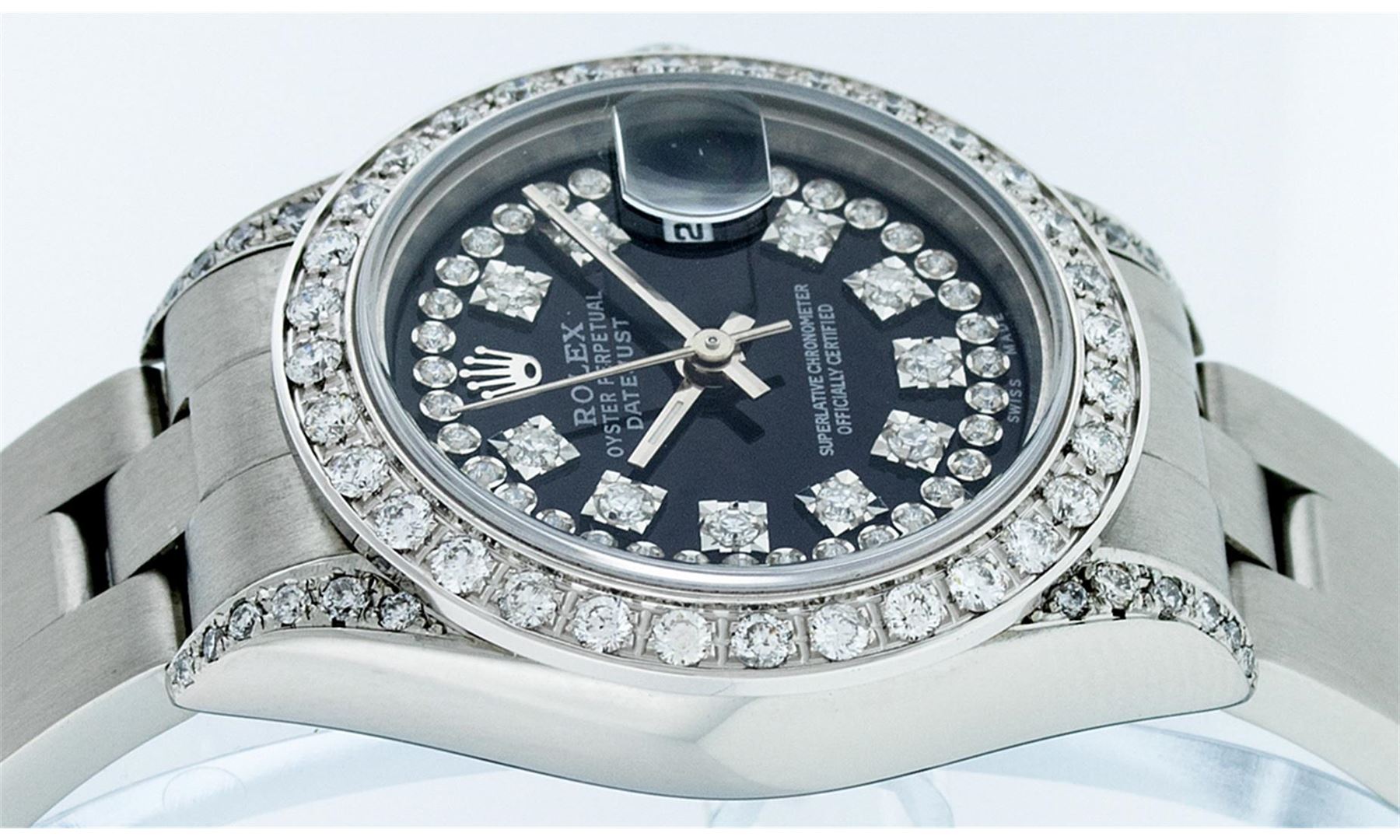 One Ladies Stainless Steel Quickset Rolex Datejust Polished Bright with Satin Finish, Serviced & Electronically Tested, Stainless Steel Case: 26mm, Stainless Steel Crown, Custom Diamond Lugs: 24 Diamonds On Lugs, Clarity: SI-VS, Color: G to H. Custom Bezel: New 18K White Gold Beadset Diamond Bezel, Diamond Count: 32 Diamonds Total Weight .70 Carat, Clarity: SI-VS, Color: G to H. Custom Crystal: New Scratch Resistant Synthetic Sapphire Cyclops Lens. Custom Hands: New Luminescent Hands. Movement: Automatic Quickset Winding Movement. Custom Dial: Refinished Black With String Diamond Dial, 43 Single Cut Diamonds in Dial G To H In Color, Clarity: SI-VS. Date Window: 3 O'Clock Position Date Display, Model: Quickset Datejust. Condition: G-6 Extra Fine. Bracelet: Stainless Steel Oyster Band. Bright Polish & Satin Finish. 6.0 Inch Length, Adjustable. Standard Clasp, With Rolex Logo. This Watch Has Been Serviced Time Tested And Is In Excellent Condition It Is Free Of All Scratches And Dents.
