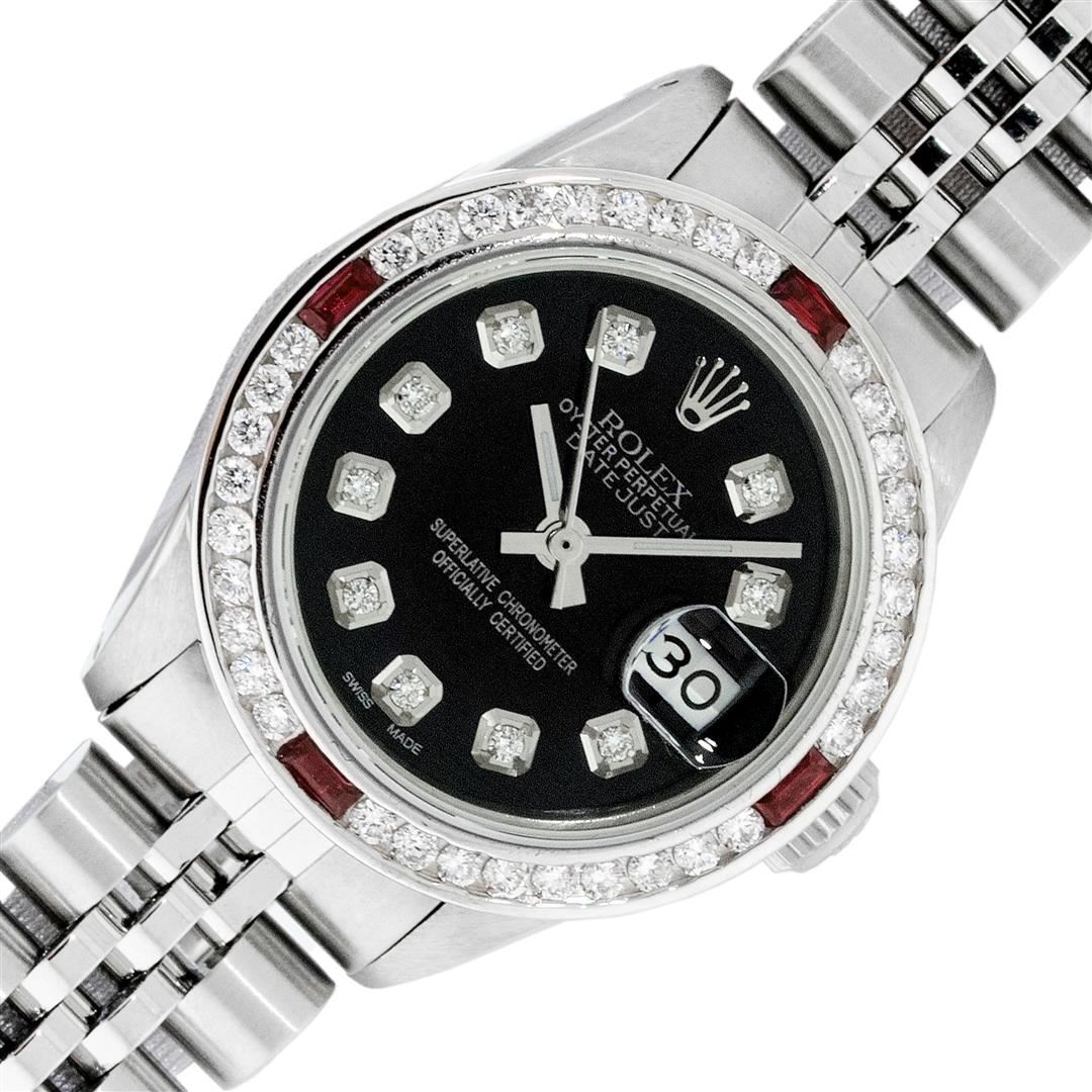 One Ladies Stainless Steel Rolex Datejust Polished Bright with Satin Finish, Serviced & Electronically Tested, Stainless Steel Case: 26mm, Stainless Steel Crown, Custom Bezel: New 18K White Gold Black Channel Set Diamond Bezel, Diamond + Gem Count: 36 Diamonds + 4 Ruby Total Weight 1.00 Carat, Clarity: SI-VS, Color: G to H. Custom Crystal: New Sapphire With Date Window. Custom Hands: New Luminescent Hands. Rolex Movement: Automatic Winding Movement. Custom Dial: Refinished To Black With Diamond Hour Markers. Date Window: 3 O'Clock Position Date Display, Model: Datejust. Condition: G-6 Extra Fine. Rolex Bracelet: Stainless Steel Jubilee. Bright Polish & Saiin Finish. 6.0 Inch Length, Adjustable. Standard Clasp, With Rolex Logo. This Watch Has Been Serviced Time Tested And Is In Excellent Condition It Is Free Of All Scratches And Dents. This Watch Comes With A Rolex Box.