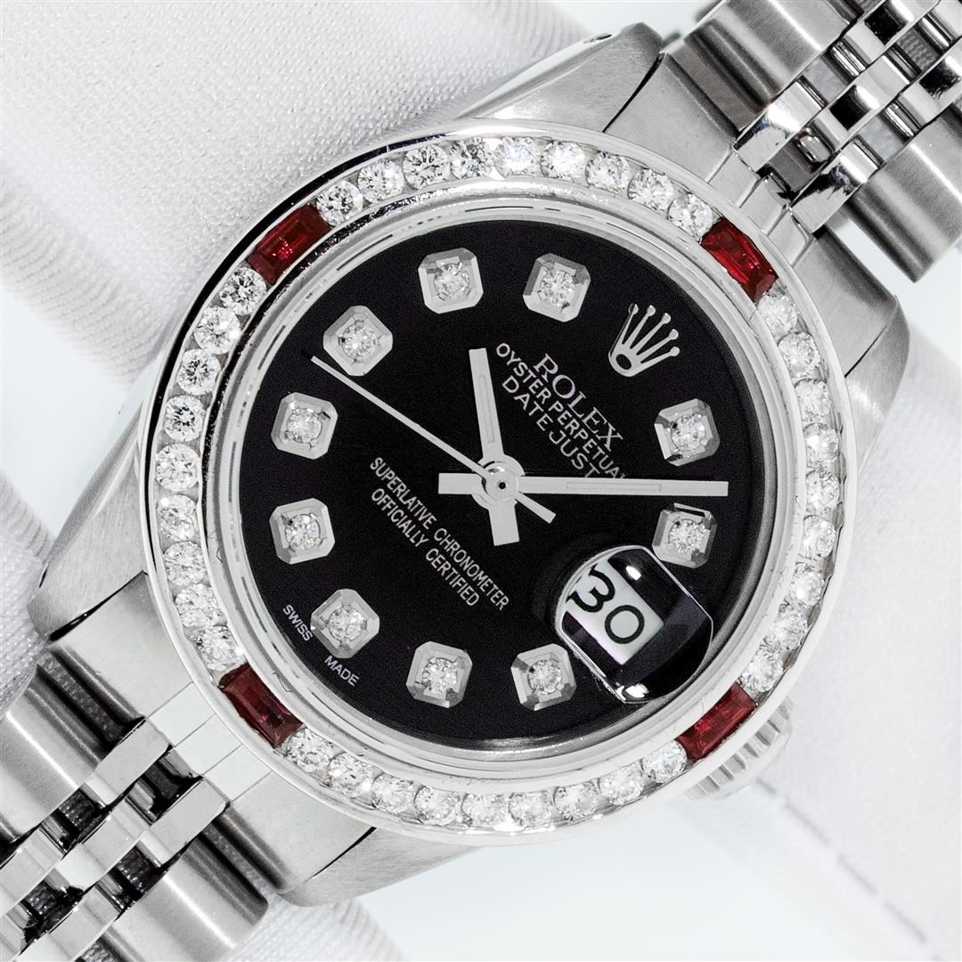 One Ladies Stainless Steel Rolex Datejust Polished Bright with Satin Finish, Serviced & Electronically Tested, Stainless Steel Case: 26mm, Stainless Steel Crown, Custom Bezel: New 18K White Gold Black Channel Set Diamond Bezel, Diamond + Gem Count: 36 Diamonds + 4 Ruby Total Weight 1.00 Carat, Clarity: SI-VS, Color: G to H. Custom Crystal: New Sapphire With Date Window. Custom Hands: New Luminescent Hands. Rolex Movement: Automatic Winding Movement. Custom Dial: Refinished To Black With Diamond Hour Markers. Date Window: 3 O'Clock Position Date Display, Model: Datejust. Condition: G-6 Extra Fine. Rolex Bracelet: Stainless Steel Jubilee. Bright Polish & Saiin Finish. 6.0 Inch Length, Adjustable. Standard Clasp, With Rolex Logo. This Watch Has Been Serviced Time Tested And Is In Excellent Condition It Is Free Of All Scratches And Dents. This Watch Comes With A Rolex Box.