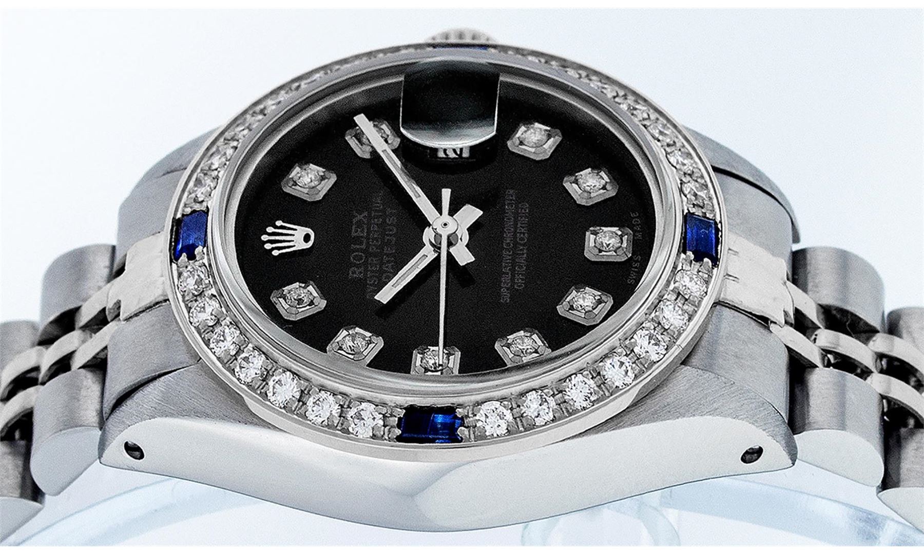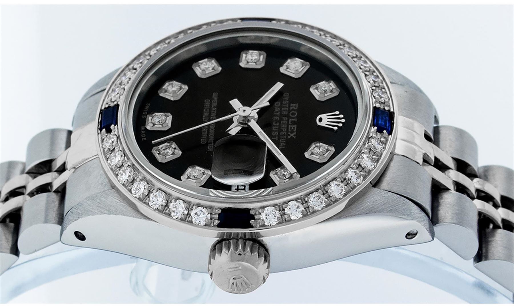 One Ladies Stainless Steel Rolex Datejust Polished Bright with Satin Finish, Serviced & Electronically Tested, Stainless Steel Case: 26mm, Stainless Steel Crown, Custom Bezel: New 18K White Gold Sapphire Beadset Diamond Bezel, Diamond + Gem Count: 28 Diamonds + 4 Sapphires. Total Weight .70 Carat, Clarity: SI-VS, Color: G to H. Custom Crystal: New Synthetic Sapphire Cyclops Lens. Custom Hands: New Luminescent Hands. Movement: Automatic Winding Movement Caliber 2030. Custom Dial: Refinished Black With Diamond Hour Markers, Diamond Count: 10 Diamond in Dial, G To H In Color, Clarity: SI-VS. Date Window: 3 O'clock Position Date Display, Model: Datejust. Condition: G-6 Extra Fine. Bracelet: Stainless Steel Jubilee. Bright Polish & Satin Finish. 6.0 Inch Length, Adjustable. Standard Clasp, With Rolex Logo. This Watch Has Been Serviced Time Tested And Is In Excellent Condition It Is Free Of All Scratches And Dents.