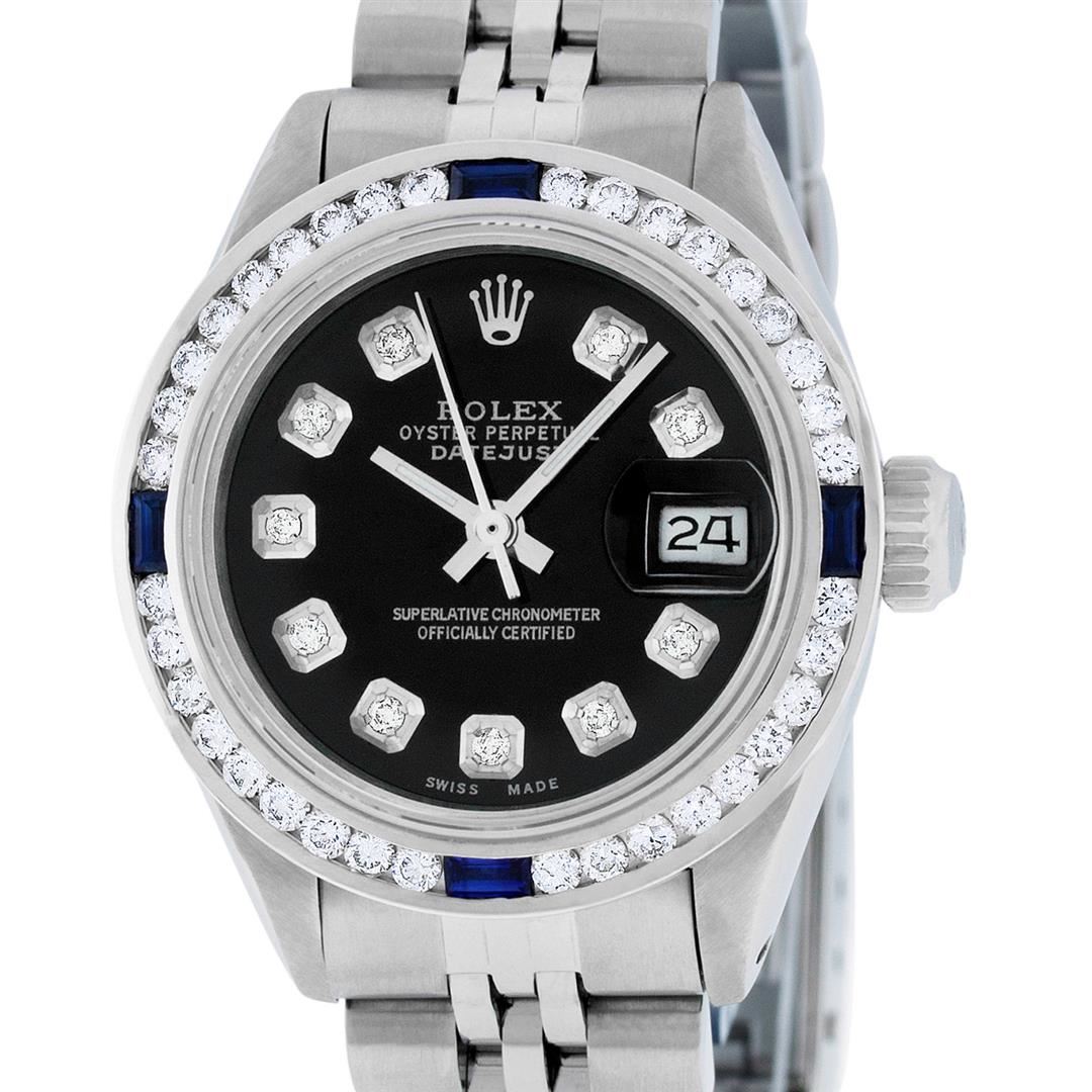 One Ladies Stainless Steel Rolex Oyster Perpetual Datejust Polished Bright with Satin Finish, Serviced & Electronically Tested, Stainless Steel Case: 26mm, Stainless Steel Crown, Custom Bezel: New 18K 1.0ctw White Gold Sapphire Channel Set Diamond Bezel, Diamond + Gem Count: 36 Diamonds + 4 Sapphires, Total Weight 1.00 Carat, Clarity: SI-VS, Color: G to H. Custom Crystal: New Synthetic Sapphire Cyclops Lens. Custom Hands: New Luminescent Hands. Movement: Automatic Winding Movement. Custom Dial: Refinished Black With Diamond Hour Markers. Date Window: 3 O'clock Position Date Display, Model: Datejust. Condition: G-6 Extra Fine. Bracelet: Stainless Steel Jubilee Band. Bright Polish & Satin Finish. 6.0 Inch Length, Adjustable. Standard Clasp, With Rolex Logo. This Watch Has Been Serviced Time Tested And Is In Excellent Condition It Is Free Of All Scratches And Dents.