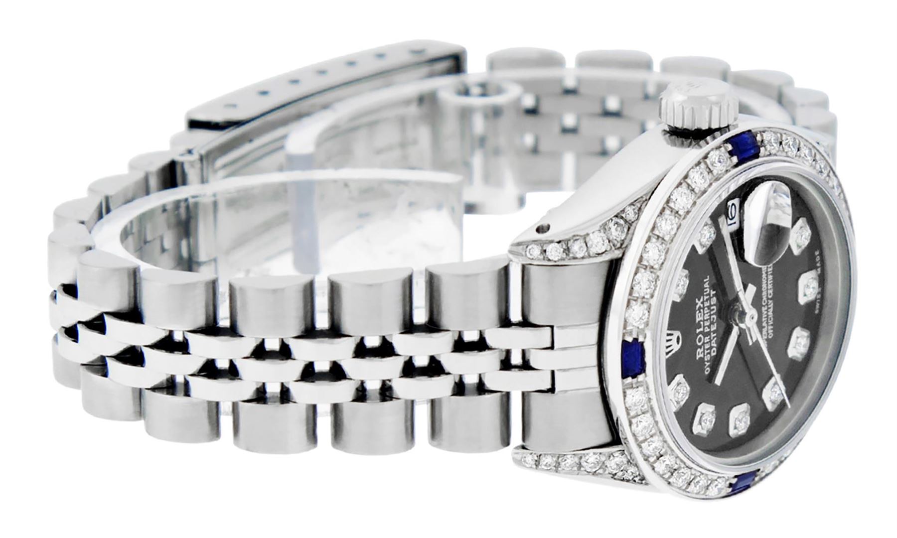 One Ladies Stainless Steel Rolex Datejust Polished Bright with Satin Finish, Serviced & Electronically Tested, Stainless Steel Case: 26mm, Stainless Steel Crown, Diamond Lugs: 24 Diamonds On Lugs, Clarity: SI-VS, Color: G to H. Custom Bezel: New 18K White Gold Diamond & Sapphire Beadset Bezel, Diamond Count: 28 Diamonds + 4 Sapphires, Total Weight .70 Carats, Clarity: SI-VS, Color: G to H. Custom Crystal: New Scratch Resistant Synthetic Sapphire Cyclops Lens. Custom Hands: New Luminescent Hands. Movement: Automatic Winding Movement. Custom Dial: Refinished Black Diamond Dial, 10 Diamonds in Dial, G To H In Color, Clarity: SI-VS. Date Window: 3 O'clock Position Date Display, Model: Datejust Condition: G-6 Extra Fine. Bracelet: Stainless Steel Jubilee Band. Bright Polish & Satin Finish. 6.0 Inch Length, Adjustable. Standard Clasp, With Rolex Logo. This Watch Has Been Serviced Time Tested And Is In Excellent Condition It Is Free Of All Scratches And Dents.