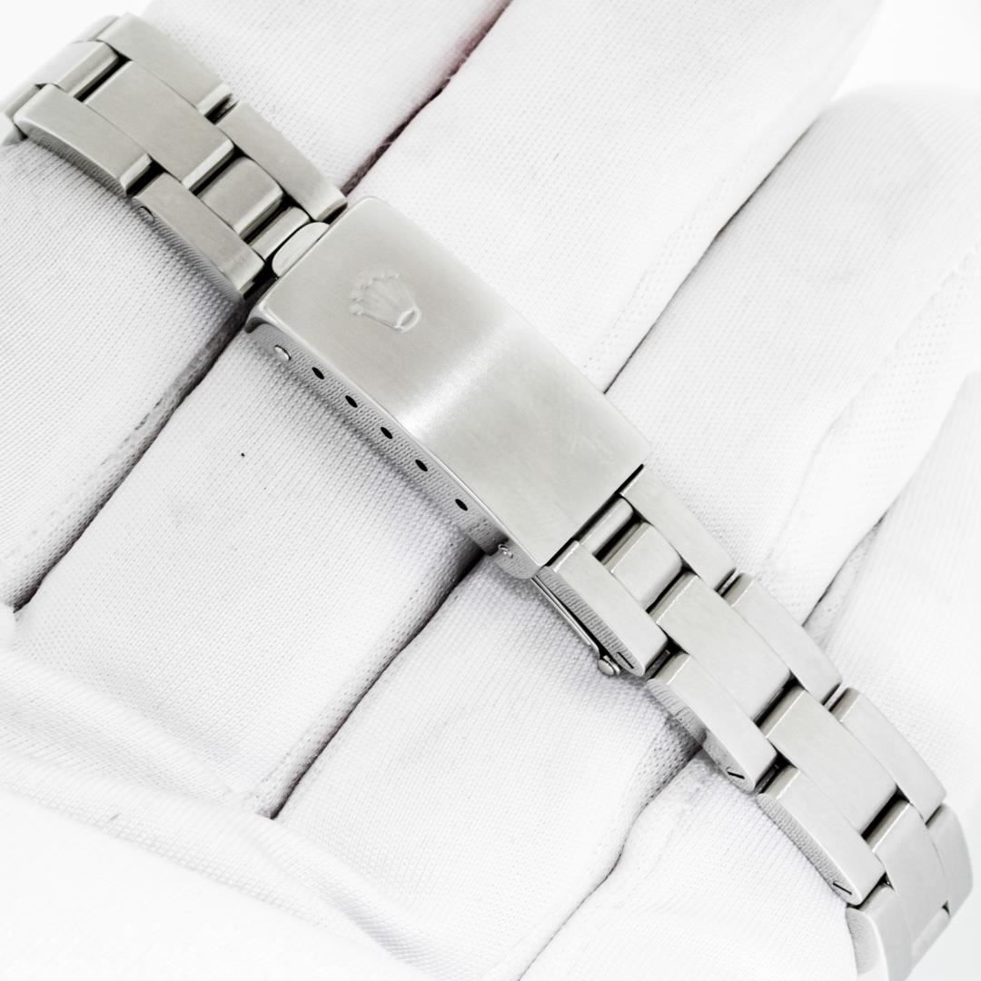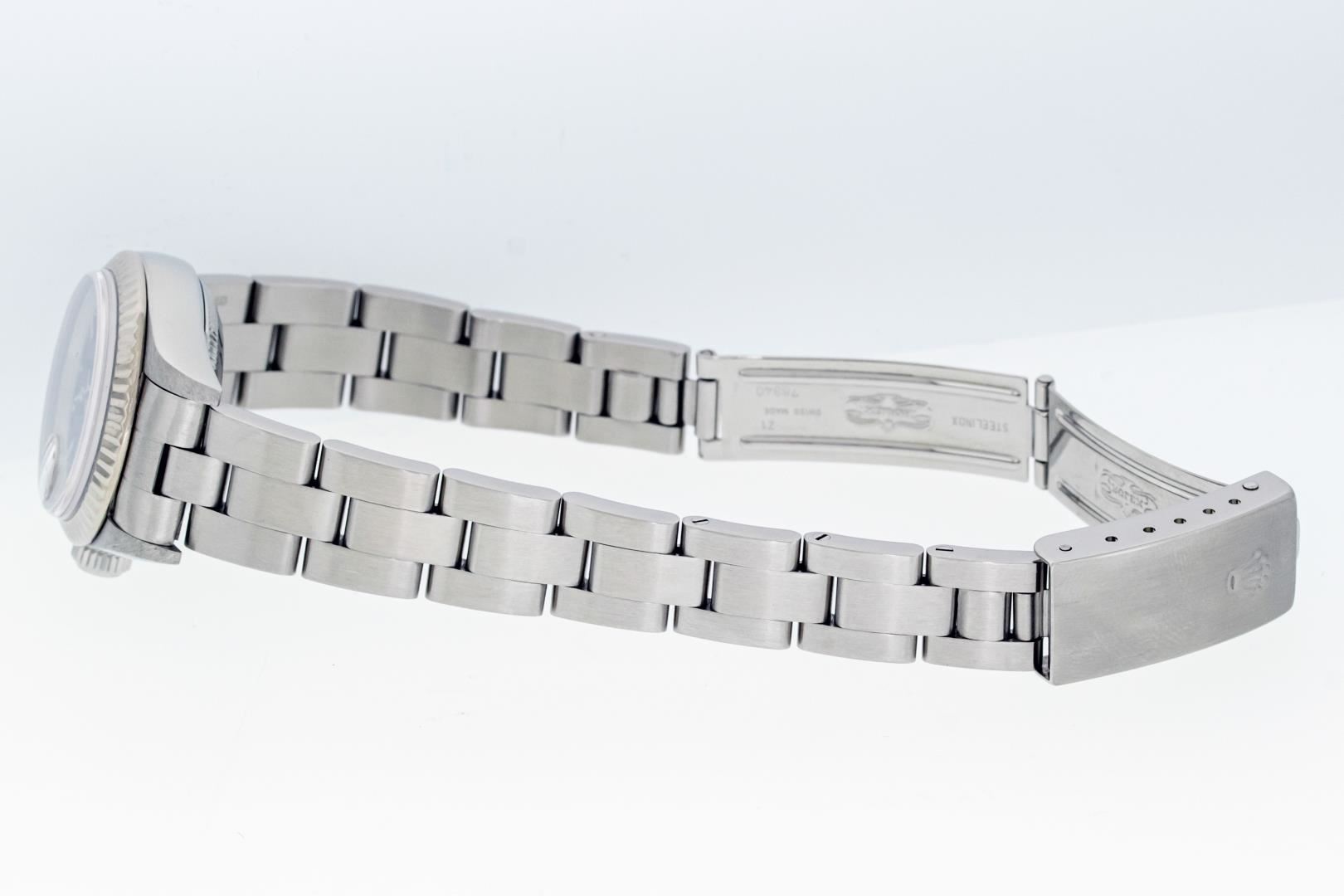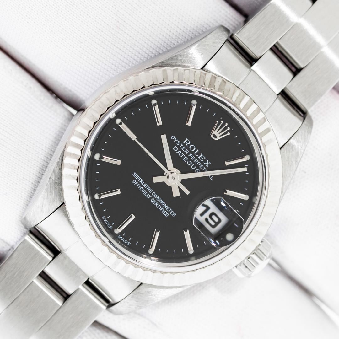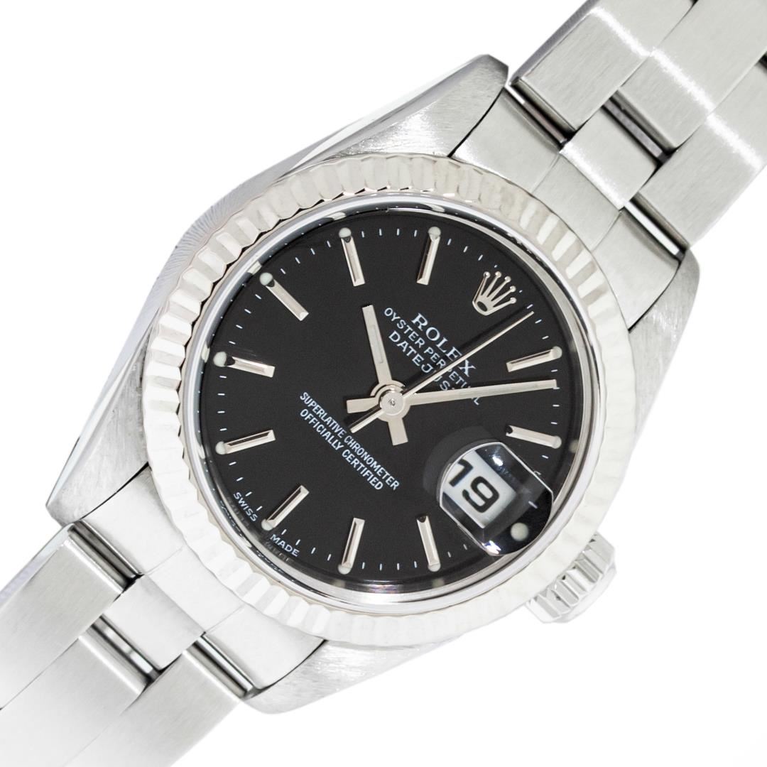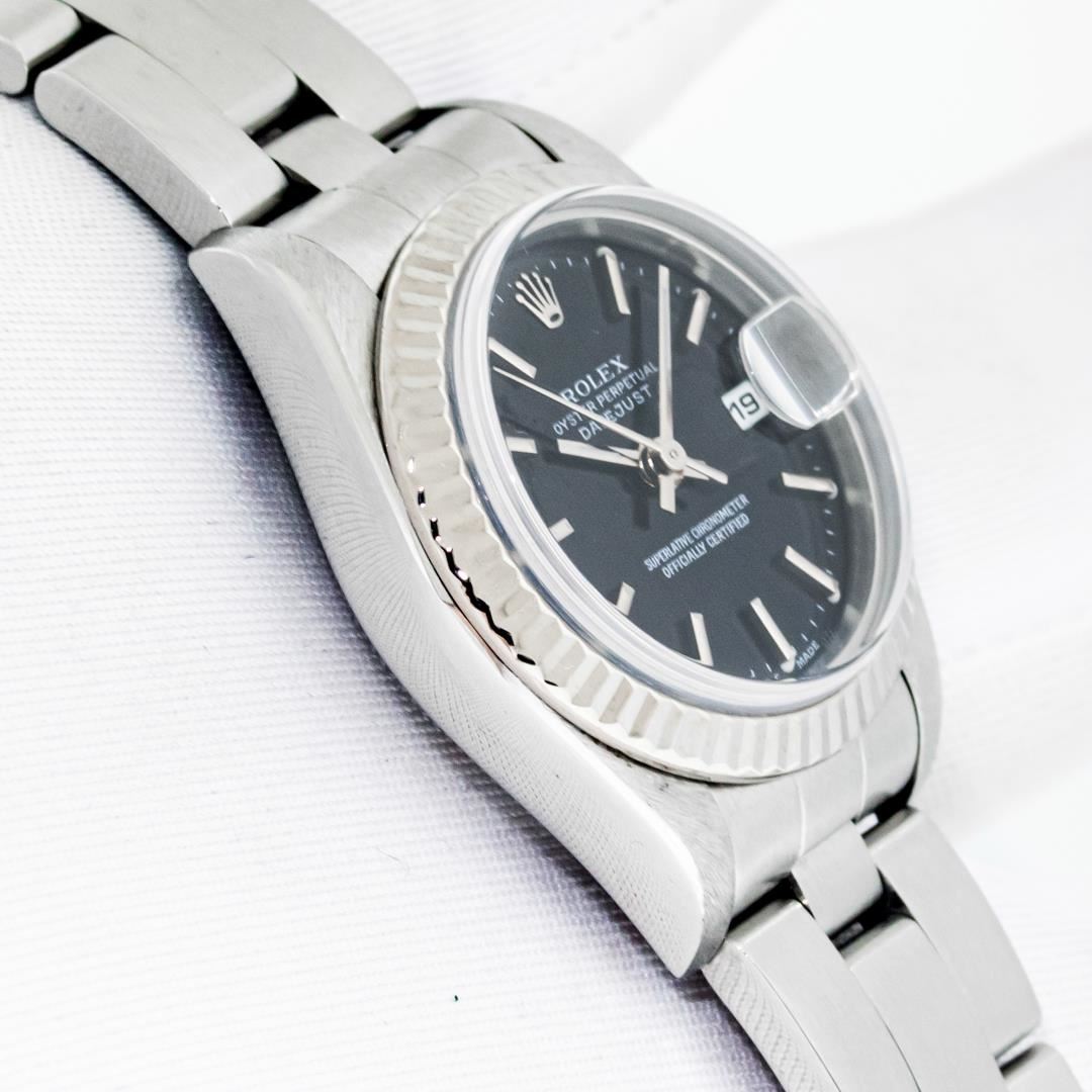 One Ladies Pre Owned Quickset Stainless Steel Rolex Datejust Polished Bright with Satin Finish, Serviced & Electronically Tested, Stainless Steel Case: 26mm, Rolex Stainless Steel Crown, Rolex Bezel: 18K White Gold Fluted Bezel. Crystal: Sapphire With Magnified Date Window. Custom Hands: Luminescent Hands. Rolex Movement: Automatic Winding Movement 2235. Rolex Dial: Black Index With Dash Track. Date Window: 3 O'Clock Position Date Display, Model: Datejust. Condition: G-6 Extra Fine. Rolex Bracelet: Stainless Steel Oyster Band. Bright Polish & Satin Finish. 6.0 Inch Length, Adjustable. Standard Clasp, With Rolex Logo. This Watch Has Been Serviced Time Tested And Is In Excellent Condition It Is Free Of All Scratches And Dents.