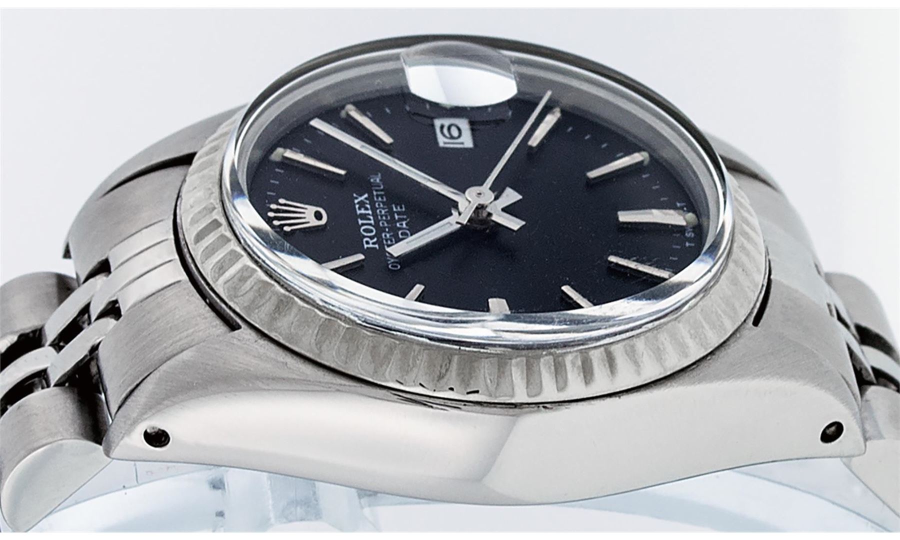 One Ladies Stainless Steel Rolex Datejust Polished Bright with Satin Finish, Serviced & Electronically Tested, Stainless Steel Case: 26mm, Stainless Steel Crown, Bezel: 14K White Gold Fluted Bezel. Custom Crystal: New Acrylic Cyclops Lens. Custom Hands: New Luminescent Hands. Movement: Automatic Winding Movement Caliber 2030. Dial: Black Index Dial With Dash Track & Lumi Dots, Date Window: 3 O'Clock Position Date Display, Model: Datejust. Condition: G-6 Extra Fine. Bracelet: Stainless Steel Jubilee Band. Bright Polish & Satin Finish. 6.0 Inch Length, Adjustable. Standard Clasp, With Rolex Logo. This Watch Has Been Serviced Time Tested And Is In Excellent Condition It Is Free Of All Scratches And Dents.
