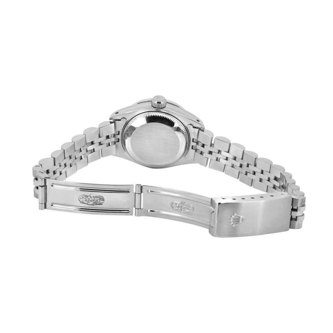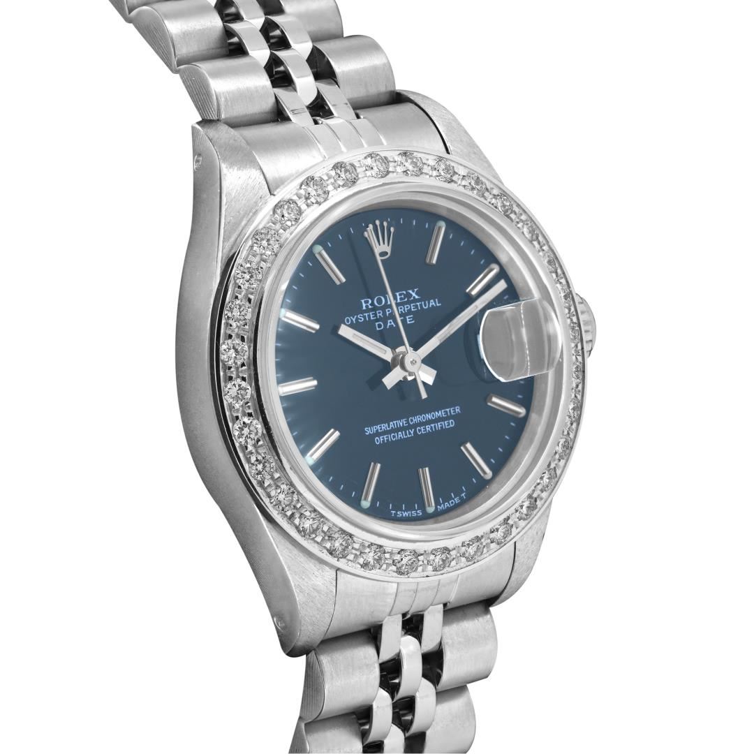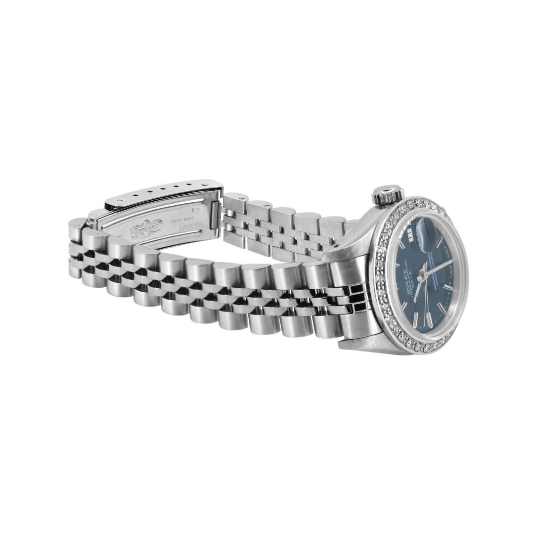 One Rolex Ladies Pre Owned Stainless Steel Date Wristwatch Polished Bright with Satin Finish, Serviced & Electronically Tested, Stainless Steel Case: 26mm, Stainless Steel Crown, Custom Bezel: New 18K White Gold Beadset Diamond Bezel, Diamond Count: 32 Diamonds. Custom Crystal: New Sapphire With Magnified Date Window. Custom Hands: New Luminescent Hands. Rolex Movement: 2135 Automatic Winding Movement. Rolex Dial: Factory Black With Index Hour Markers And Lumi Dots. Date Window: 3 O'clock Position Date Display, Model: Quickset Date. Condition: G-6 Extra Fine. Rolex Bracelet: Stainless Steel Jubilee Band. Bright Polish & Satin Finish. 6.0 Inch Length, Adjustable. Standard Clasp, With Rolex Logo. This Watch Has Been Serviced And Time Tested. It Is In Excellent Condition, Free Of All Scratches And Dents. This Watch Comes With A Rolex Box.