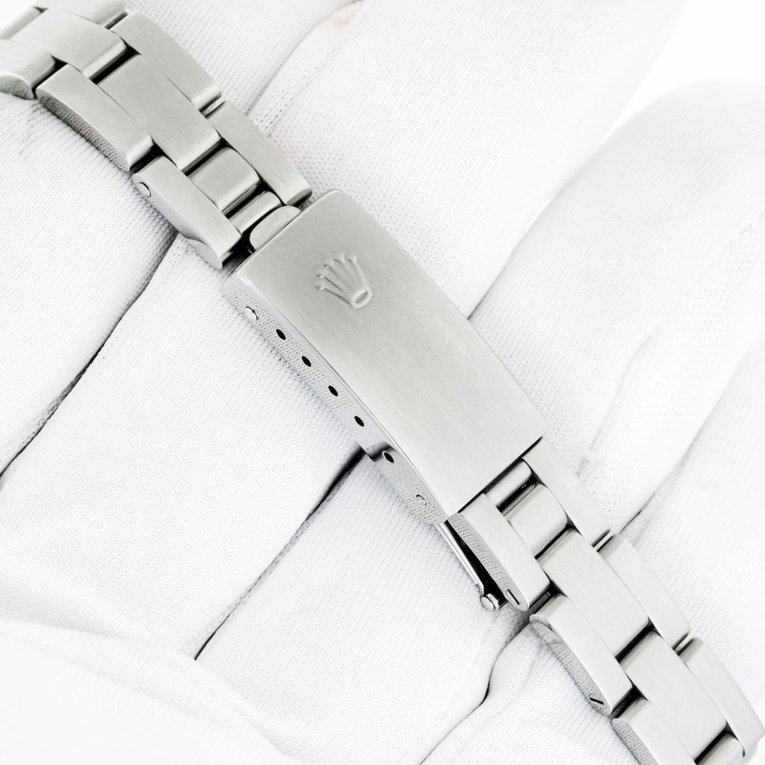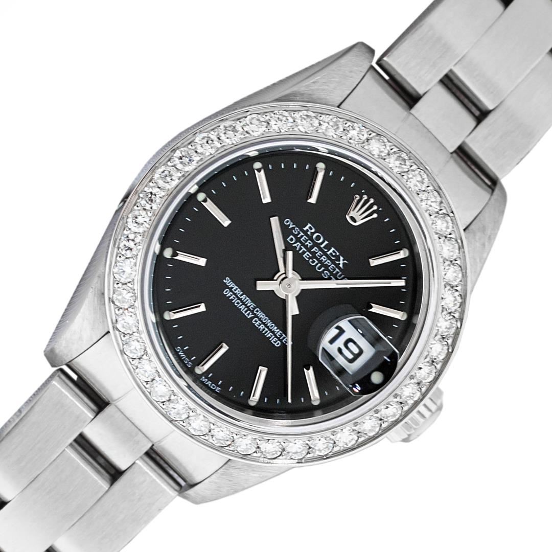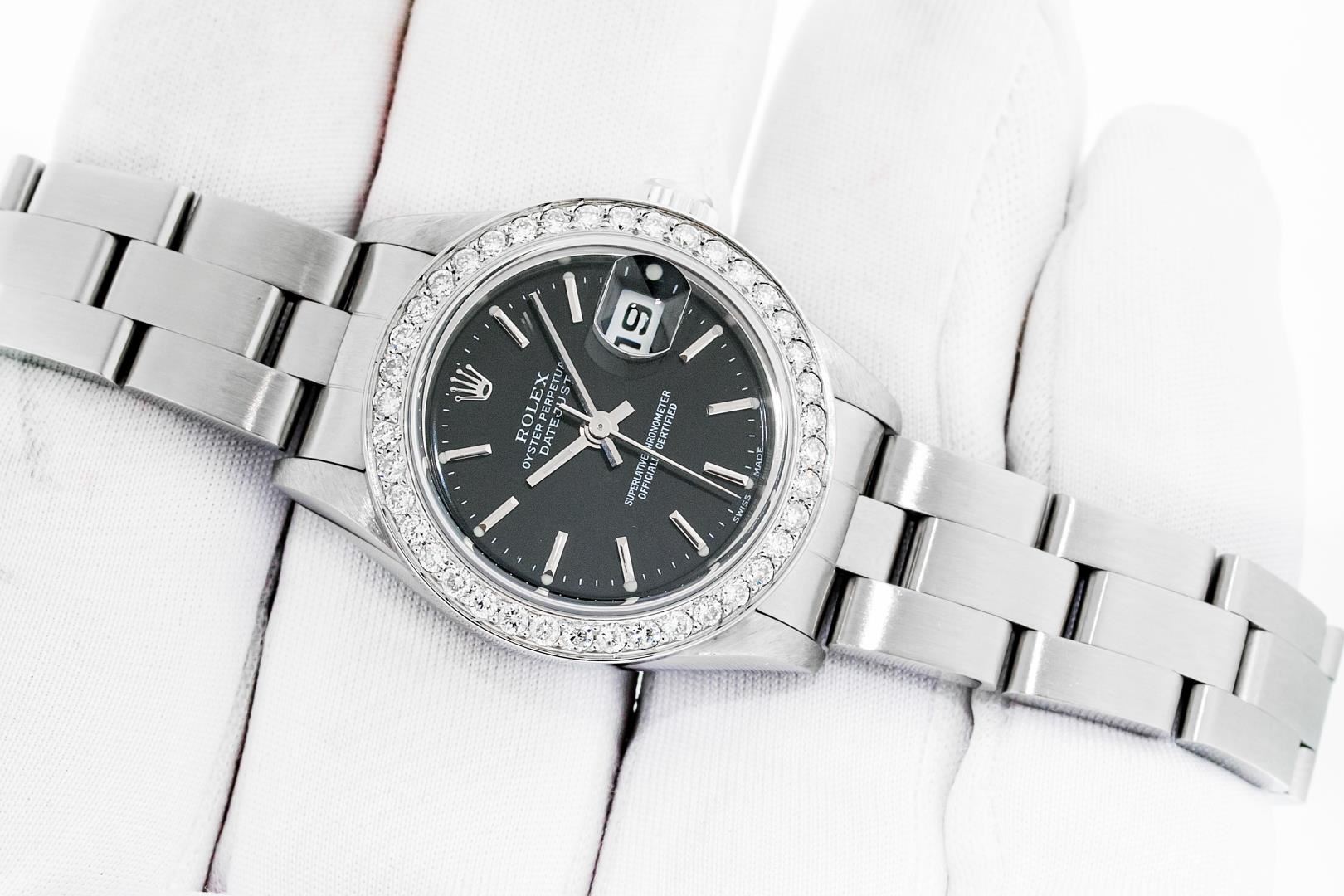One Ladies Pre Owned Quickset Stainless Steel Rolex Datejust Polished Bright with Satin Finish, Serviced & Electronically Tested, Stainless Steel Case: 26mm, Rolex Stainless Steel Crown, Custom Bezel: New Stainless Steel Bead Set Diamond Bezel, Diamond Count: 40 Diamonds, Clarity: SI-VS, Color: G to H. Custom Crystal: New Sapphire With Magnified Date Window. Custom Hands: New Luminescent Hands. Rolex Movement: Automatic Winding Movement 2235. Rolex Dial: Black With Index Hour Markers & Dash Track. Date Window: 3 O'Clock Position Date Display, Model: Quickset Datejust. Condition: G-6 Extra Fine. Rolex Bracelet: Stainless Steel Oyster Band. Bright Polish & Satin Finish. 6.0 Inch Length, Adjustable. Standard Clasp, With Rolex Logo. This Watch Has Been Serviced Time Tested And Is In Excellent Condition It Is Free Of All Scratches And Dents.
